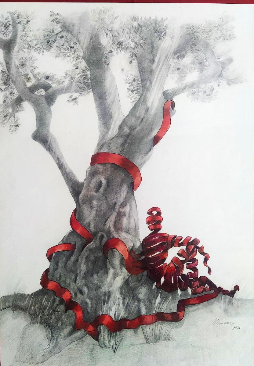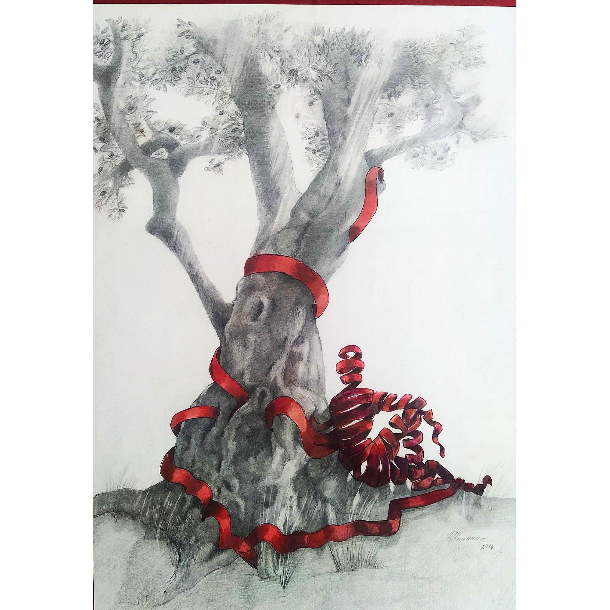 Sagoma di una donna creata da un nastro Rosso, che si annoda ad un albero a significare il netto legame fra l'essere umano e il mondo vegetale.