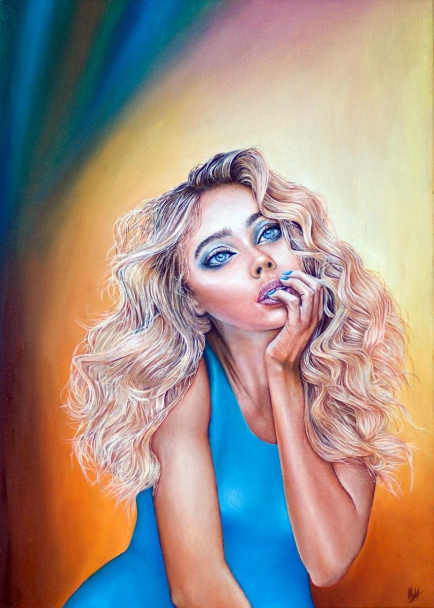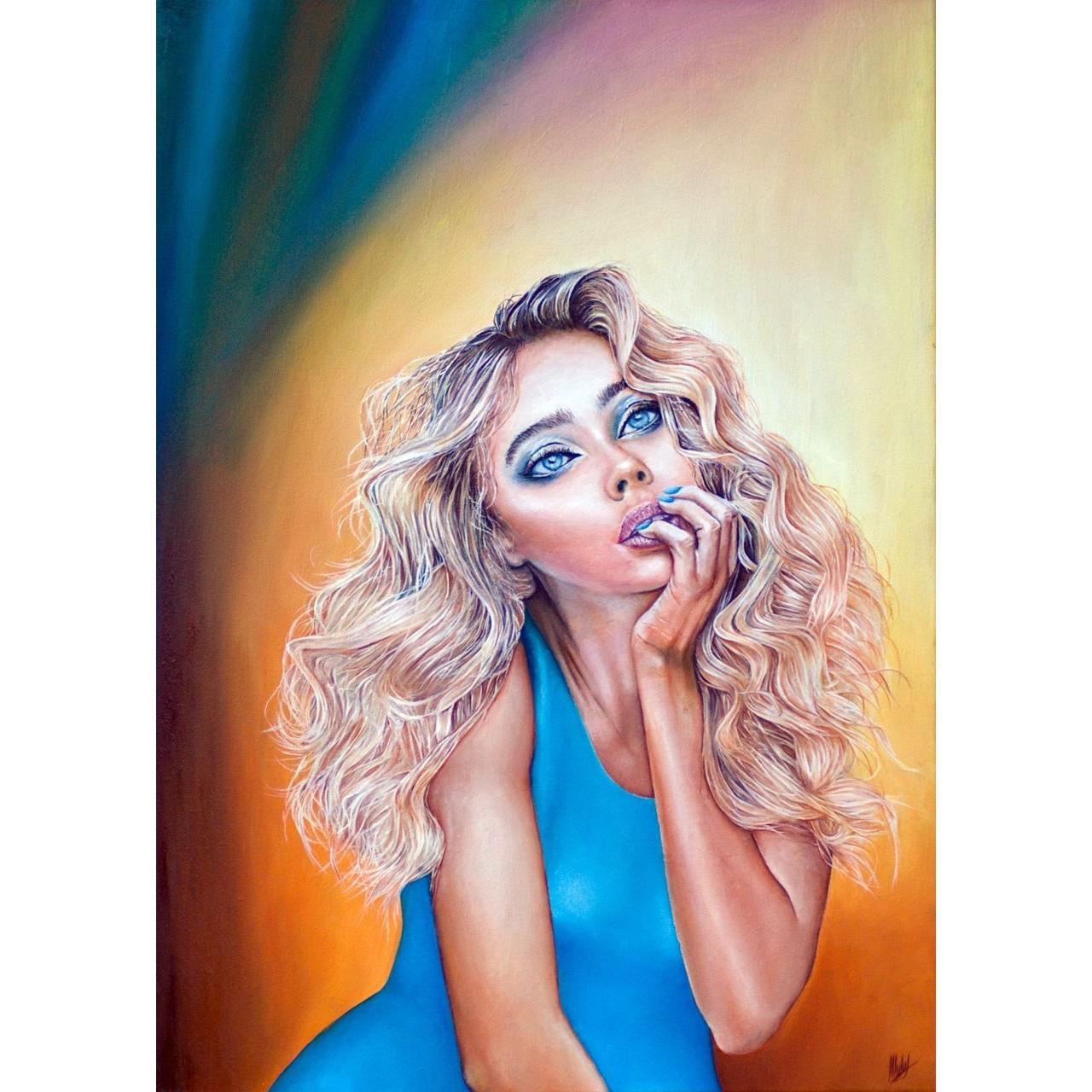“Nei suoi Pensieri” ritrae una donna immersa nei propri pensieri. I suoi occhi azzurri, intensi e profondi, invitano l’osservatore a entrare nel suo mondo interiore. I capelli biondi, morbidi e voluminosi, incorniciano il volto con delicatezza, creando un contrasto armonioso con lo sfondo vivace e colorato. La combinazione di luce, colore ed espressione dona al dipinto un’atmosfera intima e contemplativa, trasformando un semplice momento di riflessione in un’emozione universale.