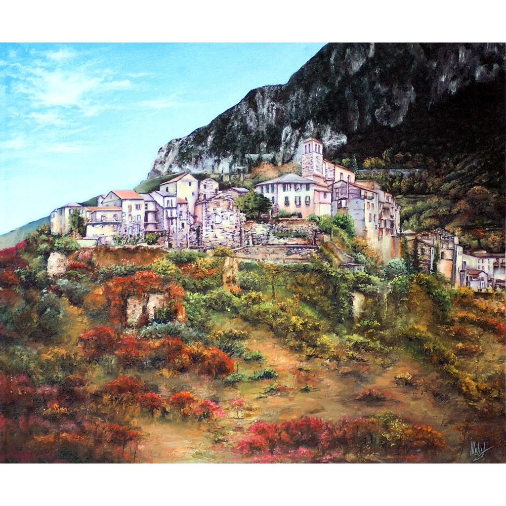 Mentre l'autunno stende il suo mantello regale, una sinfonia di colori vividi danza lungo il fianco della collina. Pennellate di rosso intenso e sfumature dorate, come fiamme silenti, si rincorrono sul paesaggio. In cima a questo arazzo cromatico, un antico villaggio veglia, custodito da rocce imponenti che si ergono come giganti silenziosi, a proteggere la quiete di un quadro dipinto dalla natura stessa.