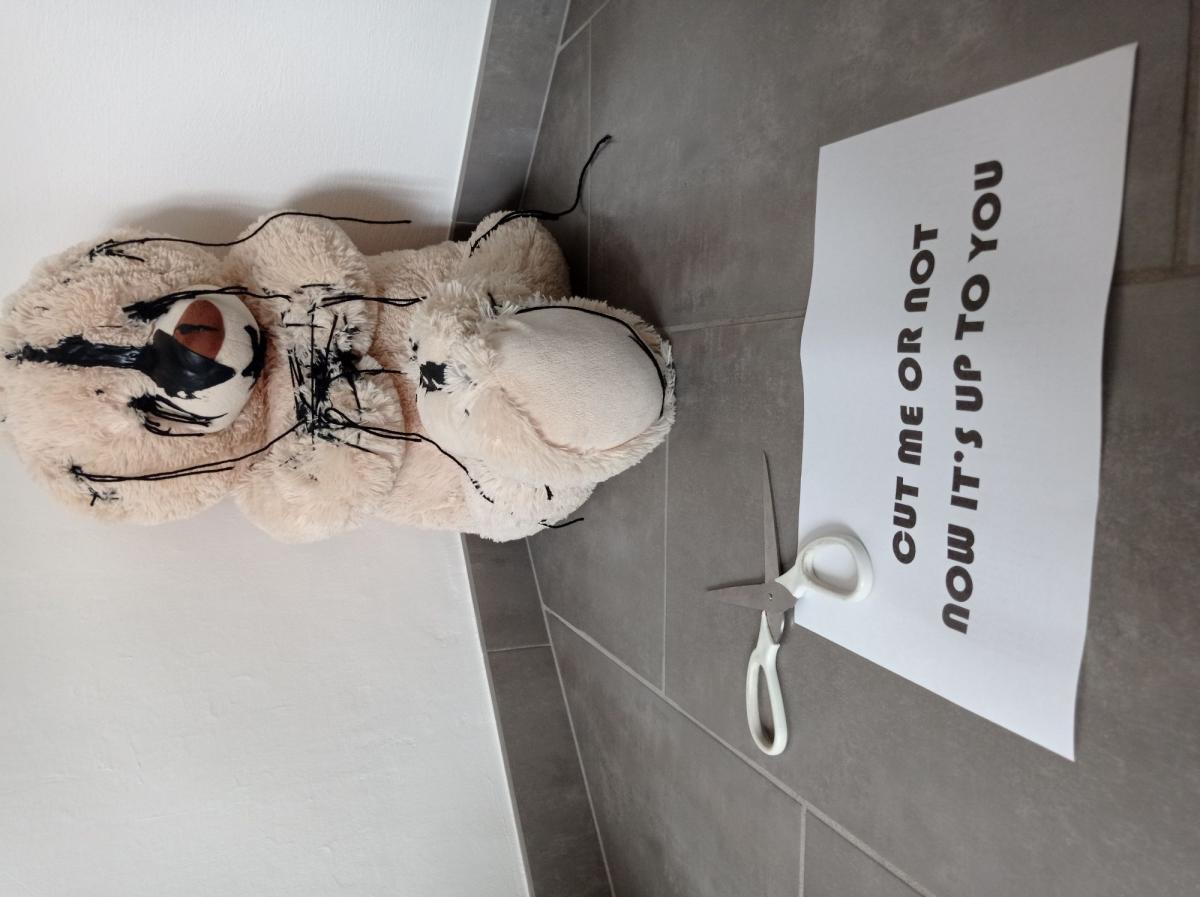 L'opera 'TEDDY' è una installazione libera interattiva con il pubblico e presenta una sfaccettatura del mondo moderno in cui le molteplici anime e modalità di relazione si compenetrano davanti a una situazione estrema in cui si è chiamati ad agire o a non agire. Viviamo fintamente in una società che si fregia di essere pacifista e comprensiva dell’altrui , termine sempre più usato a sproposito. La società odierna è violenta e scarsamente capace di richiedere il consenso. La sua violenza è esercitata in modi, metodi e modalità differenti rispetto ai secoli passati, subdoli ma costanti. Siamo bombardati non solo realmente ma anche metaforicamente da informazioni non richieste, da sensi di colpa che non sono nostri e da richieste soverchianti. La reazione naturale della maggioranza della popolazione è di negare tutto questo, di sorridere e girare il volto dall’altra parte sentendosi costantemente impunita e non parte della costante carneficina. La realtà è invece che siamo tutti incapaci di vestire i panni dell’altr* da sè e incapaci di guardare come anche noi nel nostro piccolo siamo parte di questa struttura. TEDDY è per tutt* identificativo dell’innocenza e della genuinità; trovarlo legato, mutilato e sporco può portare l* spettatore a diverse reazioni che vanno dalla compassione più dolce alla rabbia più estrema. La realtà è che TEDDY siamo noi ma siamo anche i suoi spettatori. La domanda è quindi: ‘ E se per una volta ci soffermassimo sulle motivazioni per cui TEDDY è li? E se fossimo noi TEDDY? E se fossimo noi i suoi PASSANTI ? Cosa faremmo ? ‘ Ed ecco che improvvisamente gli scenari si aprono davanti a noi. TEDDY potrebbe essere sempre stato così e potrebbe provare appagatezza in questo suo stato attuale. TEDDY potrebbe aver scelto di vivere così per smettere di soffrire, per smettere di essere bombardato dalle notizie del mondo esterno, per giustificare in un certo qual modo la sensazione di impotenza davanti all’autodistruzione compiuta dall’umanità verso se stessa. In ultimo TEDDY potrebbe essere davvero una vittima e non aver trovato nessuno a salvarlo o aiutarlo. La normalità è istituita dalla maggioranza, ma essere nella maggioranza spesso non è sintomo di benessere soggettivo e non prevede la richiesta di consenso implicito o ancora non accoglie la visione diversa del proprio punto di vista; solo la democrazia è capace di una comprensione tale. L* spettatore è chiamato a scegliere o a non scegliere comprendendo quindi che il non fare è esso stesso azione. Le forbici possono tagliare i fili con cui TEDDY è legato oppure l* spettatore può decidere di mantenere la situazione così come si presenta. La comprensione dell’opera può essere riassunta bene con la frase del libro Survivor di Chuck Palahniuk :