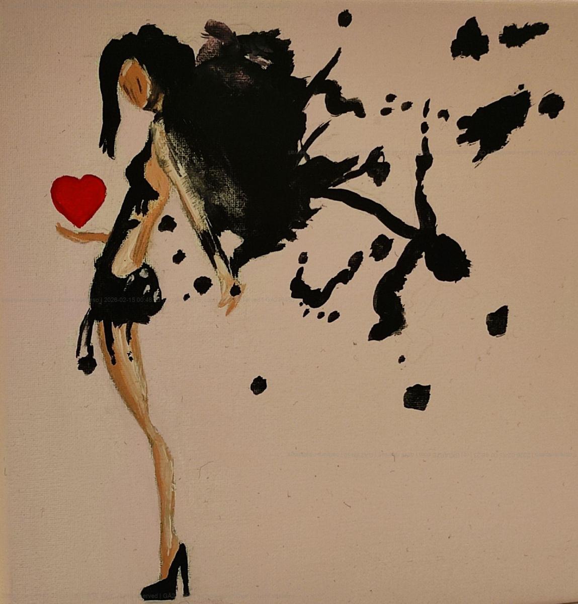 Un cuore rosso illumina l’ombra. L’arte è emozione che prende forma, tra leggerezza e intensità.