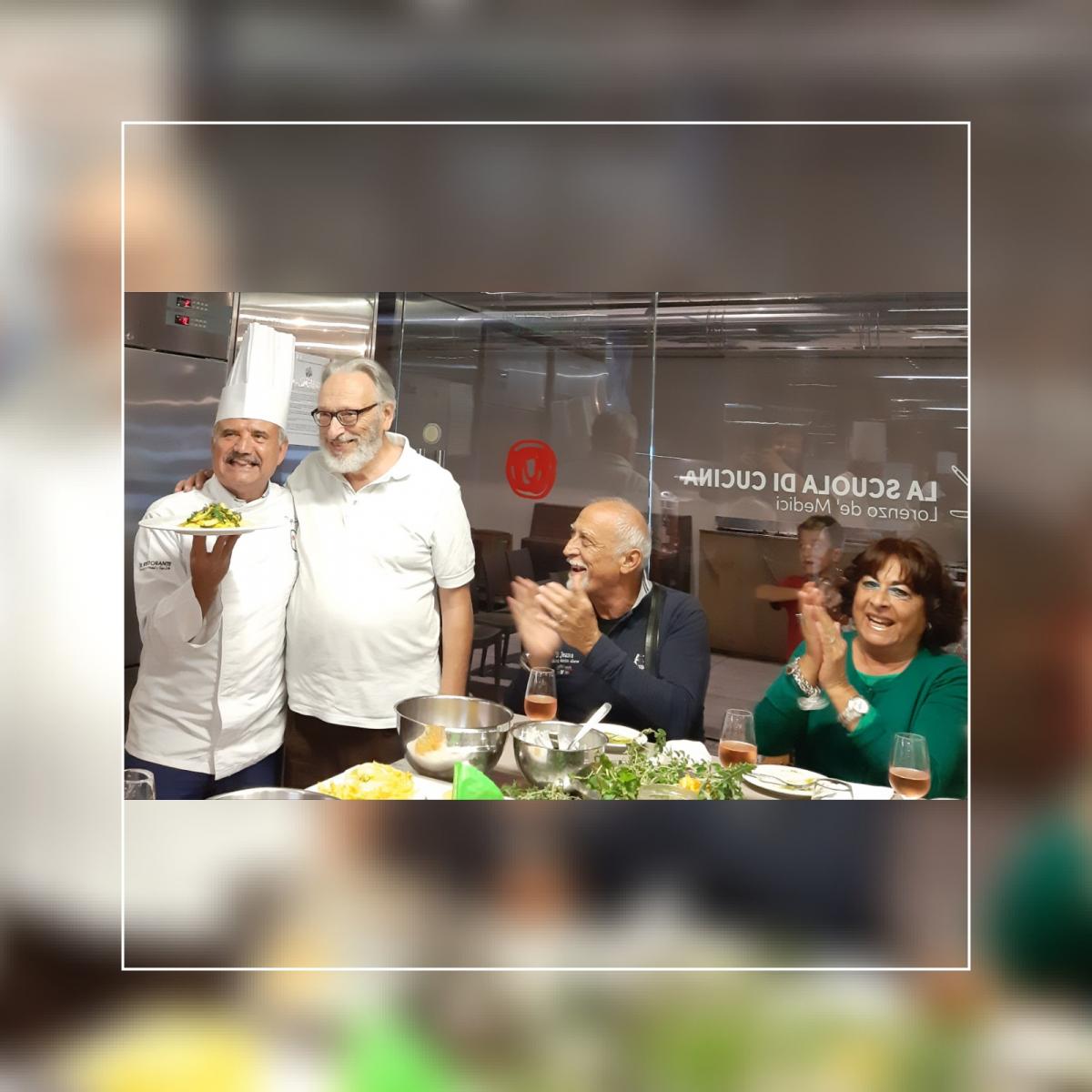 PRESENTAZIONE LIBRO "A TAVOLA CON LEONARDO" di Guido Stecchi (Presidente dell’Accademia delle 5T) e COOKING SHOW con la Scuola di Cucina Lorenzo de' Medici, il Ristorante Tosca di Michele Zullo e lo Chef Peppe Zullo al Mercato Centrale di Firenze - “A tavola con Leonardo”. Per non dimenticare il genio da Vinci, tra racconti e leggende, sapori e profumi italiani. Originale e divertente il duplice evento tenutosi presso il Mercato Centrale di Firenze. Il connubio cultura e cibo come motore della manifestazione ha visto protagonisti Guido Stecchi e Peppe Zullo alla guida della macchina del tempo tra passato e presente. La presentazione del libro prima e lo showcooking poi, nella calda ed accogliente Cucina di Lorenzo de’ Medici ha unito tutti i presenti in un unico anelito di soddisfazione, condividere esperienze degustando la ricetta dei ravioli dolci con zucca, ricotta e salsa di cardoncelli, preparata in collaborazione con il ristorante Tosca, presente all’interno della struttura stessa, dove il figlio Michele porta avanti le buone tradizioni di famiglia. Particolarmente attratta dall’accento che dà alla figura di Leonardo il libro scritto dal Presidente dell’Accademia delle 5T, Guido Stecchi, all’interno del quale, vengono svelate, non solo curiosità inedite della sua persona come cerimoniere di corte, ma anche dalla semplicità con cui vengono organizzati e descritti i contenuti all’interno del volume. Si legge tra le righe la naturalezza di espressione nelle scelte dei locali e delle ricette ivi preparate, guidate da un filo conduttore avente a capo l’onnipresente soggetto principale da omaggiare ancora a distanza di 500 anni dalla sua morte. Tra le tante, la scelta del Ristorante del famoso cuoco italiano, Peppe Zullo e della ricetta sopra esposta da lui preparata, ben rappresenta il personalissimo slogan globale: “simple food for intelligent people”. Prodotti genuini e freschi, passione per la cucina e gusto nella selezione degli ingredienti, fanno del piatto finale un delizioso risultato da assaporare anche ad occhi chiusi, associato ad un buon bicchiere di vino rosé selezionato accuratamente per l’occorrenza.