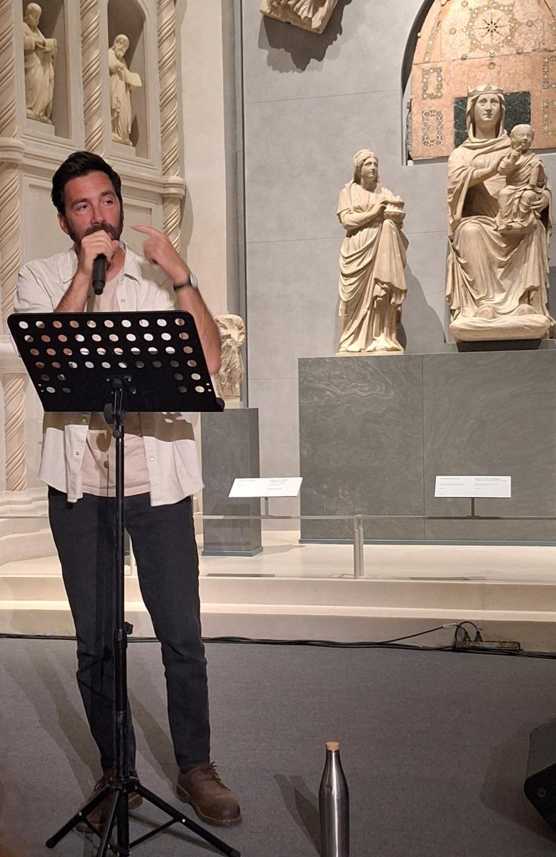 SPETTACOLO NON ESISTE UN POSTO AL MONDO di e con MAURIZIO CARUCCI nella del Paradiso del Museo dell'Opera del Duomo - Una serata particolare nella Sala del Paradiso del Museo dell’Opera del Duomo per lo spettacolo di Maurizio Carucci. Lo incontro all’ingresso, non lo riconosco, lo ammiro da seduta, in seconda fila, è notevole. Una bellissima voce, che parla intonata dando enfasi e passione al racconto, le parole scorrono e si alternano alla musica. Il reading lo conosce bene, “Non esiste un posto al mondo” è tratto dall’omonimo libro ed i testi che intona profondamente, mi piacciono e fanno parte del repertorio degli Ex Otago. Mi ripropongo di approfondire, è interessante, come artista, cantautore, viaggiatore ebbene si, anche come agricoltore. Leggo che: fonda un collettivo agricolo/culturale chiamato Cascina Barbàn che oltre alla produzione di vino naturale da vecchie varietà della Val Borbera abbandonate e ‘salvate’ da lui stesso, coltiva ortaggi, cereali, legumi sempre prediligendo la biodiversità locale. Il quotidiano si presenta in tutta la sua semplicità e con delicatezza cattura l’attenzione, la mia sicuramente, lasciando curiosità e vivacità di pensiero alla fine dell’esibizione.