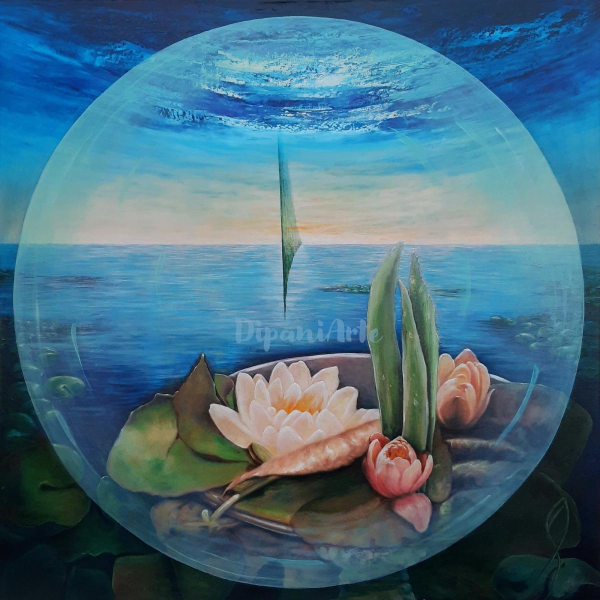 Quest'opera di Basilio Dipani presenta una composizione suggestiva, dove una sfera trasparente racchiude una marina placida. All'interno, un orizzonte sereno divide un cielo luminoso da acque calme, mentre in primo piano galleggiano ninfee dai petali candidi e boccioli rosati, circondate da foglie verdi e steli allungati. All'esterno della sfera, l'ambiente marino si fa più profondo e dinamico, con tonalità di blu intenso e texture mosse che contrastano con la quiete racchiusa. La pittura cattura un momento di pacata bellezza, enfatizzando il contrasto tra due mondi acquatici.