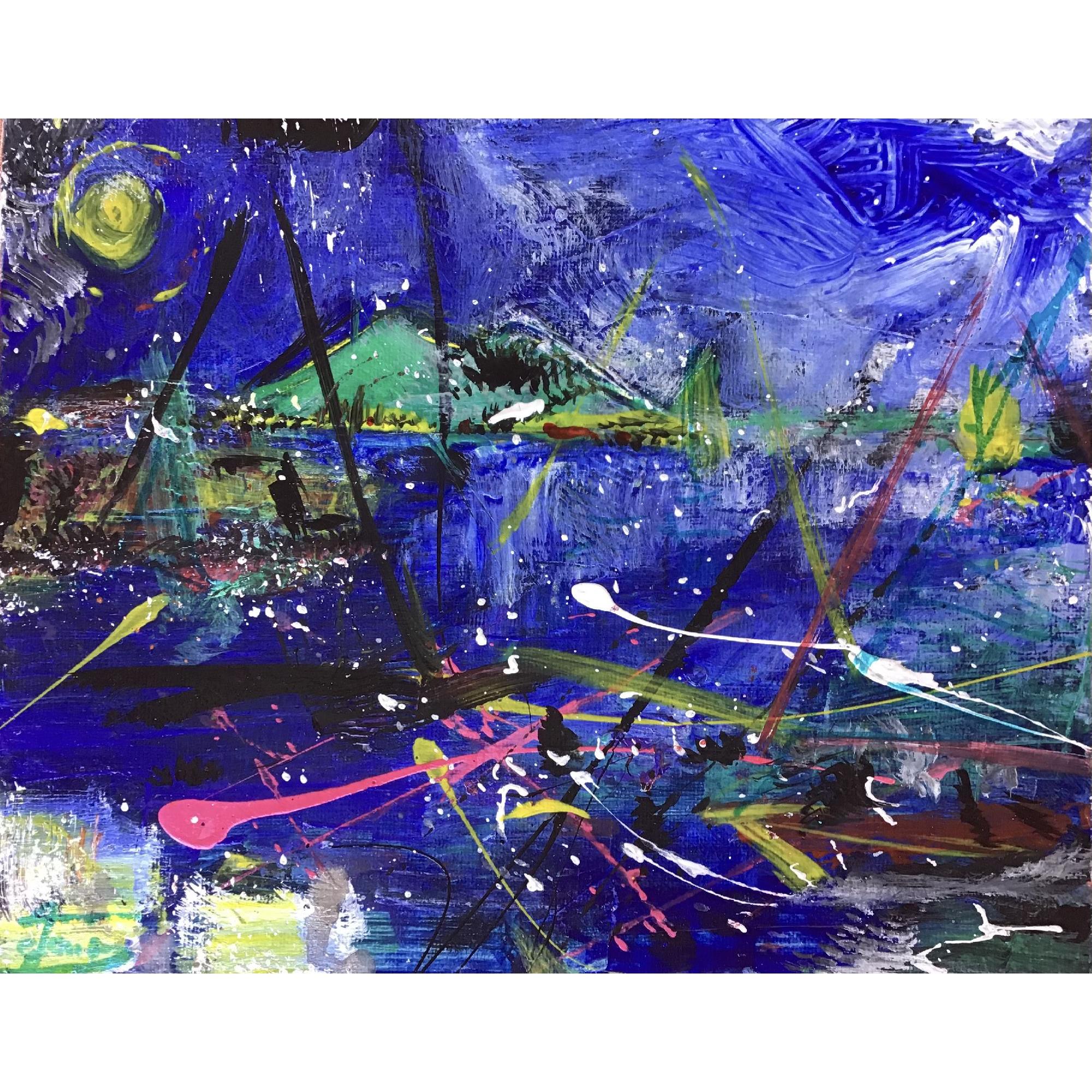 Opera ispirata a Mario Schifano. Predominanza di blu oltremare e dripping colorato