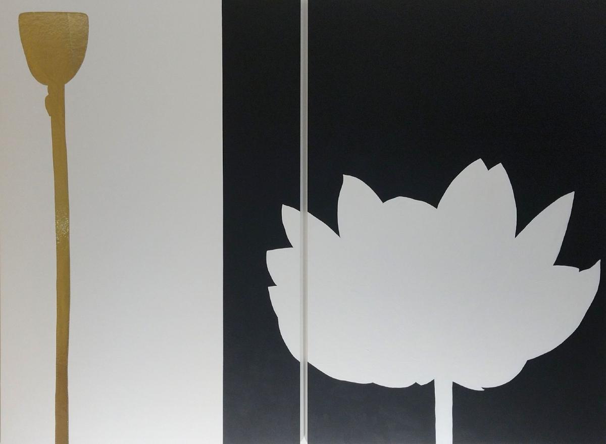 L'opera si presenta come un dittico che esplora il contrasto cromatico e simbolico attraverso l'uso essenziale del bianco, del nero e dell'oro. La composizione è rigorosa e minimalista, ma al contempo potente nella sua simbologia. Sul pannello di sinistra, la forma dorata, allungata e stilizzata, evoca un elemento naturale, uno stelo di fior di loto senza petali, reso sacro dalla matericità brillante della lamina e dei chiodi d’ottone. Il bianco circostante esalta il senso di purezza e spiritualità, suggerendo un'ascensione o una connessione verso una dimensione trascendente. Sul pannello di destra, il nero dominante racchiude una forma bianca stilizzata che rappresenta il fiore di loto nel suo massimo splendore. Questo elemento emerge dal contrasto con lo sfondo scuro, rappresentando una rinascita, una dualità tra luce e oscurità, il grande potenziale nascosto di una forma ancora in divenire. L'accostamento di questi due pannelli crea un dialogo visivo tra il sacro (l'oro) e il naturale (la forma floreale), tra la purezza (bianco) e la profondità (nero). L'oro si pone come elemento di connessione e trascendenza, un simbolo che attraversa il tempo e la materia per richiamare un senso di eternità. L'opera riflette sul tema della dualità e dell'interconnessione, invitando a meditare sulla fragilità e le forze intrinseche della natura e della spiritualità. È un’esortazione a cercare significati più profondi in una composizione visivamente semplice, ma emotivamente stratificata.