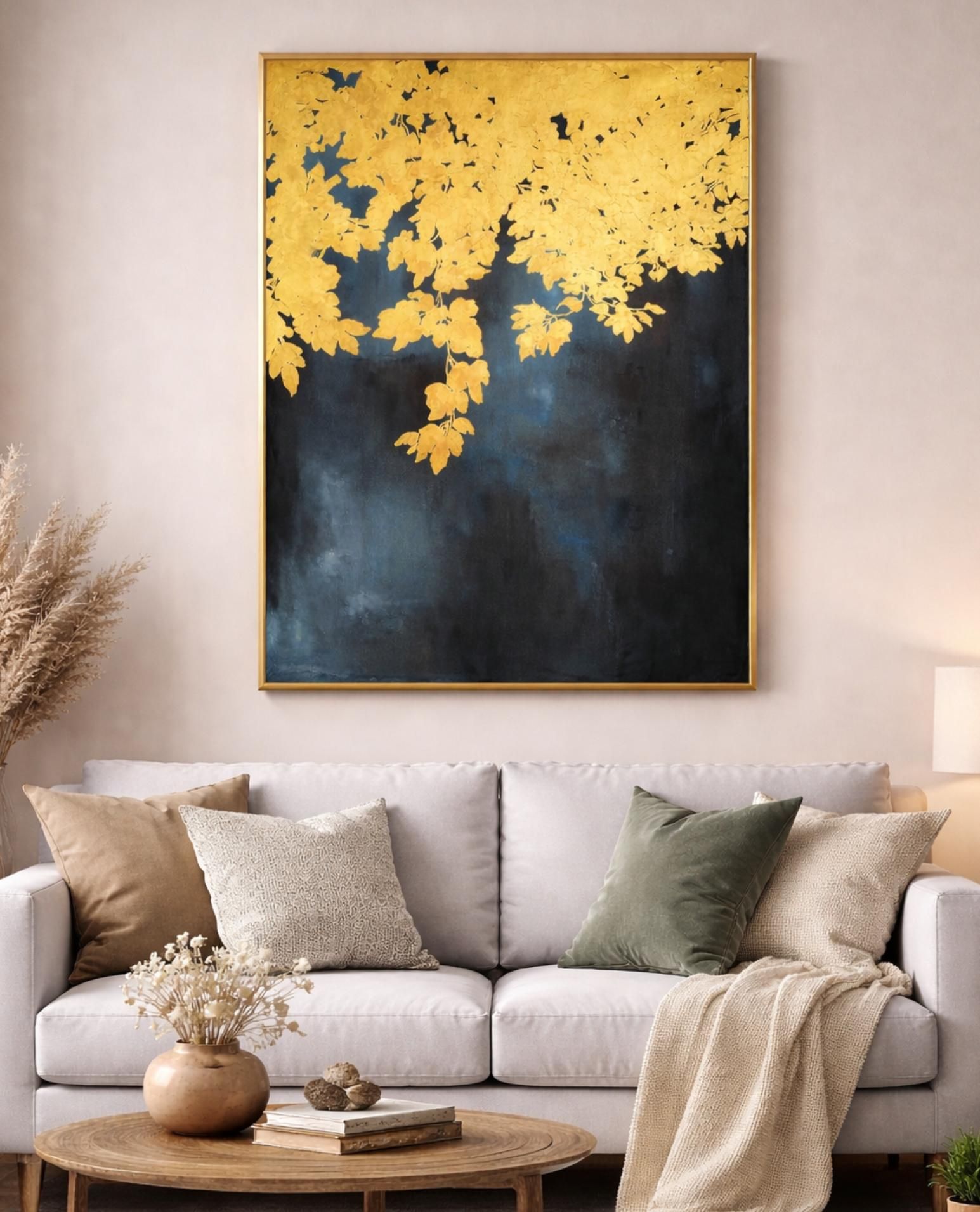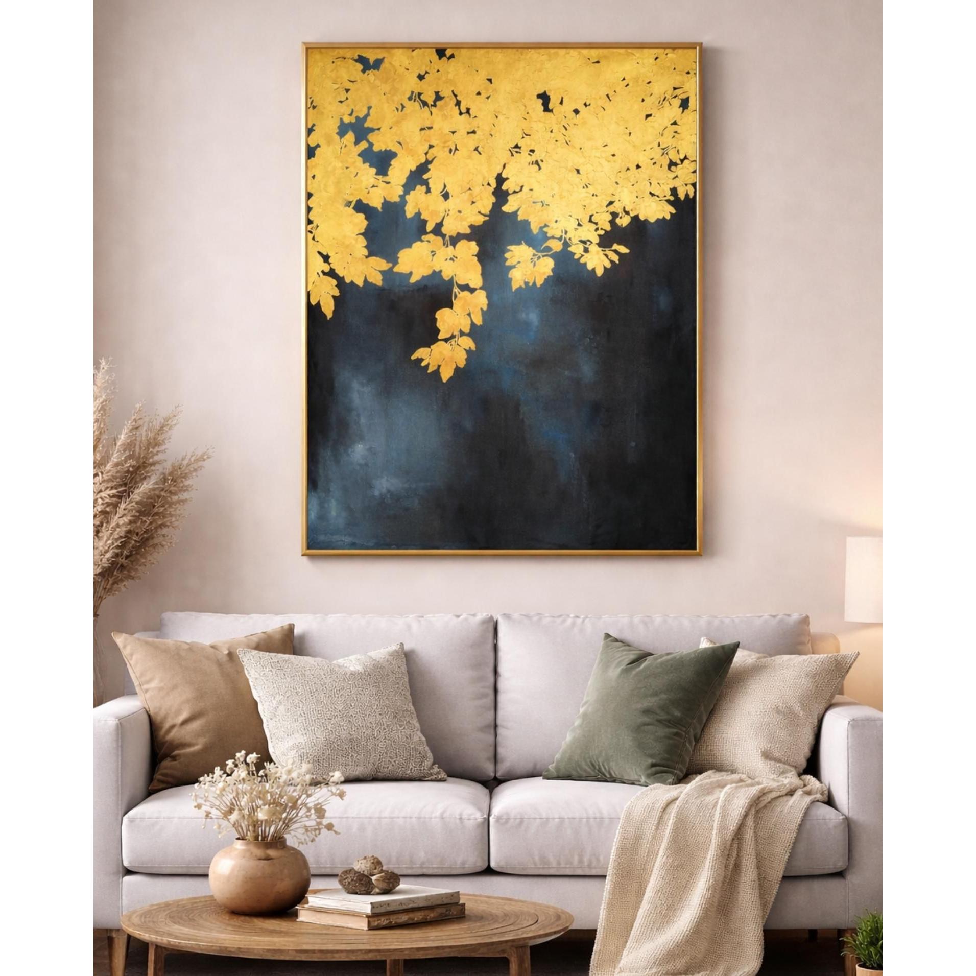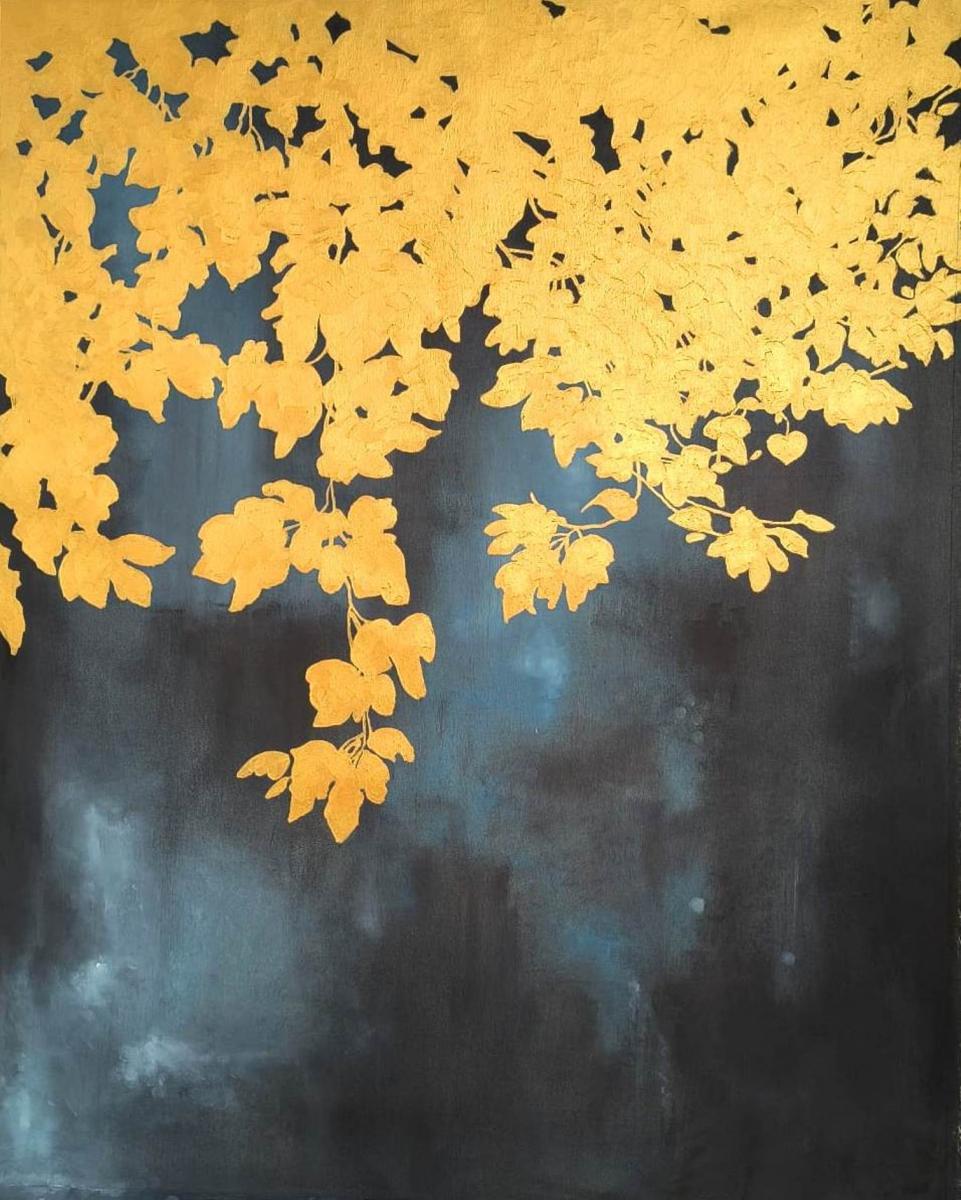 Un intreccio di foglie dorate scende delicatamente dall’alto come illuminato da una luce calda e silenziosa. Il fondo scuro, con profonde sfumature di blu e nero, crea un forte contrasto che esalta la luminosità dell’oro e dona all’opera un’atmosfera elegante e contemplativa.