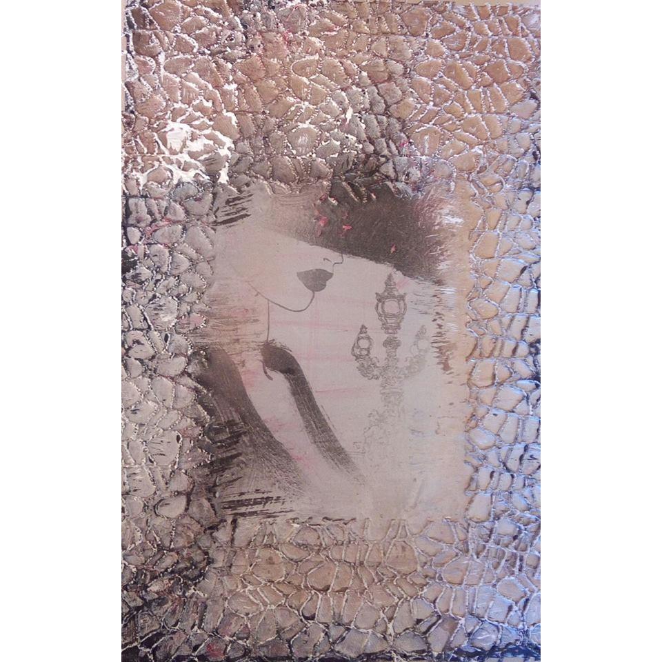 Titolo opera "MISTERIOSA" eseguita con colori acrilici su supporto in tela con applicazioni in carta.