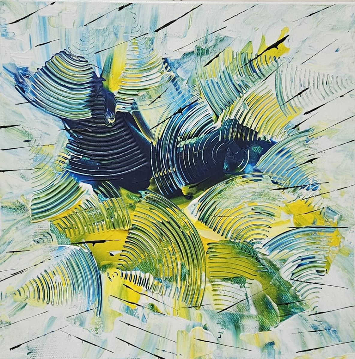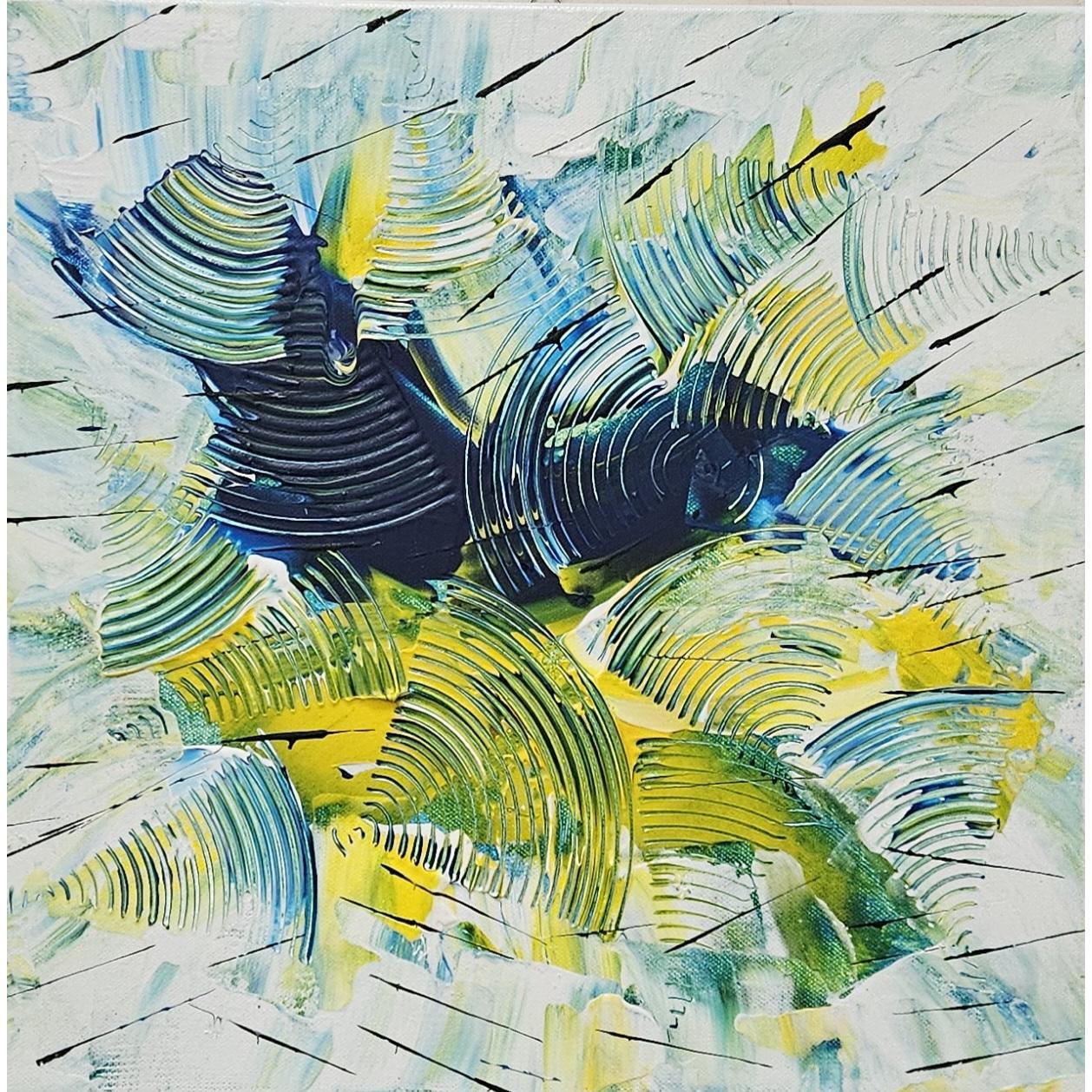Un intreccio dinamico di forme curve e stratificate attraversa la tela, evocando onde in movimento o tracce lasciate dal tempo. Le tonalità di blu, verde e giallo si fondono creando un equilibrio tra energia e armonia, mentre le linee nere spezzate introducono ritmo e tensione. L’opera suggerisce un dialogo tra ordine e caos, come se emozioni e ricordi emergessero e si sovrapponessero in un flusso continuo.