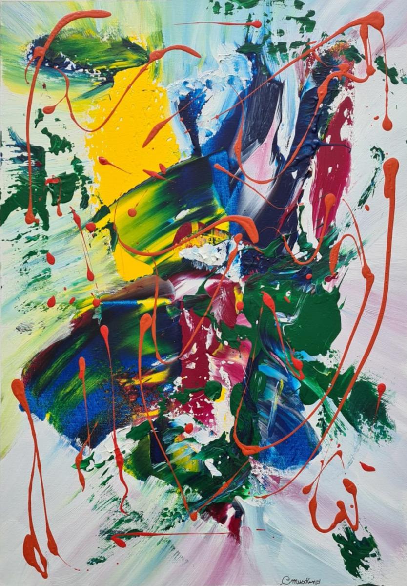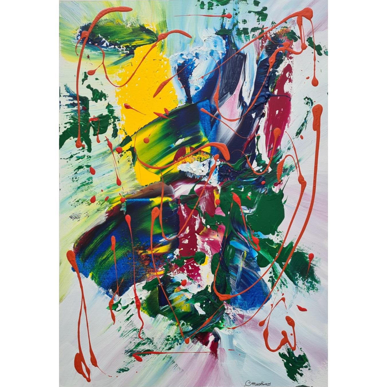 Un intreccio dinamico di pennellate energiche e schizzi di colore crea una composizione astratta intensa, dove tonalità vivaci e contrasti marcati trasmettono movimento, spontaneità ed emozione pura.