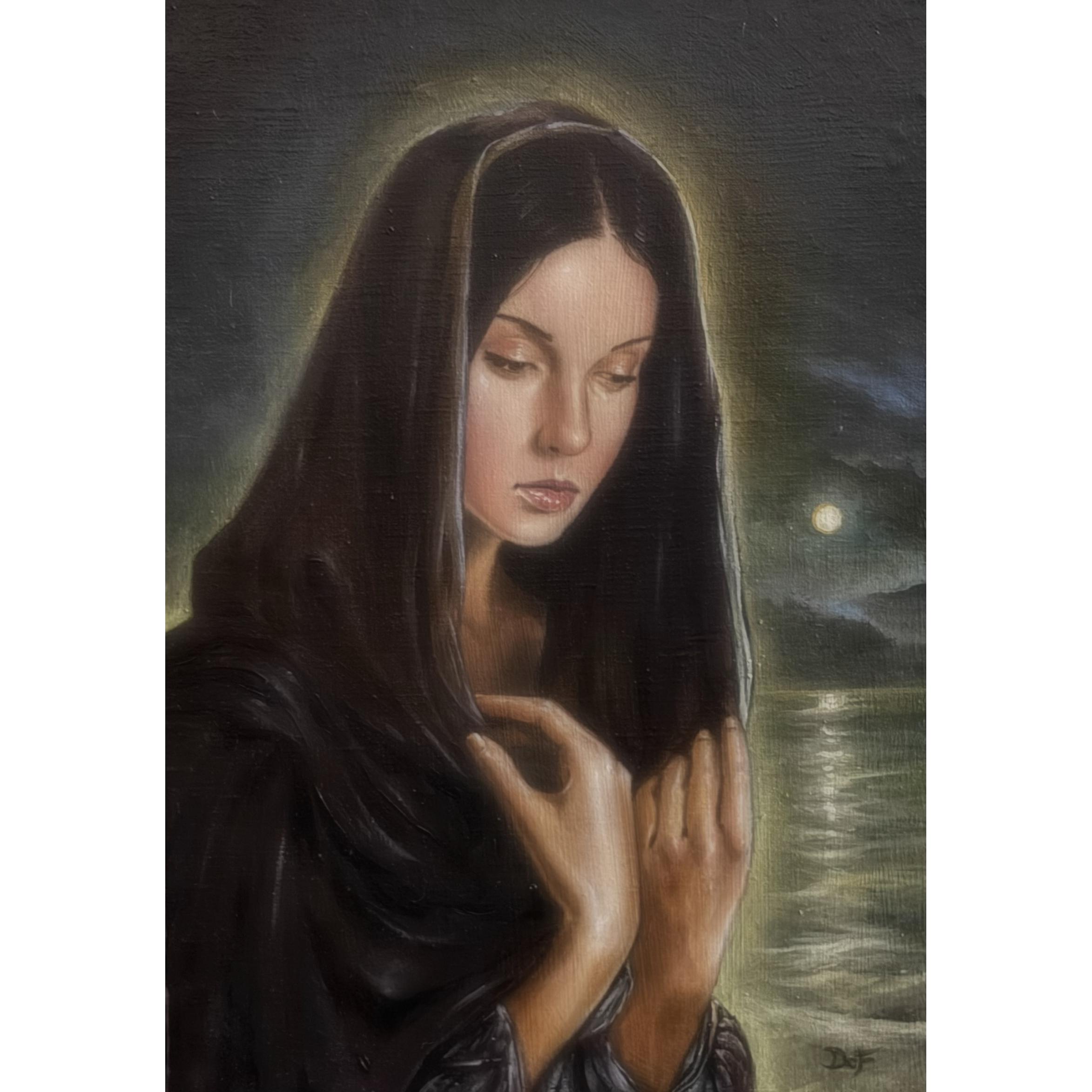 Persefone è raffigurata come figura sospesa tra luce e ombra, vita e aldilà. Il volto assorto e lo sguardo rivolto verso l’interno evocano il mito del passaggio, della rinascita ciclica e del legame tra mondo terreno e mondo invisibile. La luce lunare sullo sfondo e il gesto delicato delle mani accentuano una dimensione intima e sacrale, dove femminilità, silenzio e mistero si fondono in una visione poetica e senza tempo.