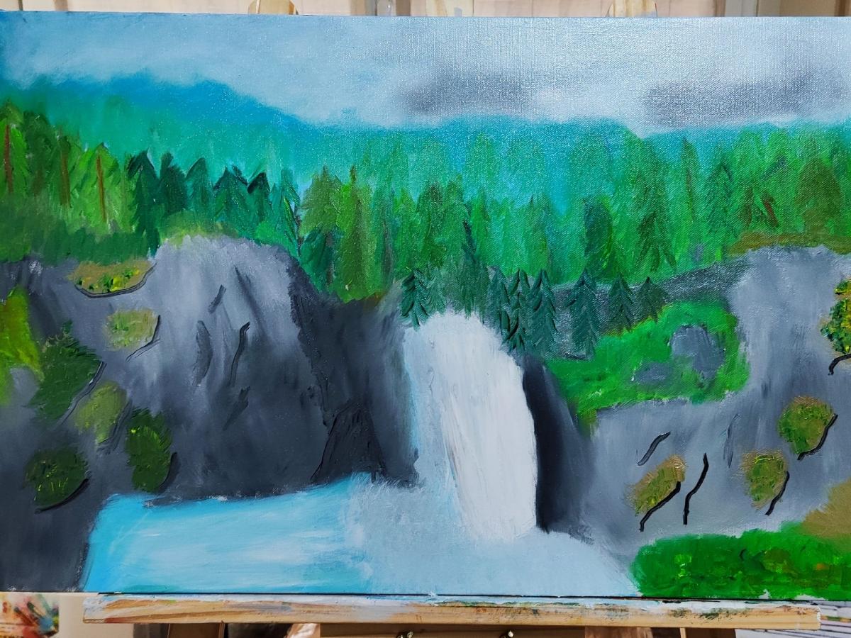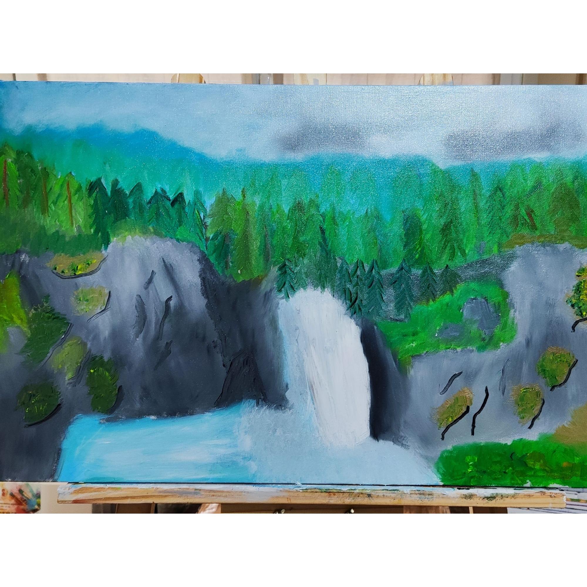Questo dipinto dai colori verde gtigio bianco e azzuro, rapresnta un bosco candese con una cascata d'acqua biancoe e azzura che scorre tra le roccie, con un cielo nuvoloso