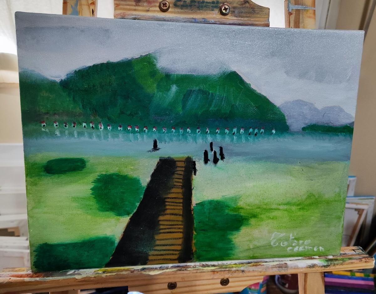 Il dipinto rappresenta una marina uggiosa, questo mi aveva colpita molto, dove o deciso di riprodurla con il metodo classico della pittura ad olio, ho voluto fare delle lavorazioni particolari al mare per dargli un certo tipo di trasparenza al fondale con dei medium specifici