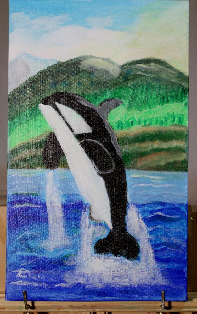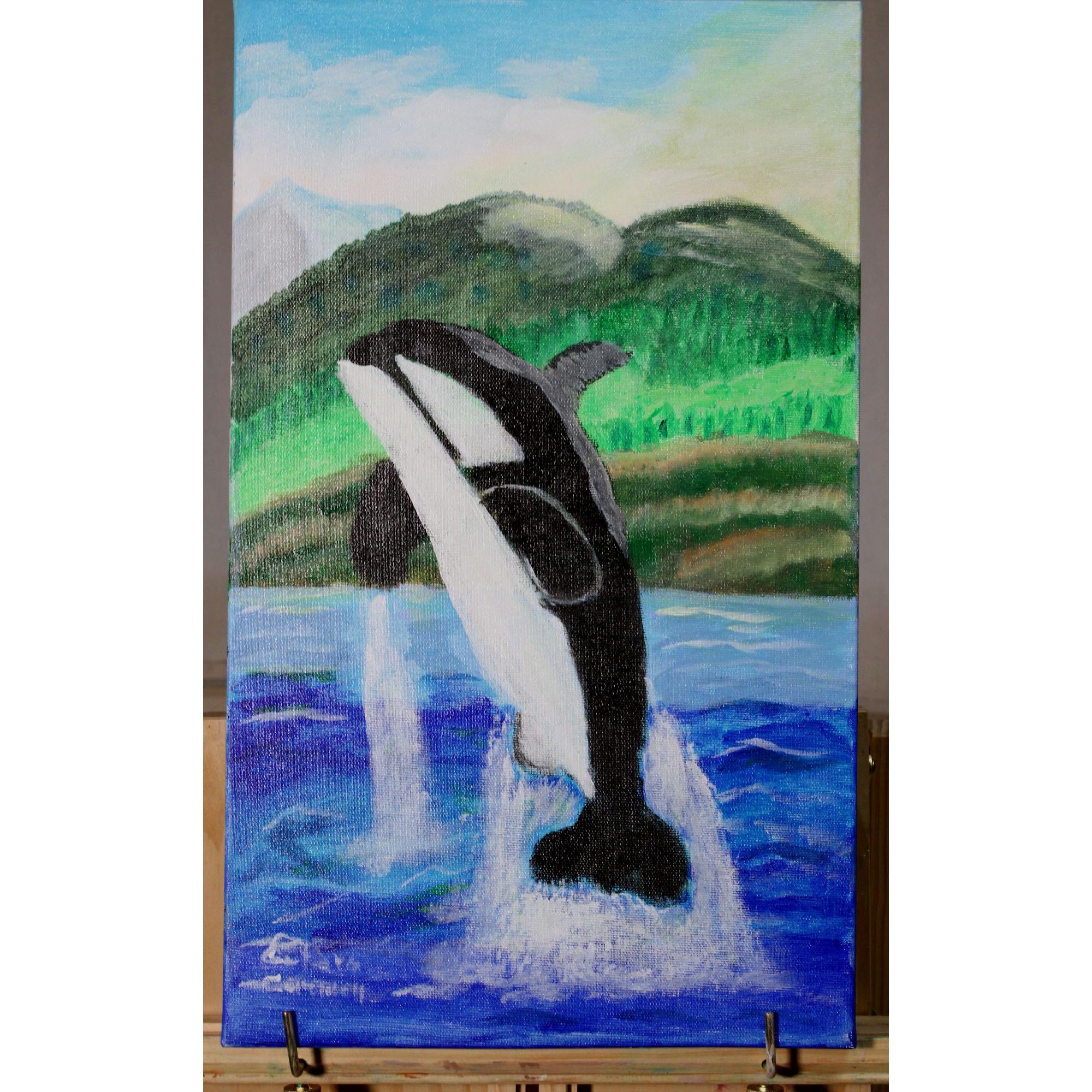 il quadro in acrilico rappresenta un'orca che gioca saltando fuori dall'acqua, il dipinto è molto bello dona gioaia