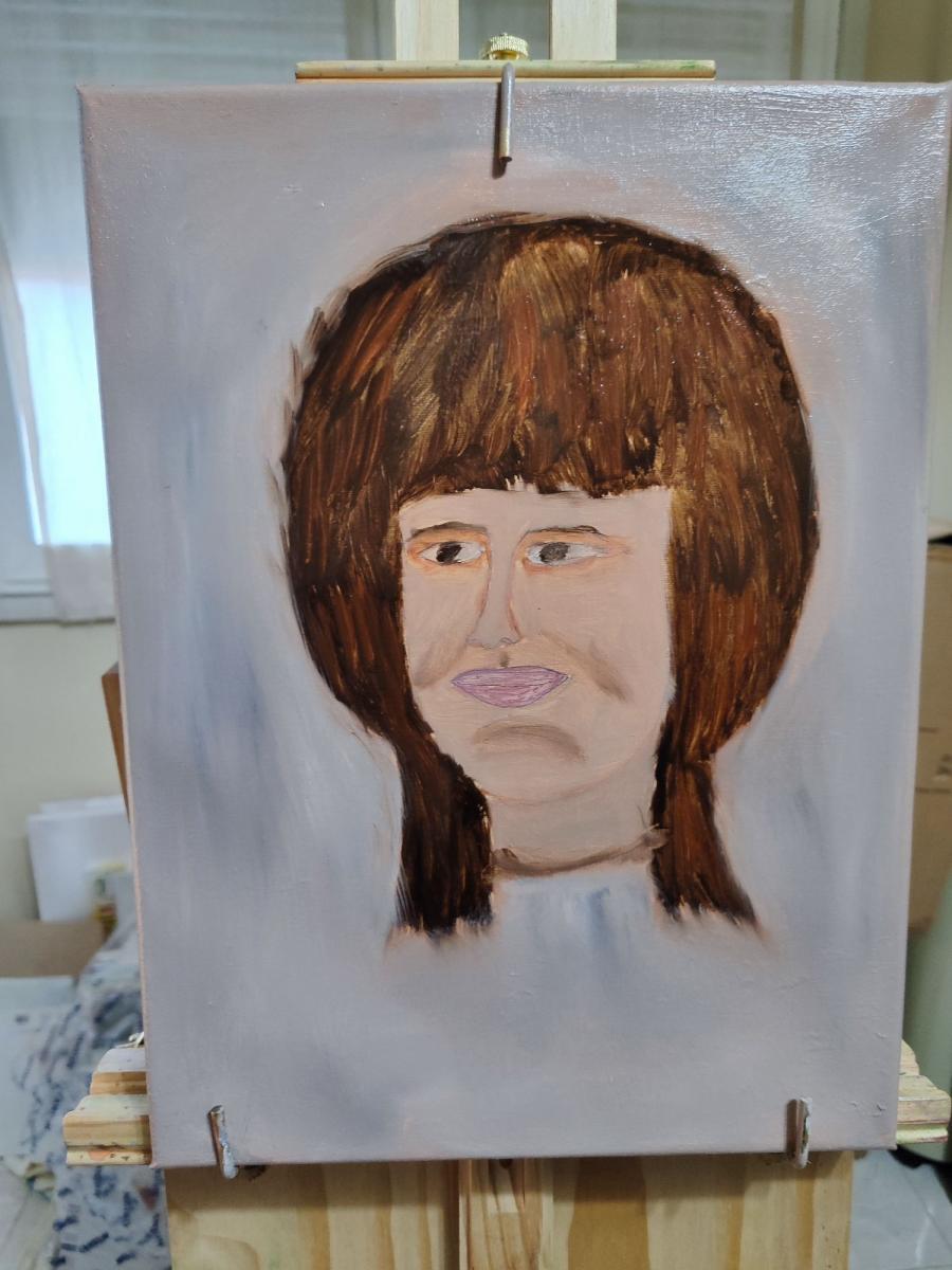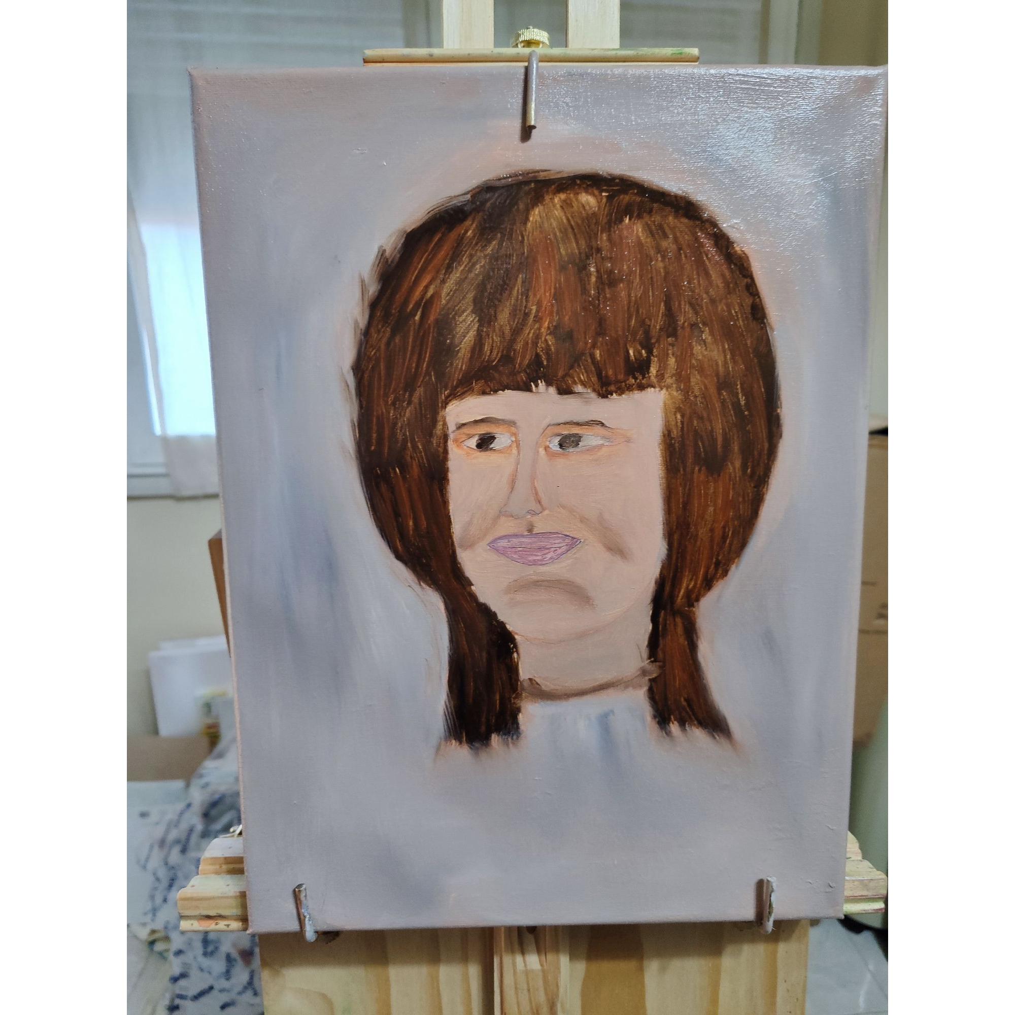 Il dipinto nasce il giorno di natale, sono sola, prendo una tela e traccio dapprima le linee per un viso di scorcio, poi la rifinisco a mano fino a firmare quel viso femminile, e dando le varie forme ecc, poi passo alla pittura, nasce in monocolore marrone ma non mi piace lo sfondo che viene cambiato infine applico quello che mi ha insegnato la prof. Di artistica il viso non deve essere realistico ma artistico.