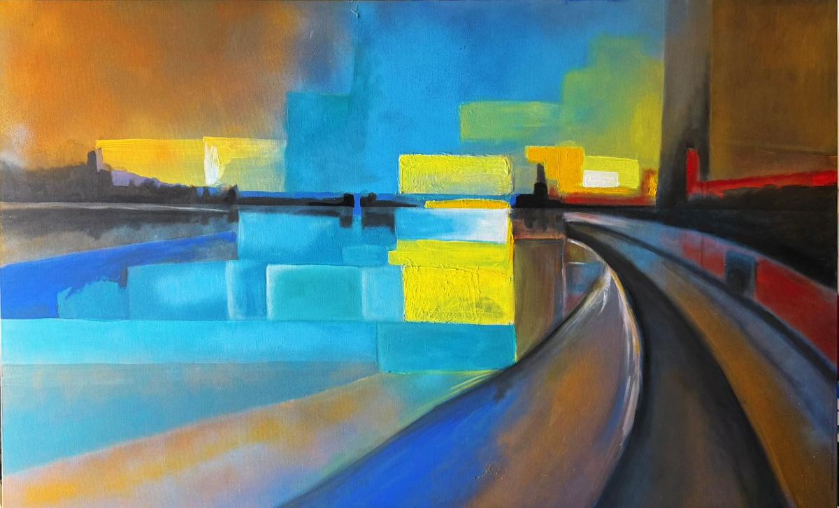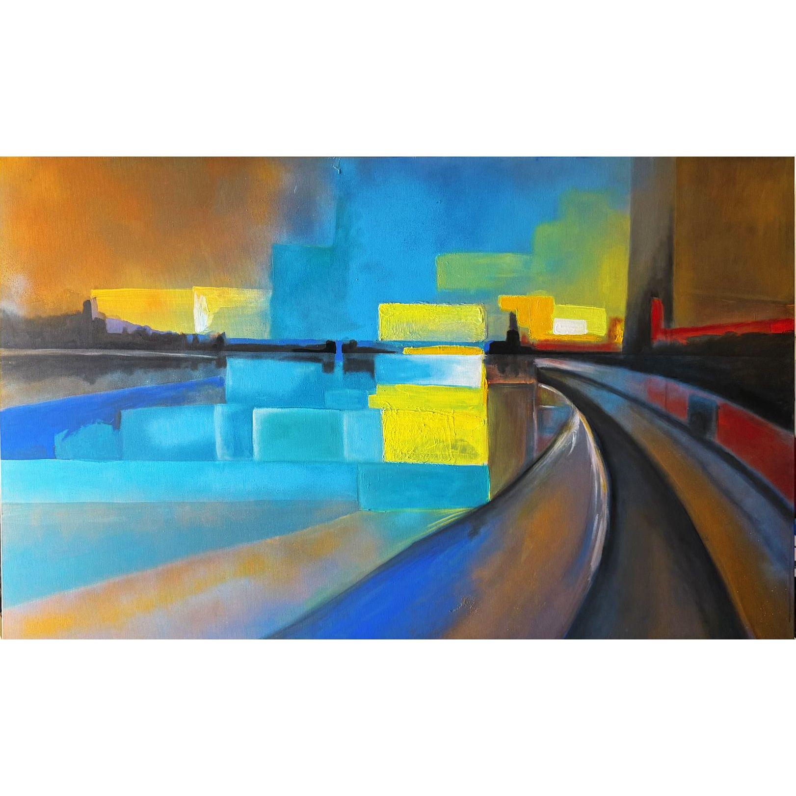 Quest’opera presenta una composizione astratto-geometrica in cui prevalgono tonalità fredde di blu e turchese, contrastate da accesi gialli e aranci caldi. Le forme rettangolari e i volumi sovrapposti evocano un paesaggio urbano o industriale al tramonto, in cui la luce sembra riflettersi su superfici architettoniche e stradali. La curva scura in primo piano guida lo sguardo verso il centro, suggerendo profondità e movimento. Il contrasto cromatico e la fusione tra astratto e figurativo creano un’atmosfera sospesa, tra realtà e visione.