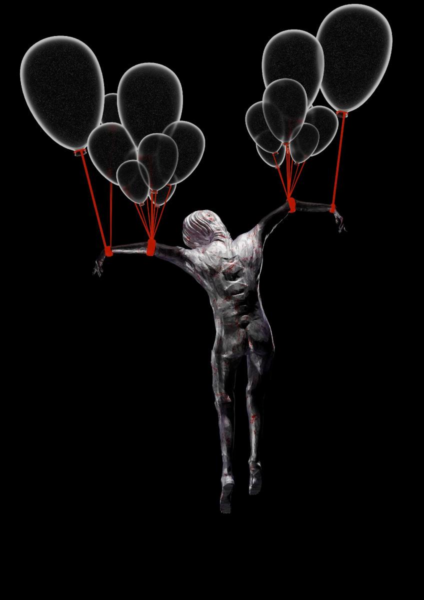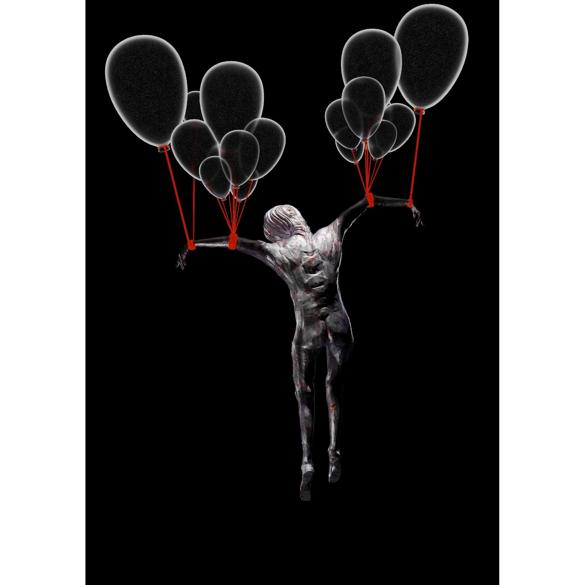 L'essere fluttua con l 'aiuto di diversi palloncini legati alle articolazioni. ogni palloncino è un pensiero, un frammento della coscienza o una direzione possibile mentale. Accettando di galleggiare nel caos trova così l'equilibrio tra pesantezza e sospensione, tra fluttuazioni di pensiero e di idee. È un’immagine della mente contemporanea, in cui la leggerezza e la fatica del pensare convivono, e la vera libertà sta nel lasciarsi portare senza perdersi.
