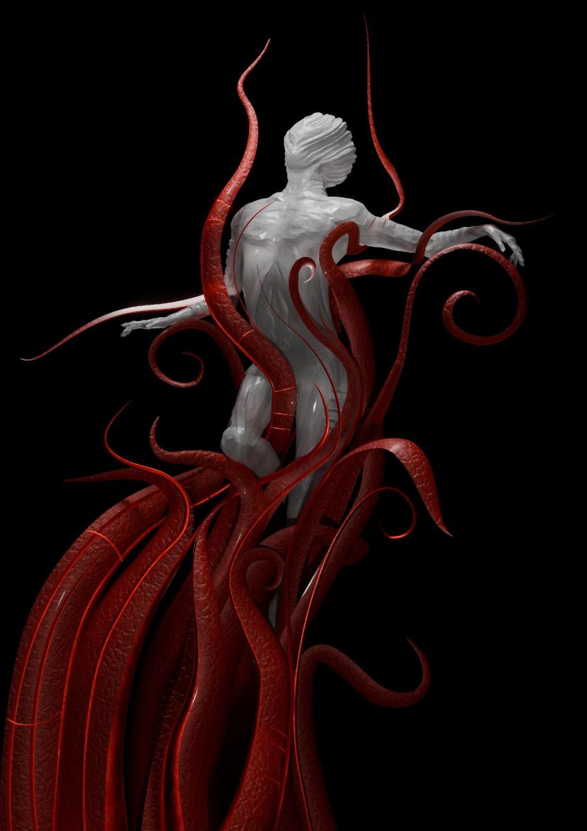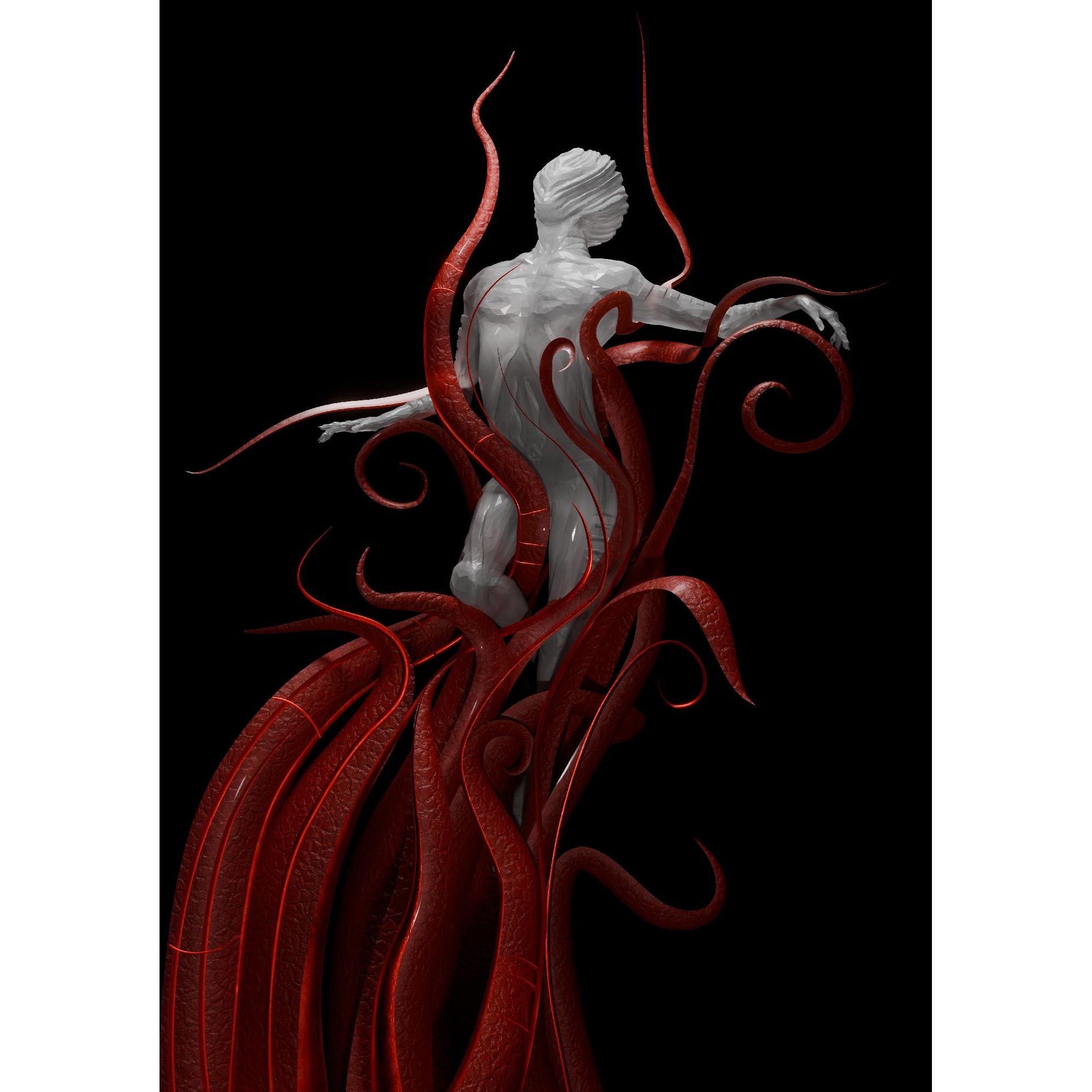 I tentacoli, simbolo di dolore e memoria, non trattengono ma accompagnano. Diventano il grembo oscuro da cui l’essere si solleva, portando con sé tutto ciò che l’ha ferito, ma senza più esserne definito.