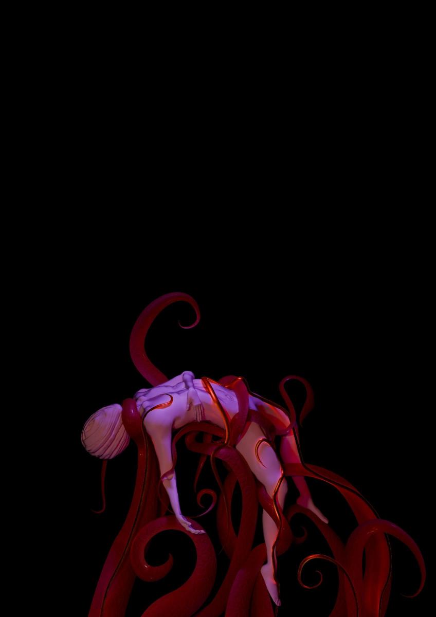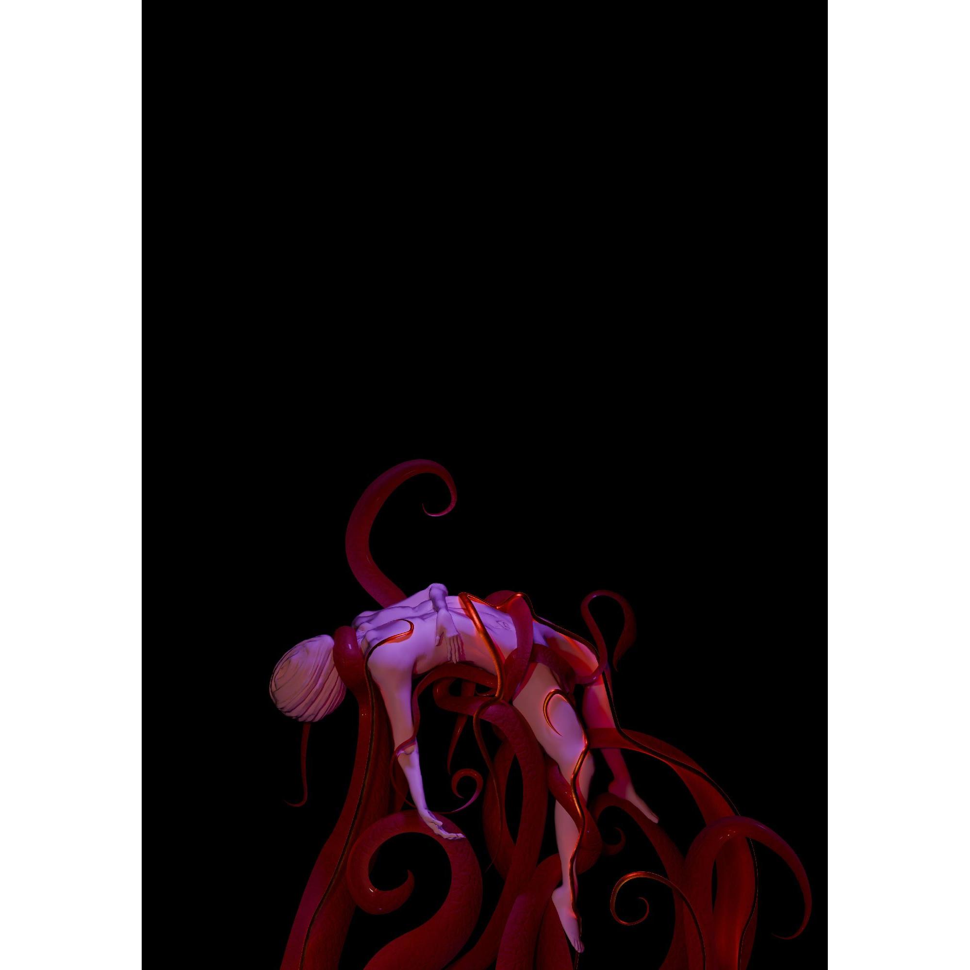 L’essere, ormai privo di forza, viene sostenuto e avvolto da forme organiche che semplicemente reclamano ciò che rimane. Le strutture tentacolari non sono un nemico né una minaccia, ma la manifestazione inevitabile del ciclo a cui ogni esistenza deve rispondere.