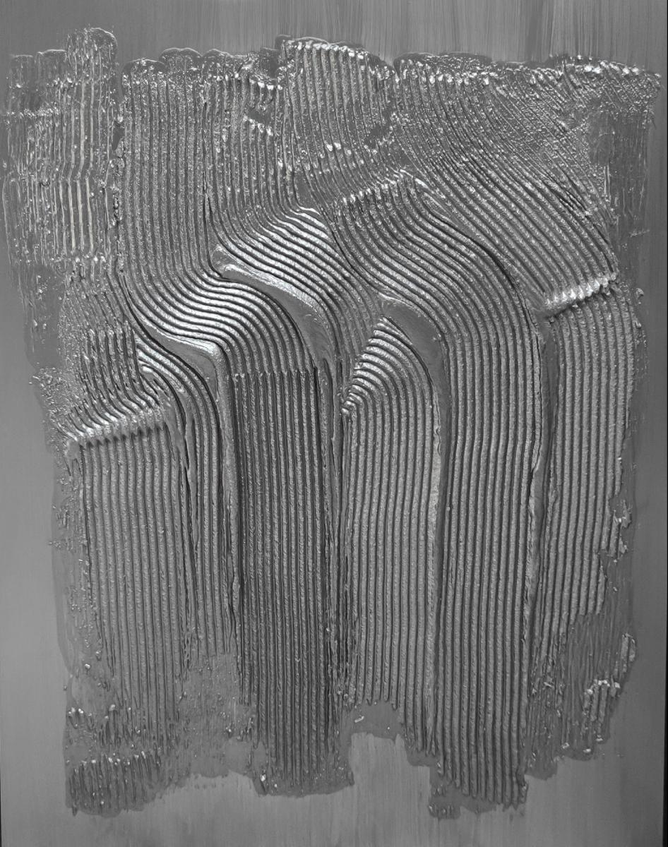 “Energia e luce” è un'opera monocromatica dove il segno e il disegno sono totalmente in simbiosi. La luce disegna linee sinuose, in un gioco quasi tridimensionale, che crea una visione d’insieme di energia e luce. Forme luminose di alluminio grezzo, si plasmano e si estendono. Di fronte al quadro, lo spettatore può vedere o immaginare la nascita e la lavorazione del metallo in nastri che si snodano liberamente, creando effetti ottici luminosi differenti in relazione alla luce. In quest’opera, ho messo tutta la mia passione per l'astrattismo e il minimalismo, lavorando con tanti materiali fra cui acrilici, smalti e pigmenti per creare una fusione d’insieme con la lastra di metallo. Il significato dell’opera è legato all’energia e alla purezza, elementi distintivi del metallo. Tutte le mie opere sono create con un impasto che compongo io rispetto a quello che voglio fare più pastoso o meno, più secco o umido, più malleabile o meno. In particolare in Energia e luce mi sono dedicata a creare forma sinuose in movimento.