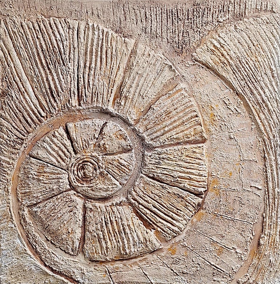 Nella creazione di questa opera ho esplorato la fusione tra natura e tempo, impiegando materiali come acrilico, gesso, terra e inchiostri per rappresentare le impronte lasciate dal passaggio delle ere. È un pezzo che parla di memoria e persistenza, di come la storia si sedimenti e si manifestino in forme astratte e minimaliste. Quando osservate quest'opera, avvertirete la connessione ancestrale con la terra e il ronzio silenzioso del tempo immutabile. Dalle colorazioni pastello, il dipinto è delicato in una cromia che parte dal colore della terra per arrivare all'arancio chiaro con sprazzi di oro e marrone.