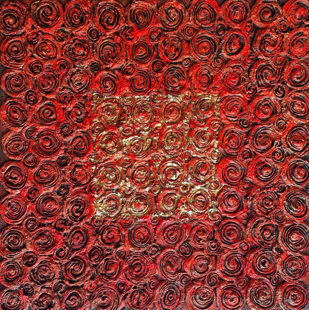 Un quadrato nel quadrato, dove la superficie è costruita come un arazzo materico: un tappeto fitto di rose, ripetute e incise, genera un campo ritmico che avvolge lo sguardo.