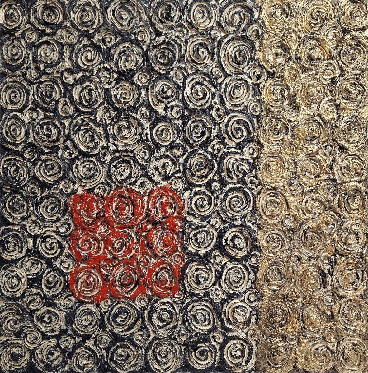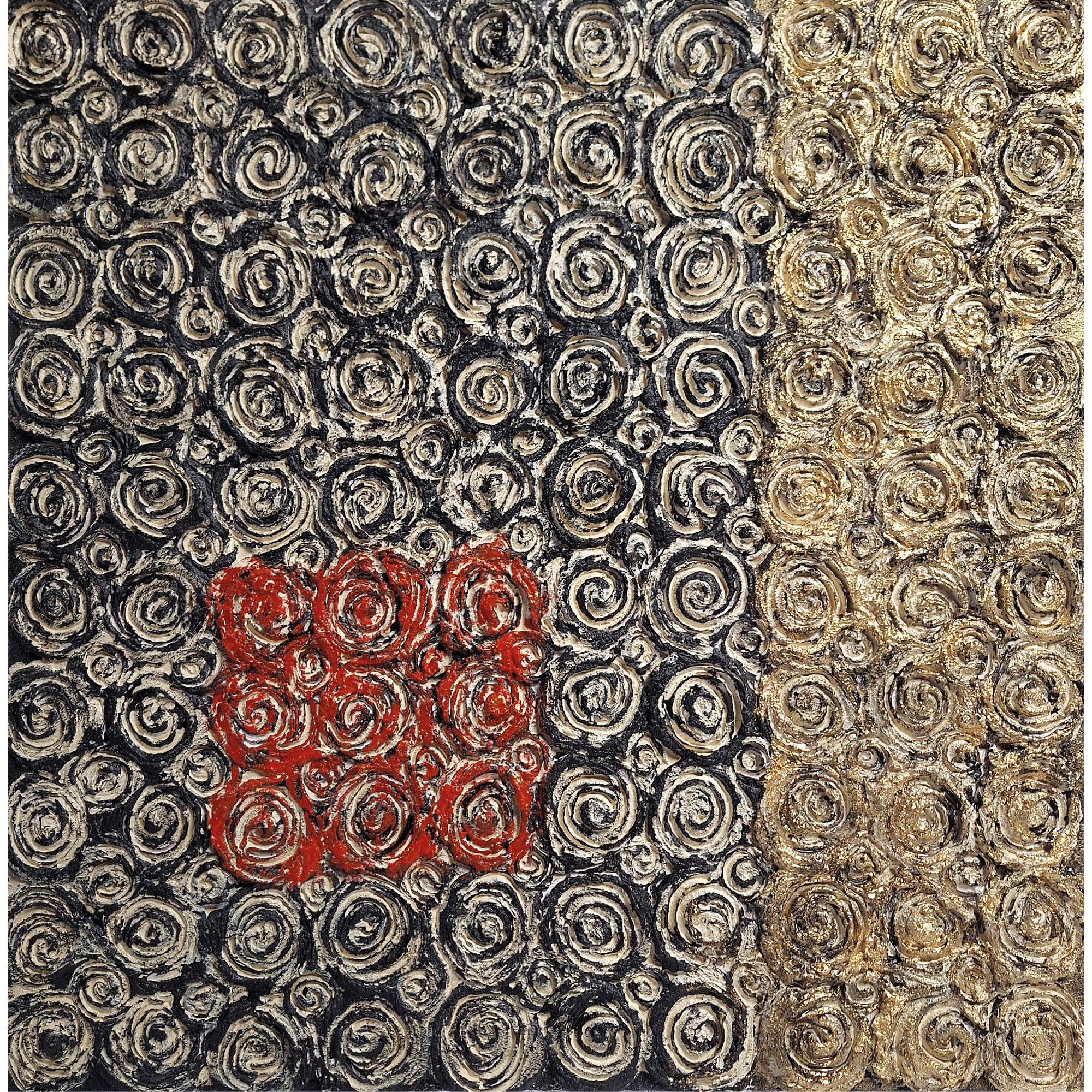 I campi materici nascono dalla ripetizione della rosa, che si moltiplica fino a trasformarsi in una trama quasi tessile. La superficie è modellata: la materia trattiene il movimento del segno e lo trasforma in rilievo, in traccia. All’interno di questa trama organica emergono interventi geometrici essenziali — un quadrato rosso, l’elegante contrasto di una fascia dorata, una soglia cromatica — che interrompono il ritmo e trattengono lo sguardo. La composizione è in equilibrio, dove segno e geometria entrano in dialogo. Ne nasce un campo visivo vibrante: la ripetizione genera ritmo e la materia cattura la luce, facendo emergere una dimensione quasi energetica della superficie. L’opera si sviluppa nello spazio in cui ordine e impulso convivono, e la pittura diventa esperienza tattile e percettiva.