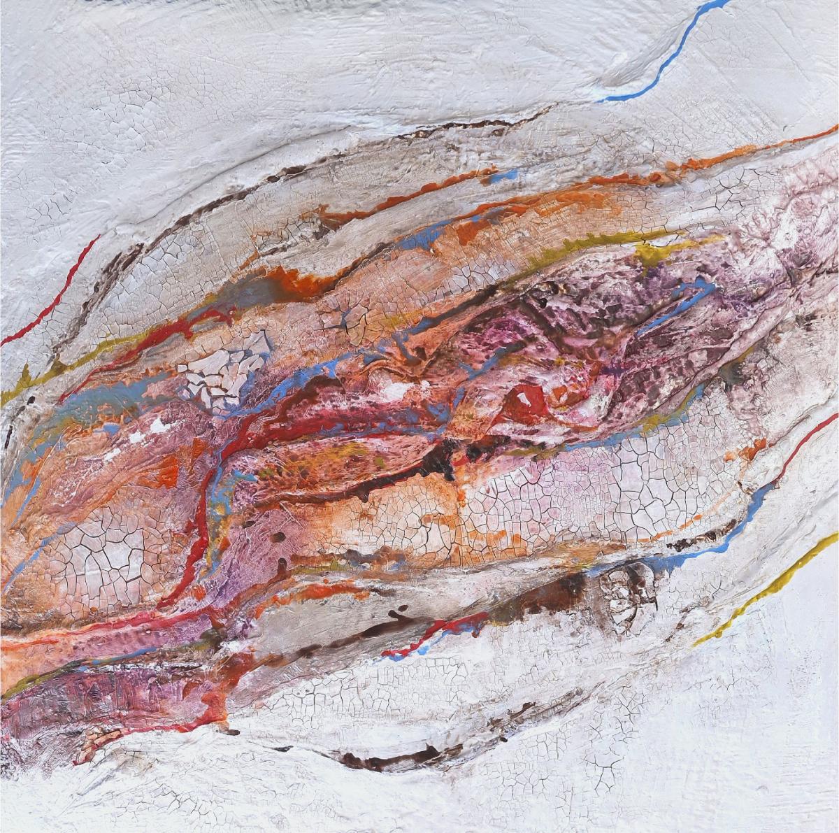 Una superficie in parte arida, evocazione del deserto si apre, rivelando una materia interna in movimento, attraversata da origini cromatiche colorate simbolo di esplorazione verso mondi immaginari ma che lasciano intatte le mie radici.