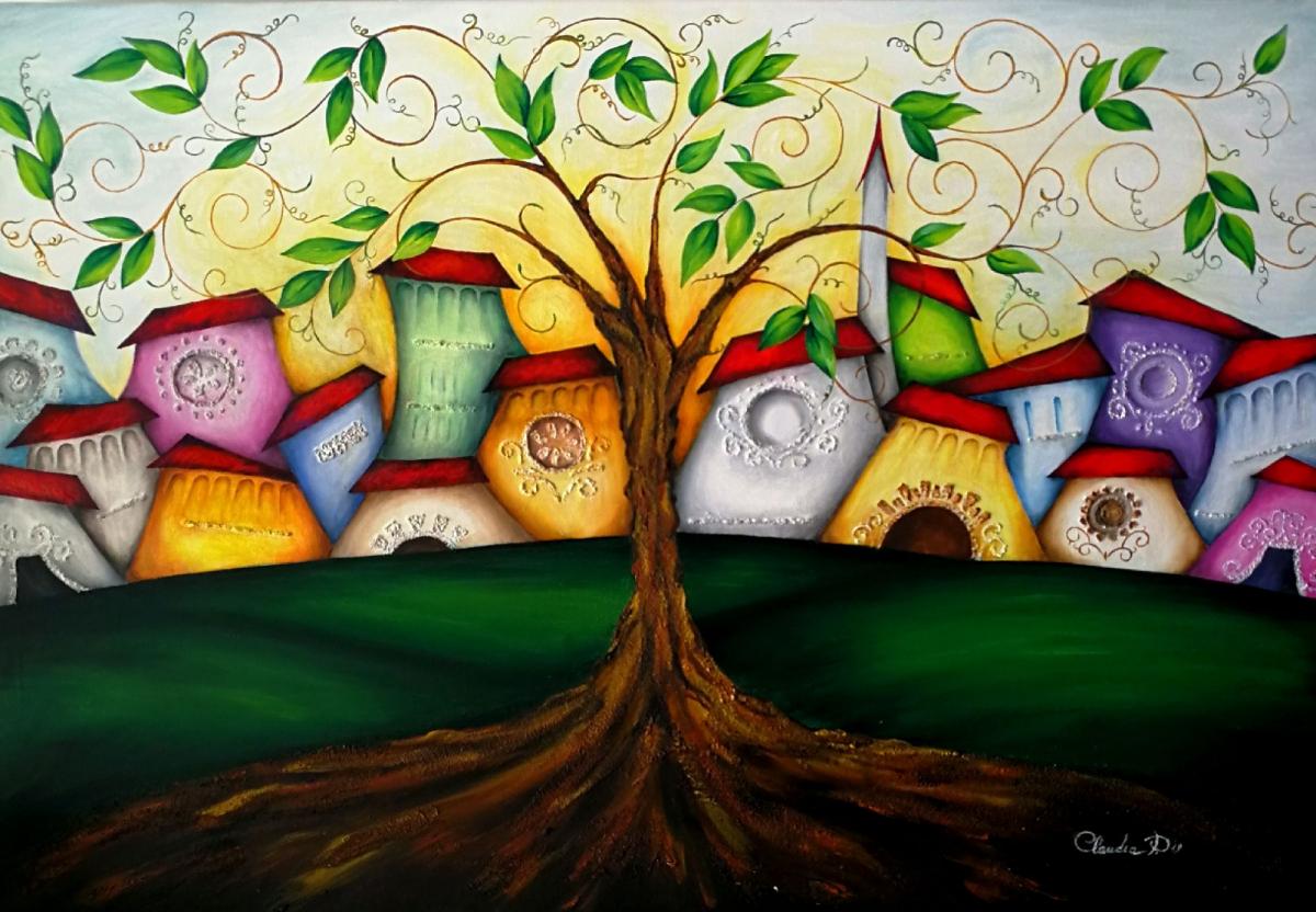 l’albero della vita è considerato una sorgente di vita, i sui elementi : radici, tronco, foglie frutti rappresentano un aspetto importante della vita dell’uomo, solidità, fermezza, calma, saggezza, forza, nascita e rinascita. Questa mia opera, un albero che sovrasta le case simbolo anch'esse di solidità oltre che materiale, anche sentimentale, vuole essere augurio per chi sta per iniziare una nuova vita intensa, piena di amore di certezze, basata su solide radici. Claudia Pistola