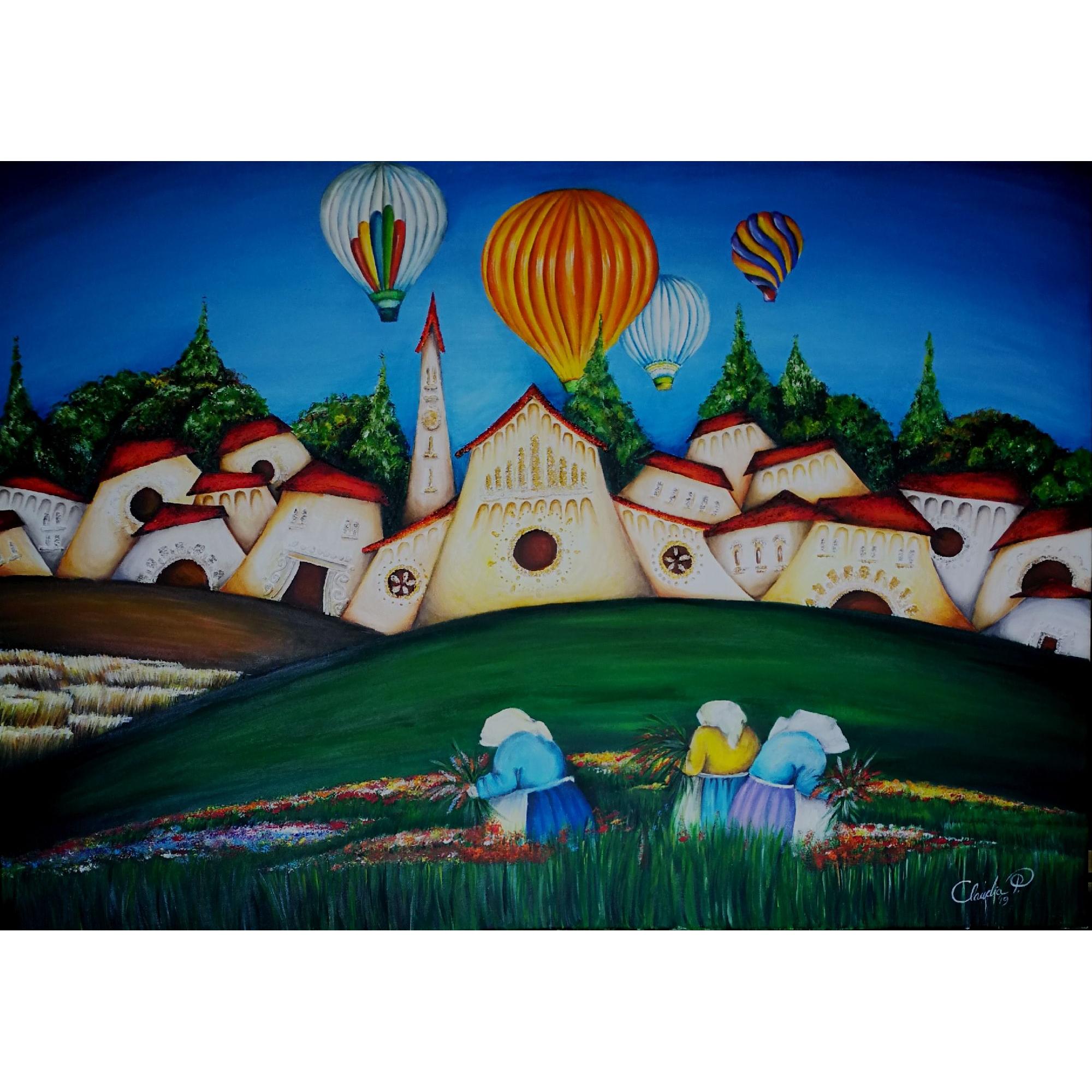 Mongolfiere in festa Rappresenta per me, la magia di una giornata passata in campagna. Le mie case colorate sono il focolare, il punto di partenza e di ritorno. Il nostro punto fermo nel mondo. Le mongolfiere simbolo di libertà sono l'augurio di riuscire a sognare e ad intraprendere il viaggio verso la realizzazione dei nostri progetti sogni aspirazioni.
