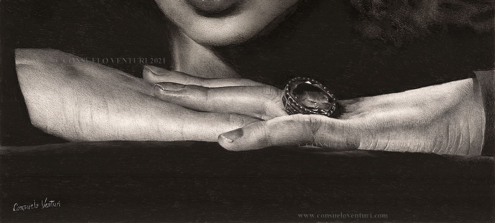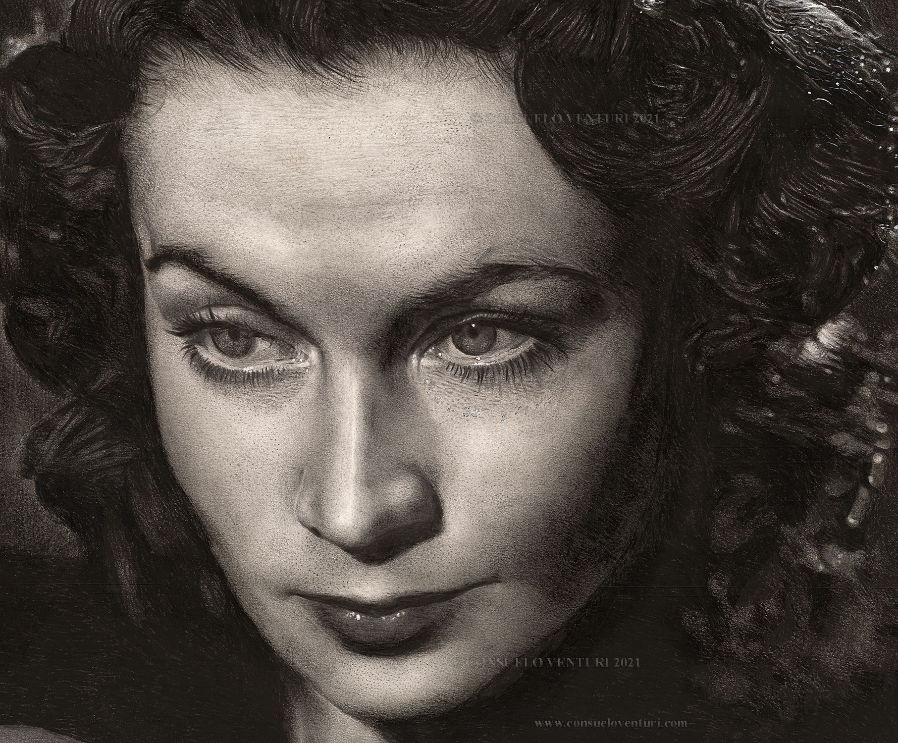 Vivien Leigh in questo disegno realizzato con grafite e acrilico su carta, è rappresentata non come il personaggio di Rossella O'Hara del celebre film "Via col vento", ma come una donna pensierosa, che ha lo sguardo fisso su qualcosa che l'osservatore non può vedere, come se fosse molto lontano... non come una diva, ma come una persona come tutte. L'anello che porta al dito, mi sembrava guardando la foto originale, una pietra d'ametista: questa particolarità dell'anello ha dato il titolo a questo mio disegno.