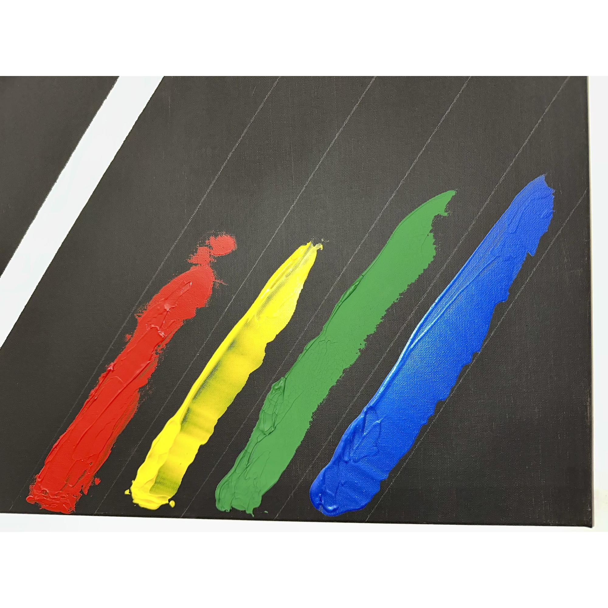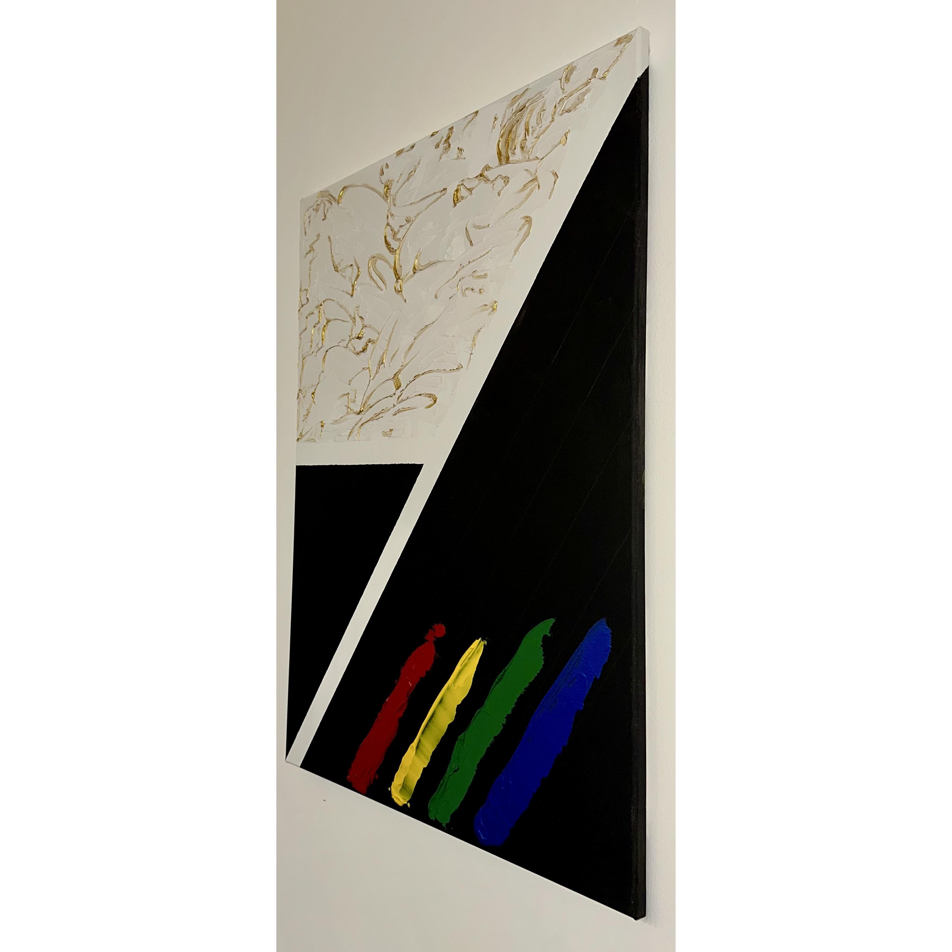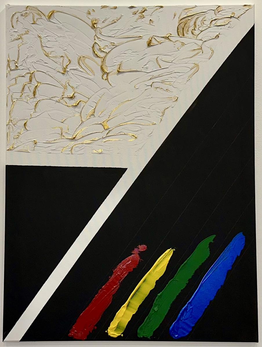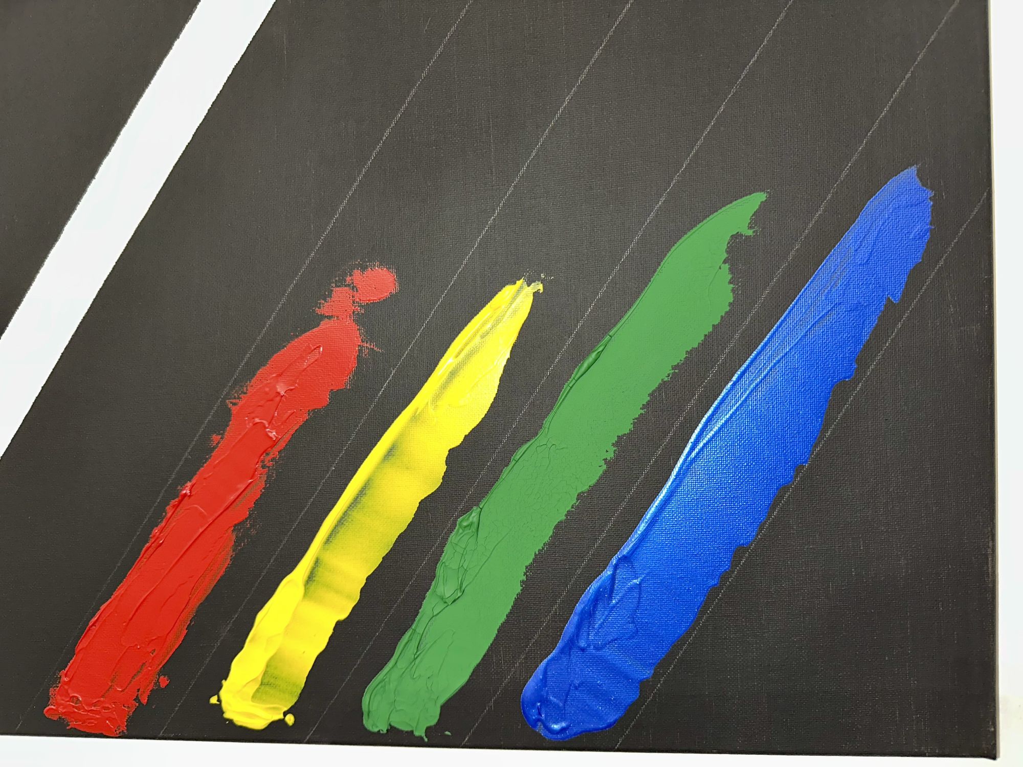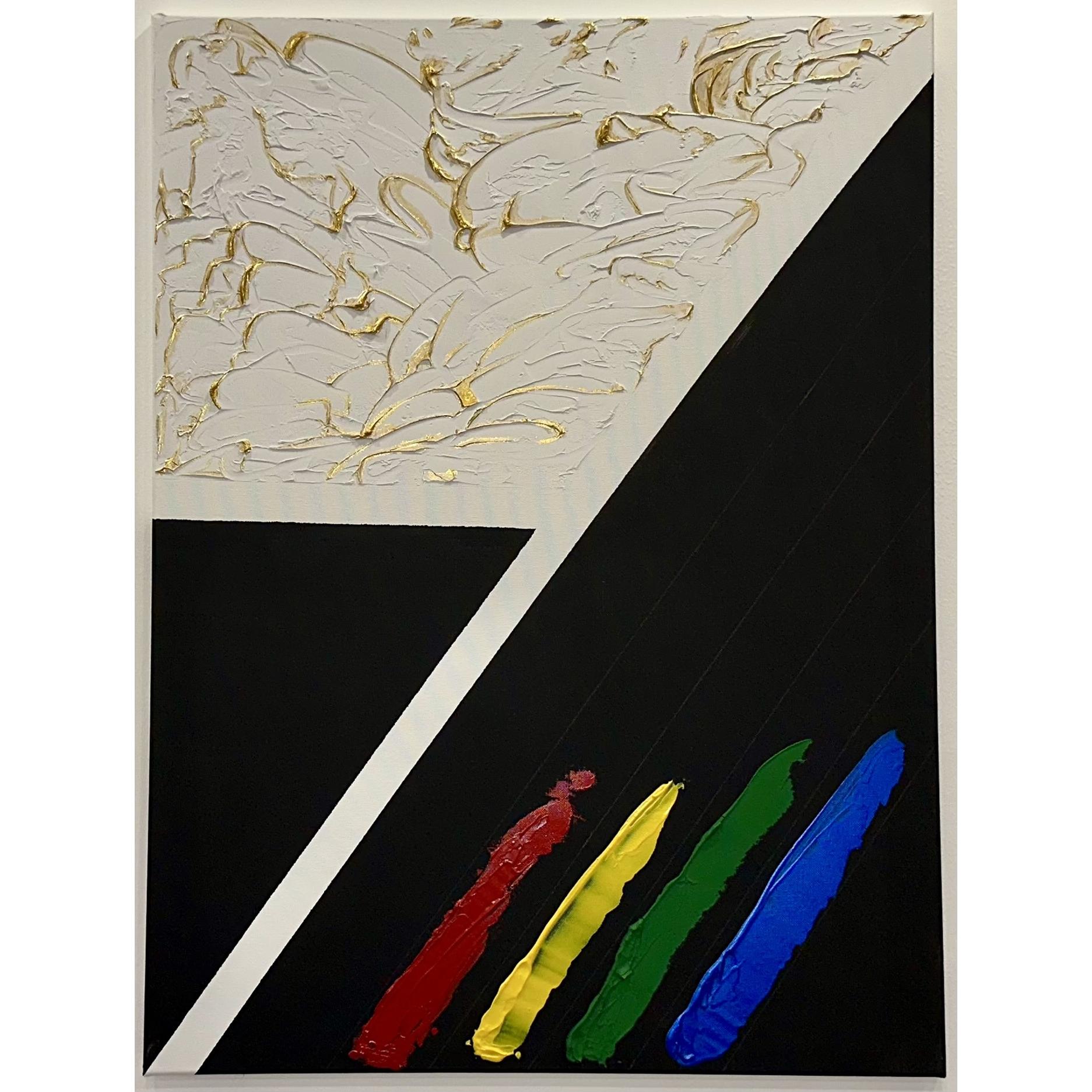 Il colore interviene come atto primario: quattro gesti pittorici puri — rosso, giallo, verde e blu — irrompono nello spazio come soglie visive, segnali di energia e scelta. La materia e il colore diventano linguaggio, in un equilibrio instabile tra controllo e impulso.