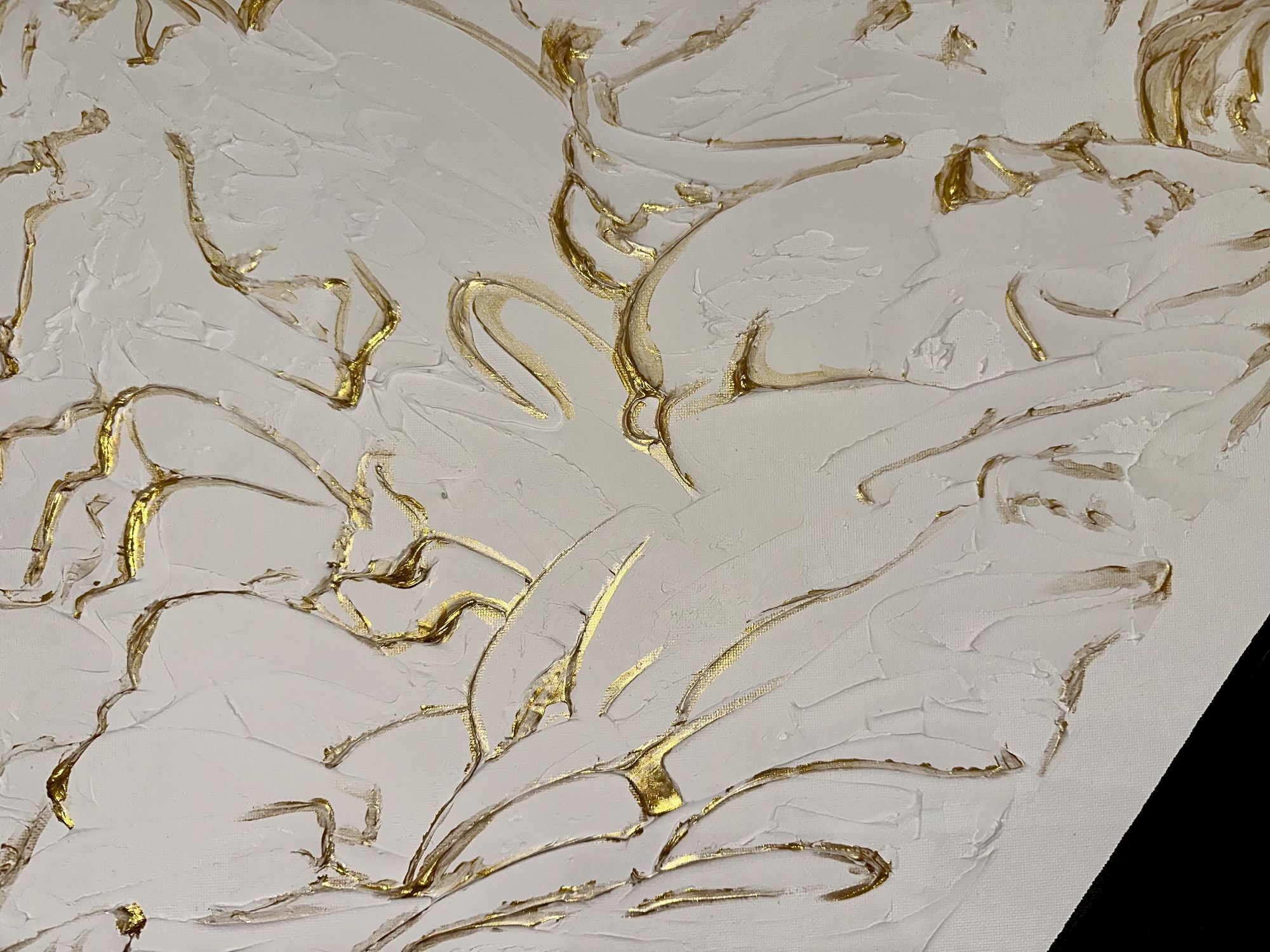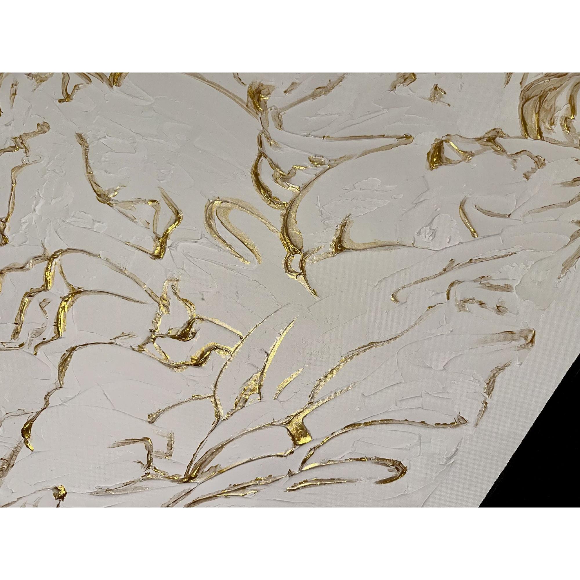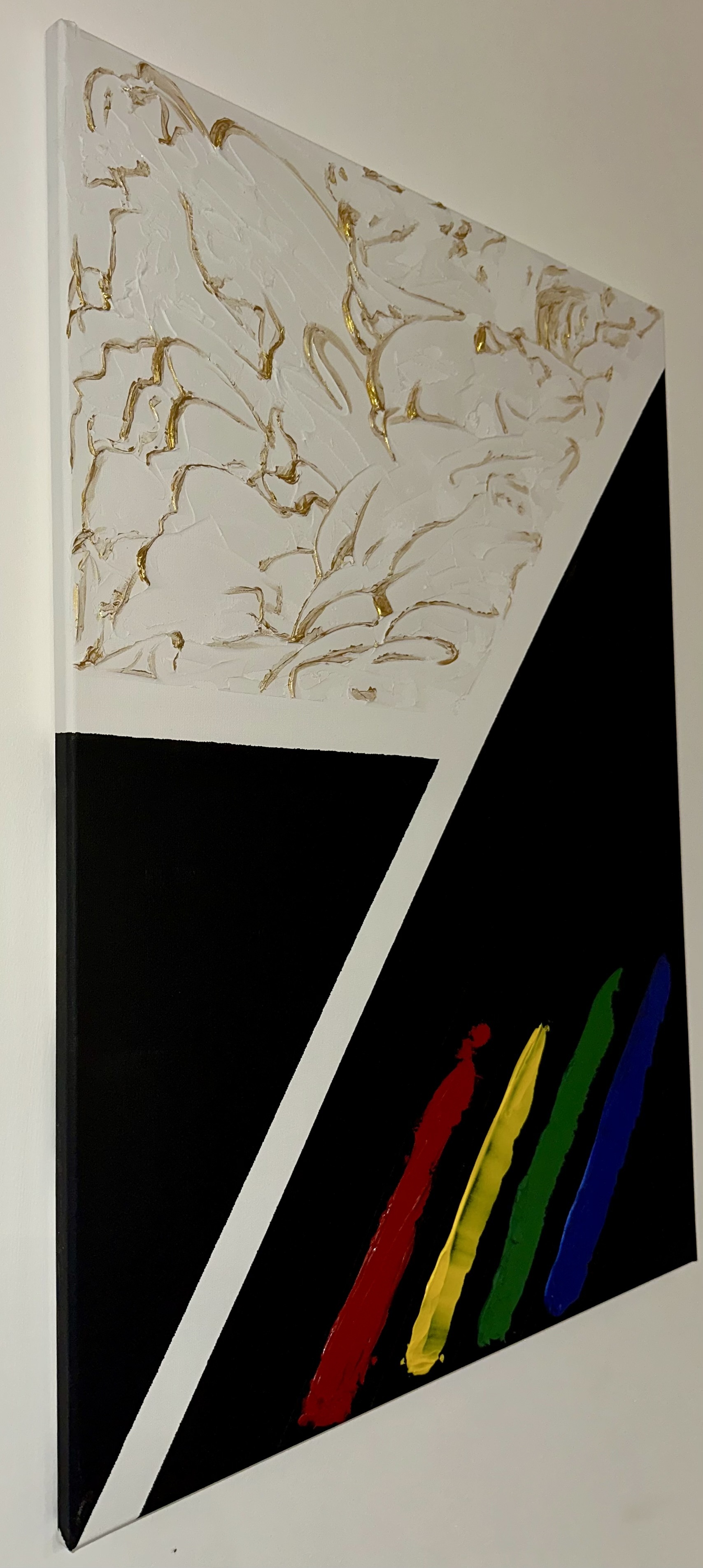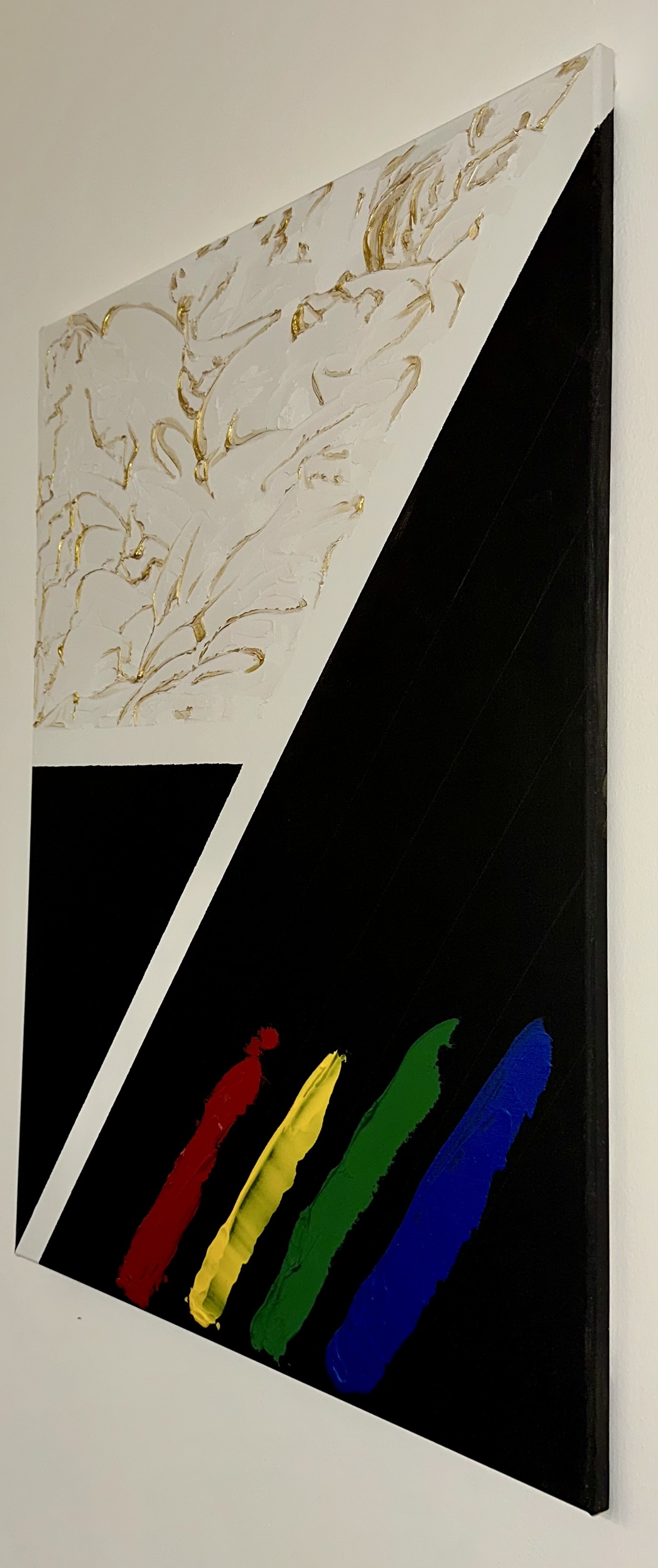 L’opera del secondo frattale della serie codici dal caos esplora la tensione tra struttura e gesto. Una composizione geometrica rigorosa divide lo spazio in campi contrapposti, mettendo in dialogo una superficie chiara e materica, attraversata da tracce dorate, e un fondo scuro che suggerisce profondità e direzione.
