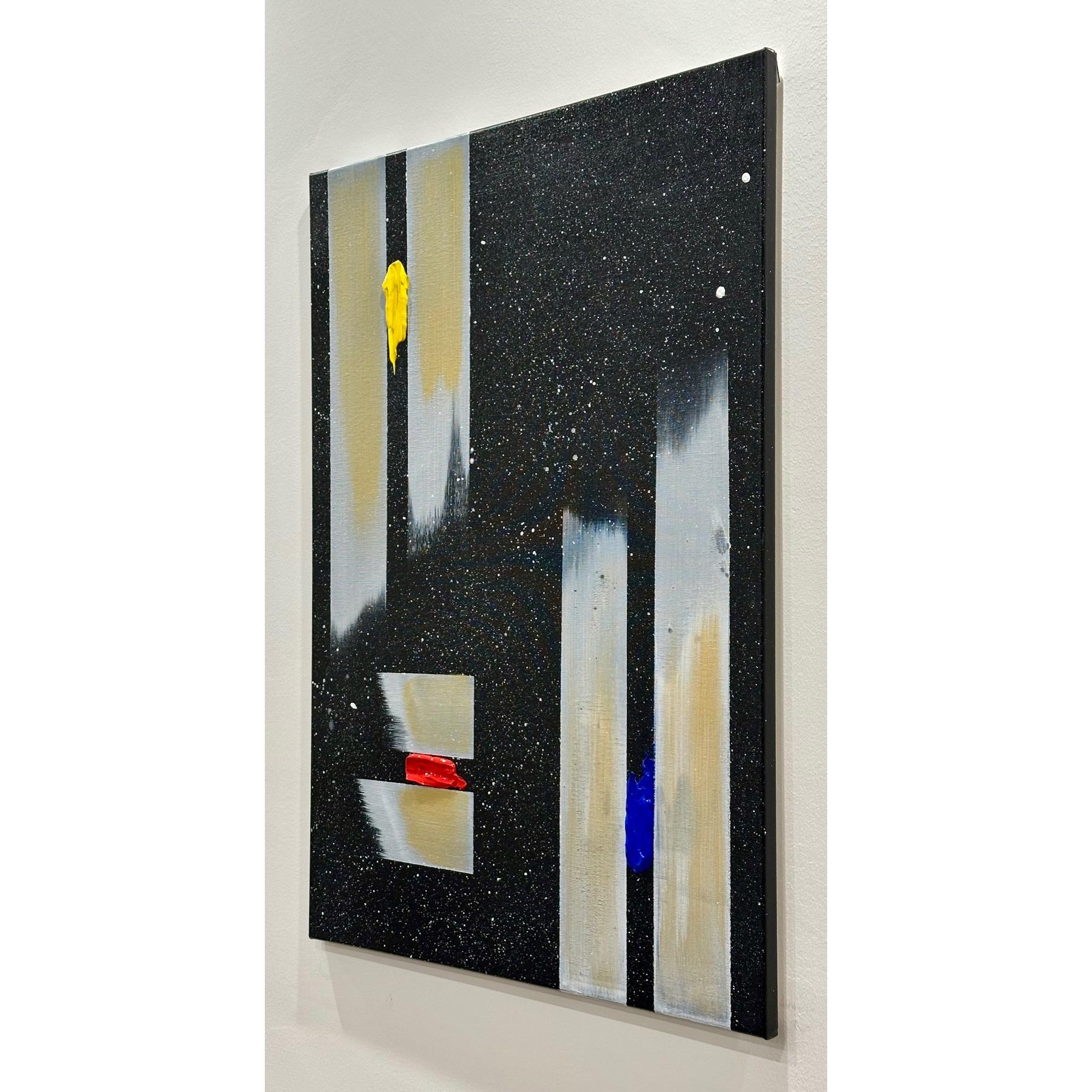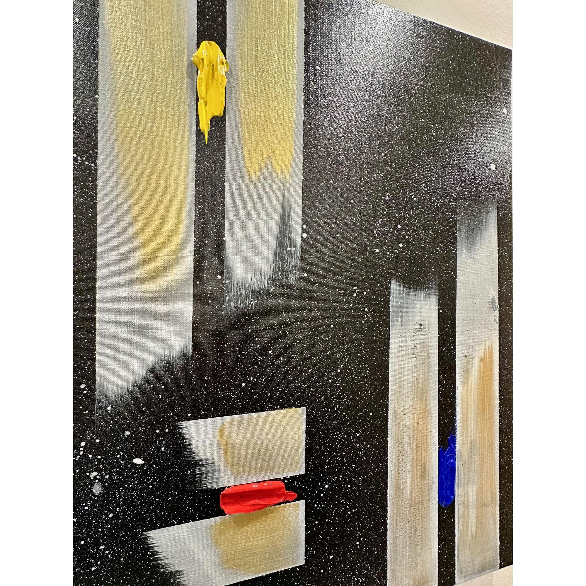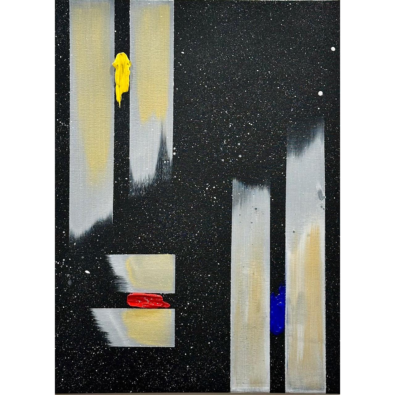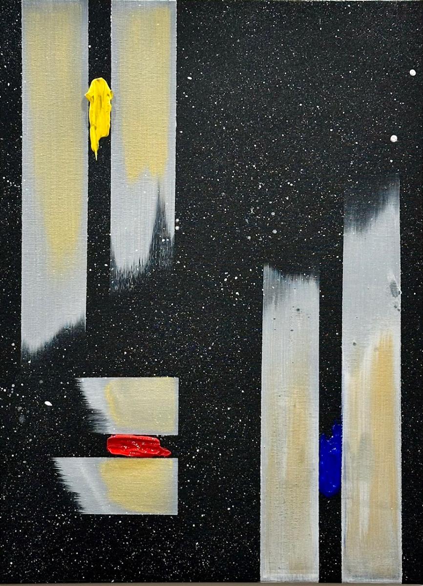 Il fondo cosmico accoglie frammenti di colore puro — giallo, rosso, blu — segni minimi ma vitali, tensioni che interrompono l’equilibrio e aprono possibilità.