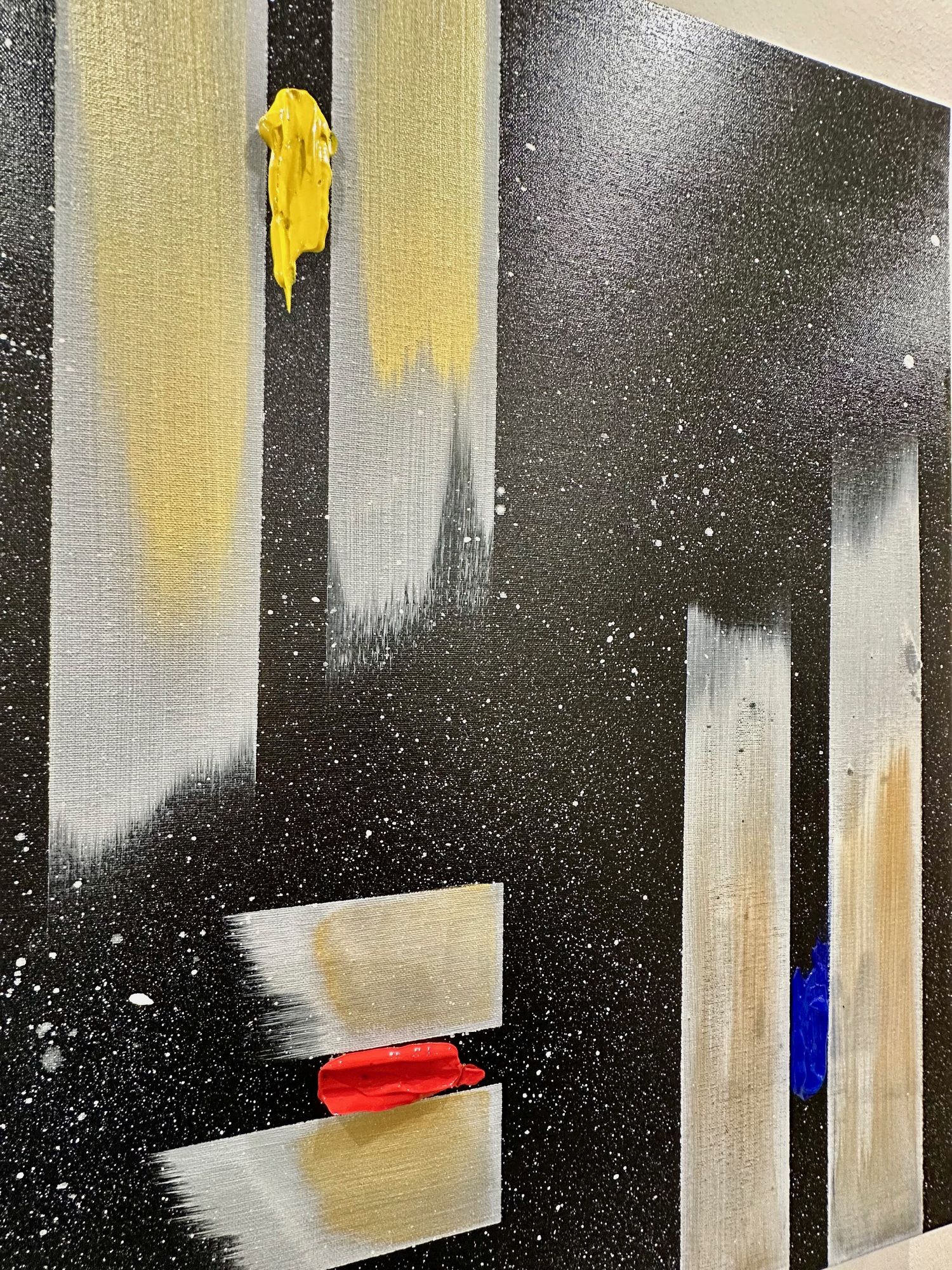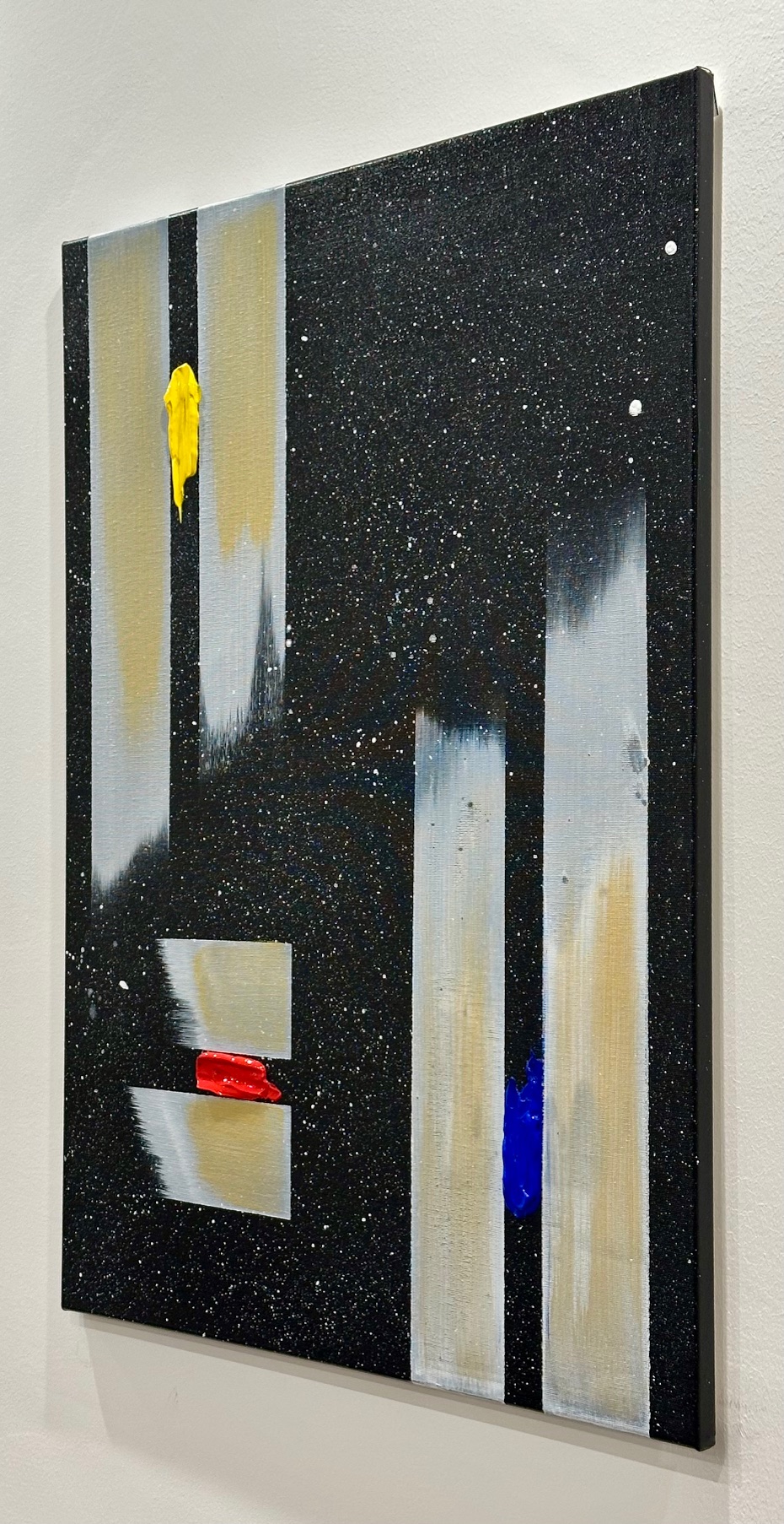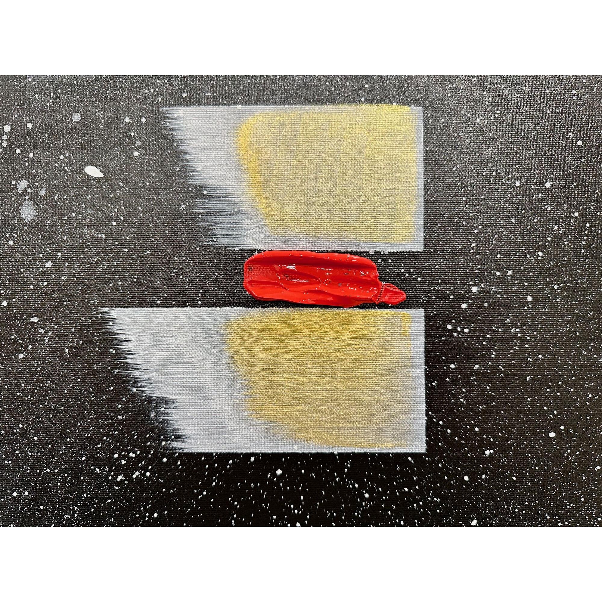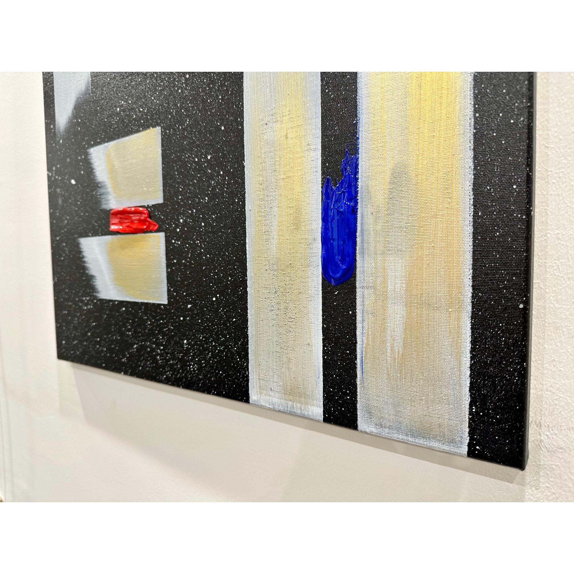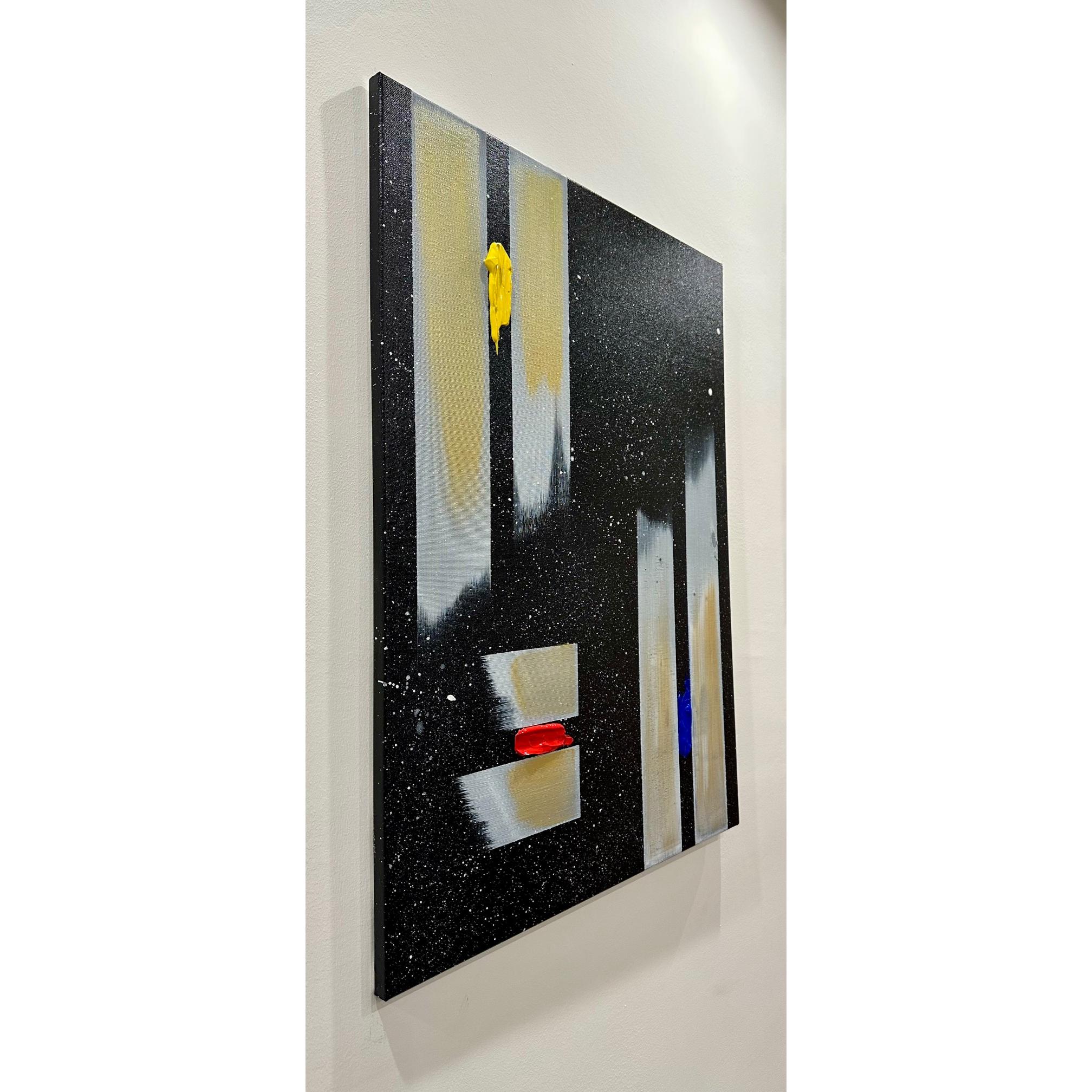 Il fondo cosmico accoglie frammenti di colore puro — giallo, rosso, blu — segni minimi ma vitali, tensioni che interrompono l’equilibrio e aprono possibilità.
