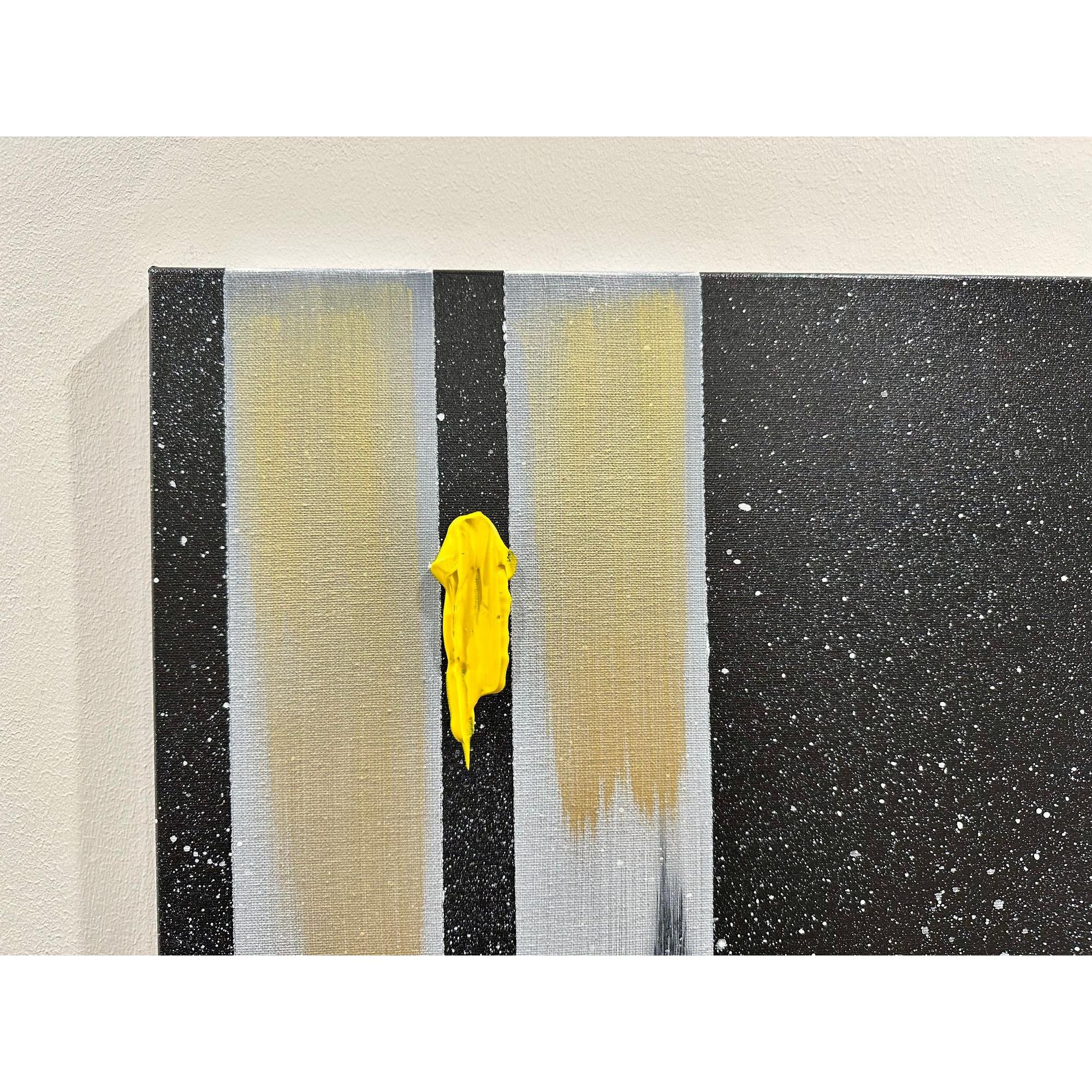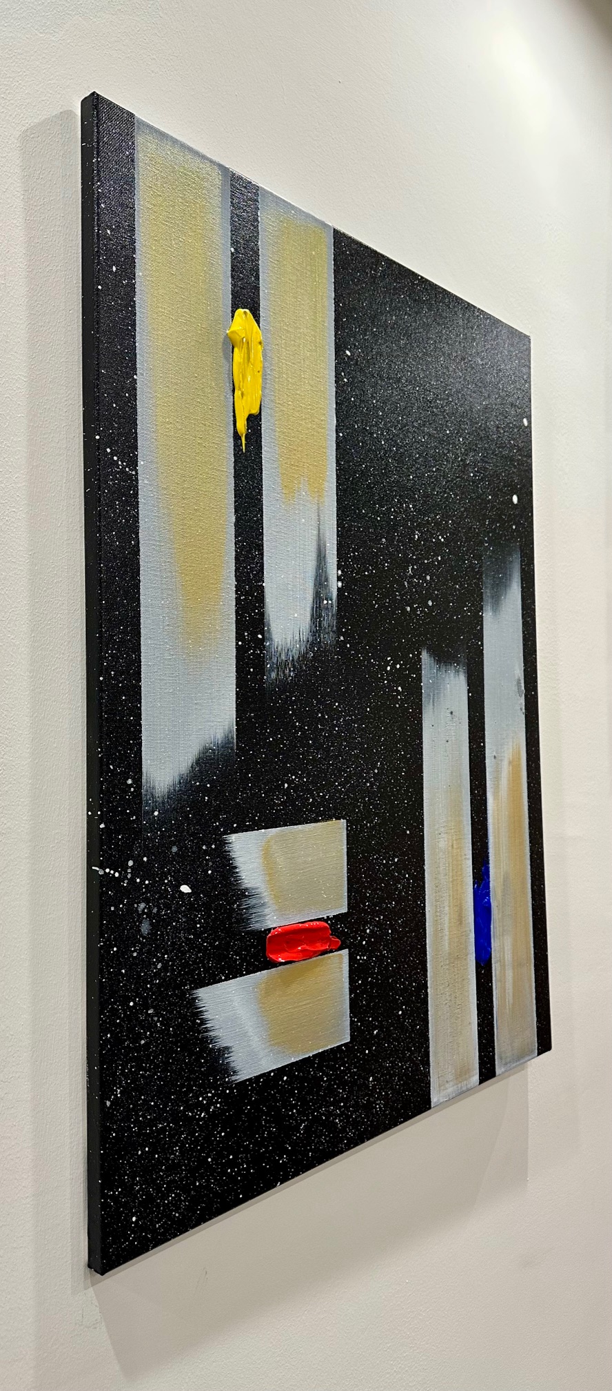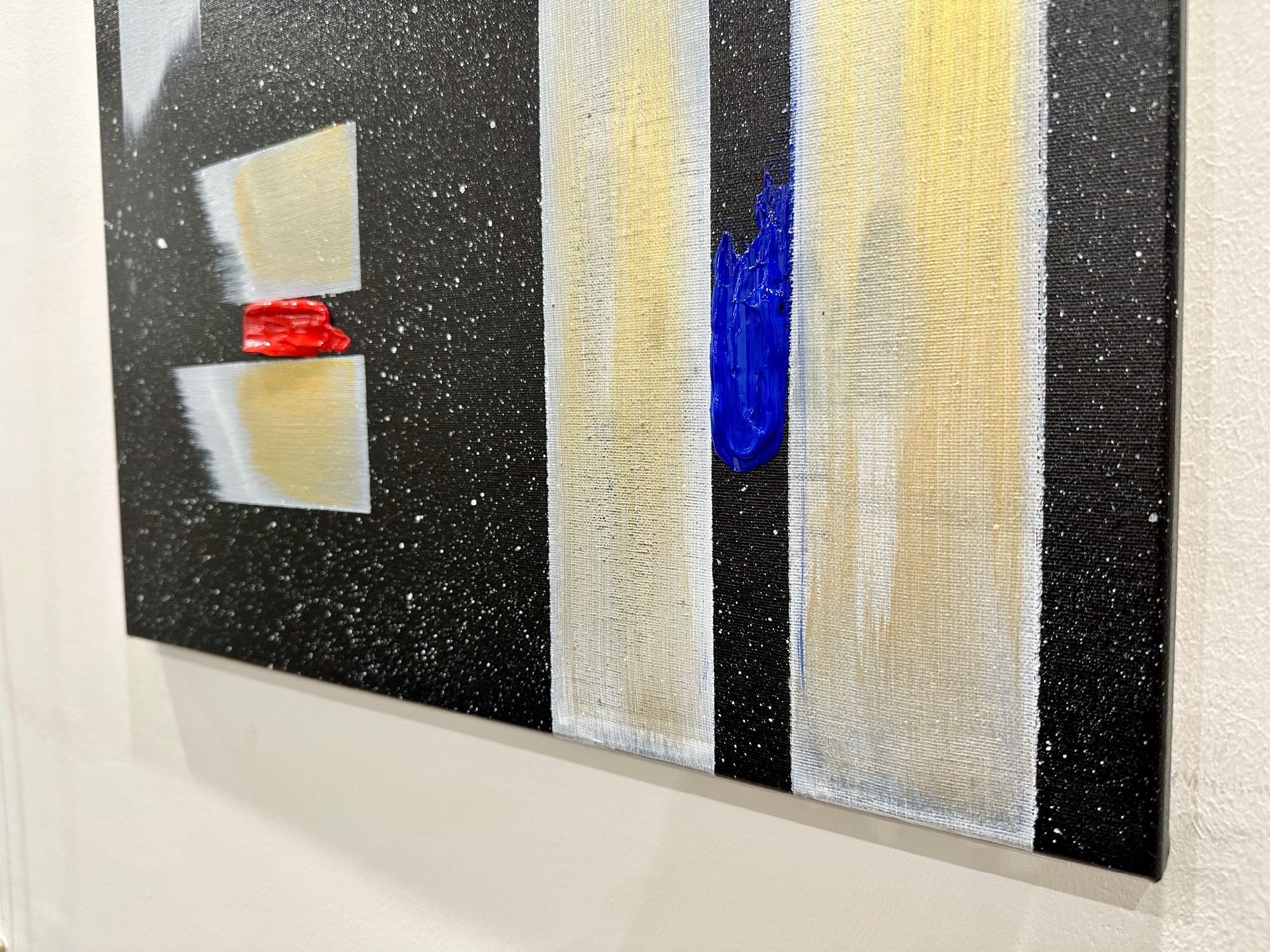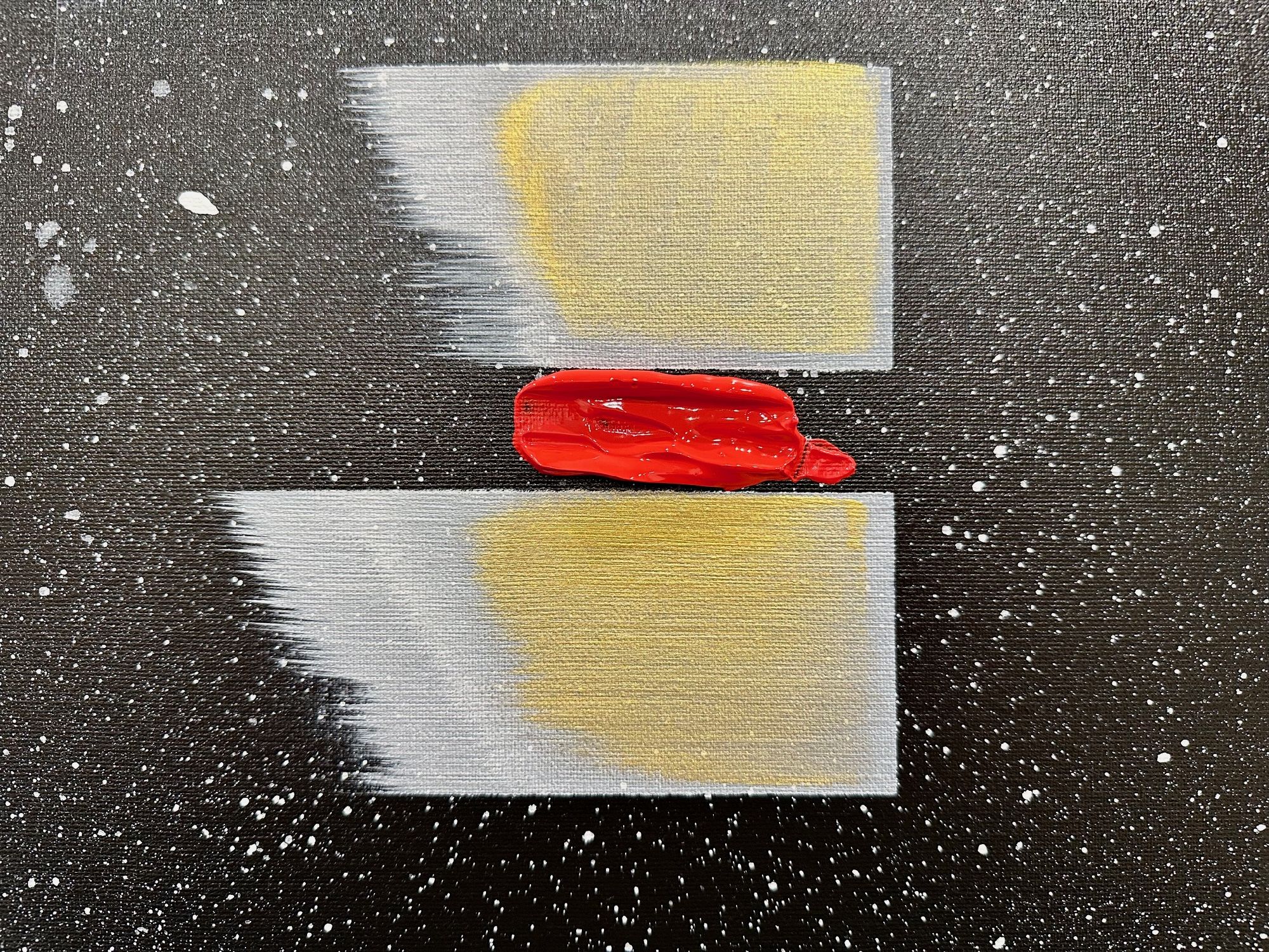 Il fondo cosmico accoglie frammenti di colore puro — giallo, rosso, blu — segni minimi ma vitali, tensioni che interrompono l’equilibrio e aprono possibilità.