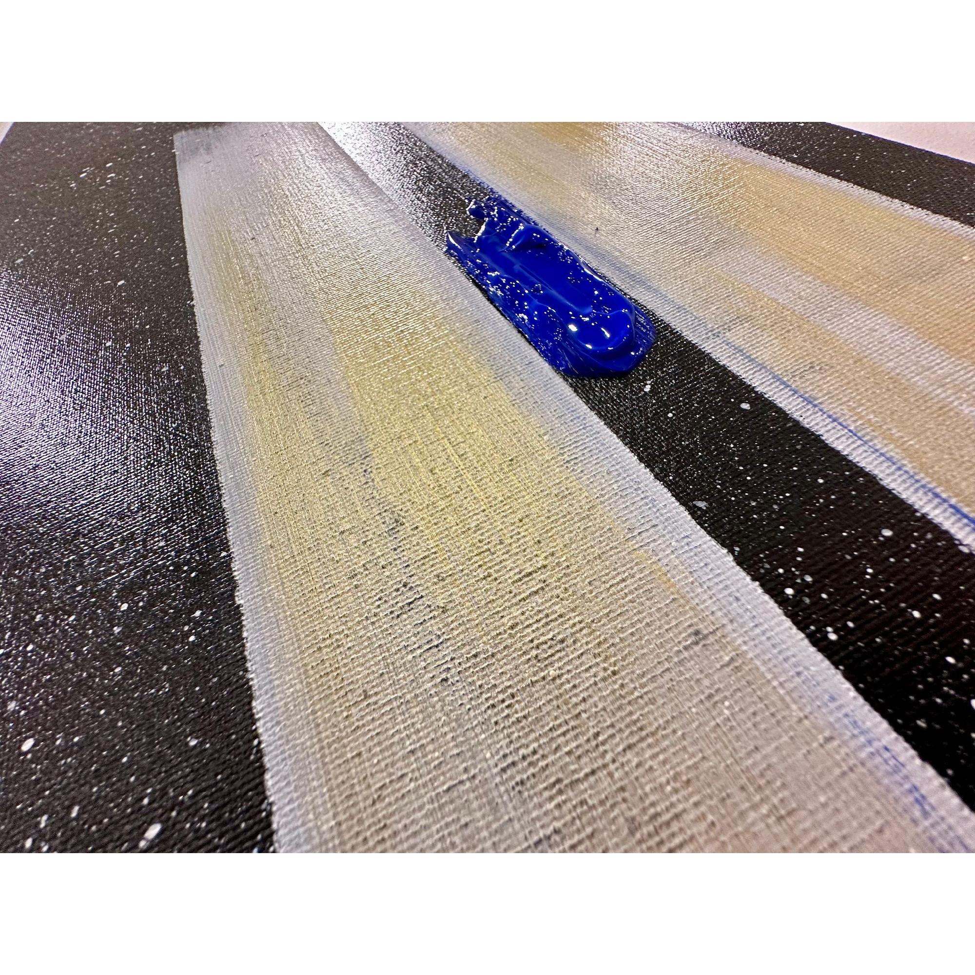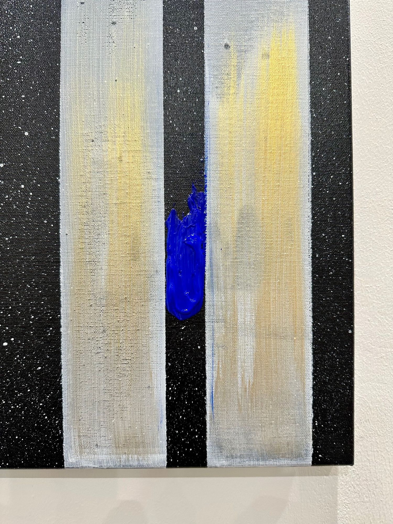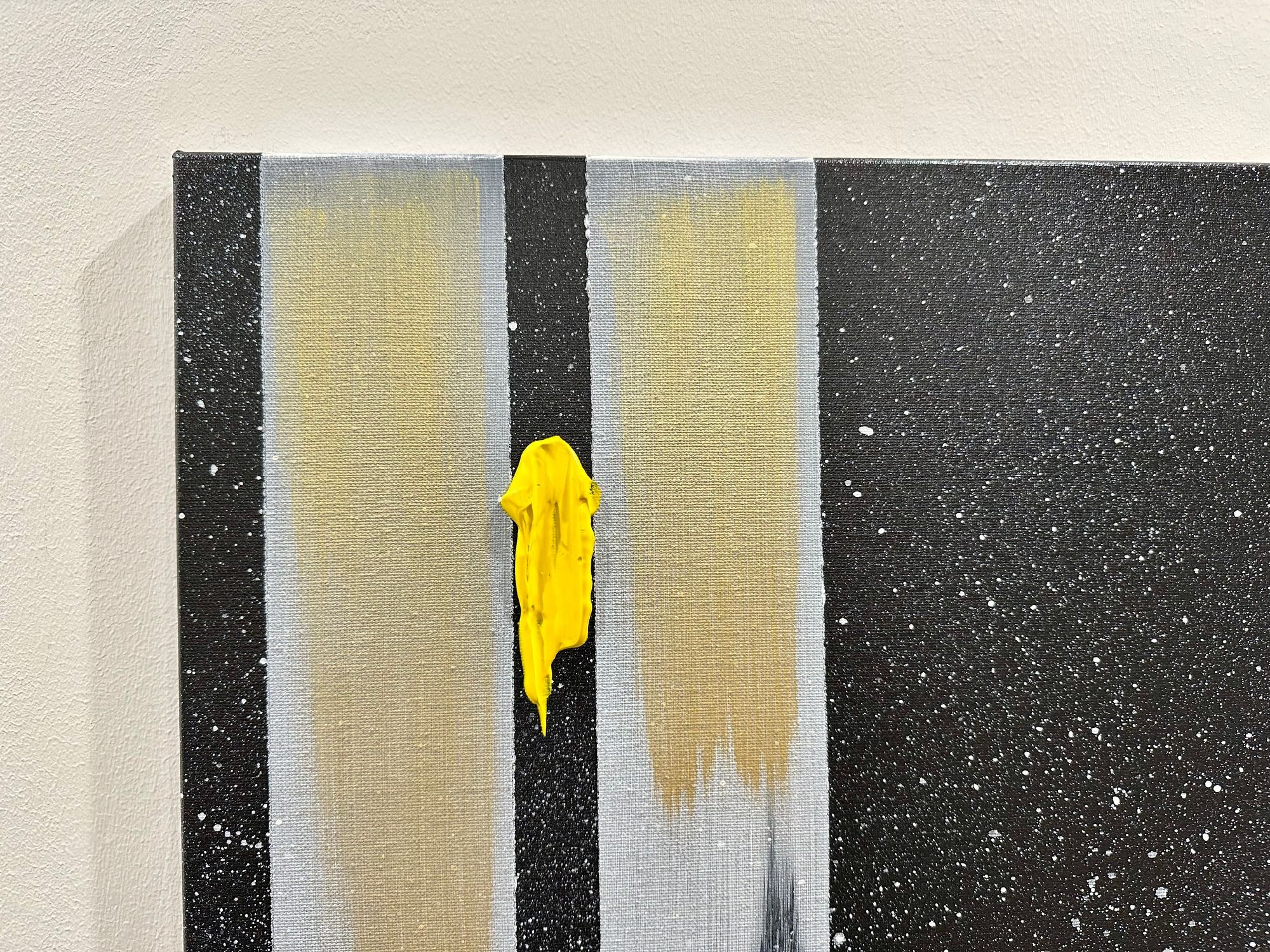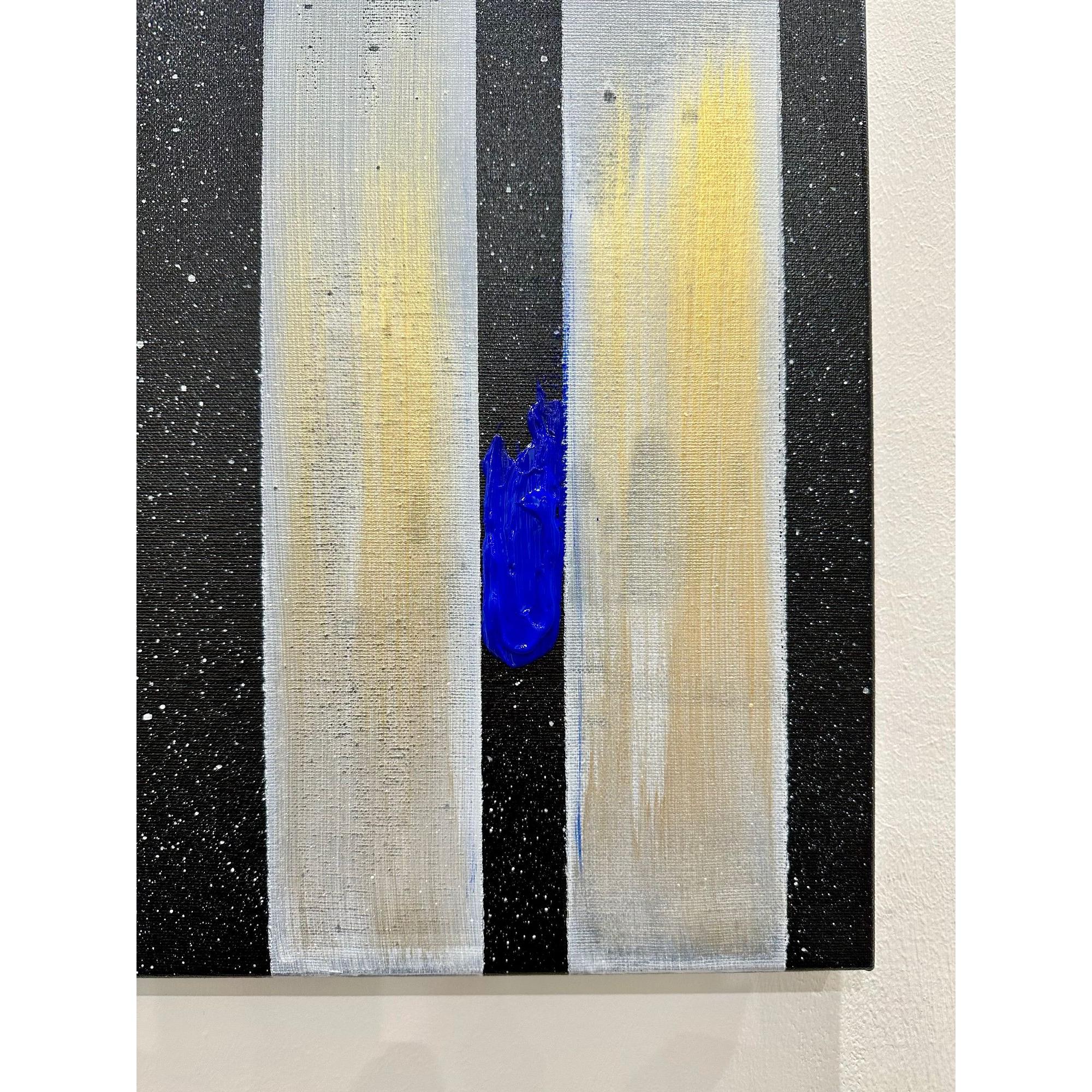 Il fondo cosmico accoglie frammenti di colore puro — giallo, rosso, blu — segni minimi ma vitali, tensioni che interrompono l’equilibrio e aprono possibilità.