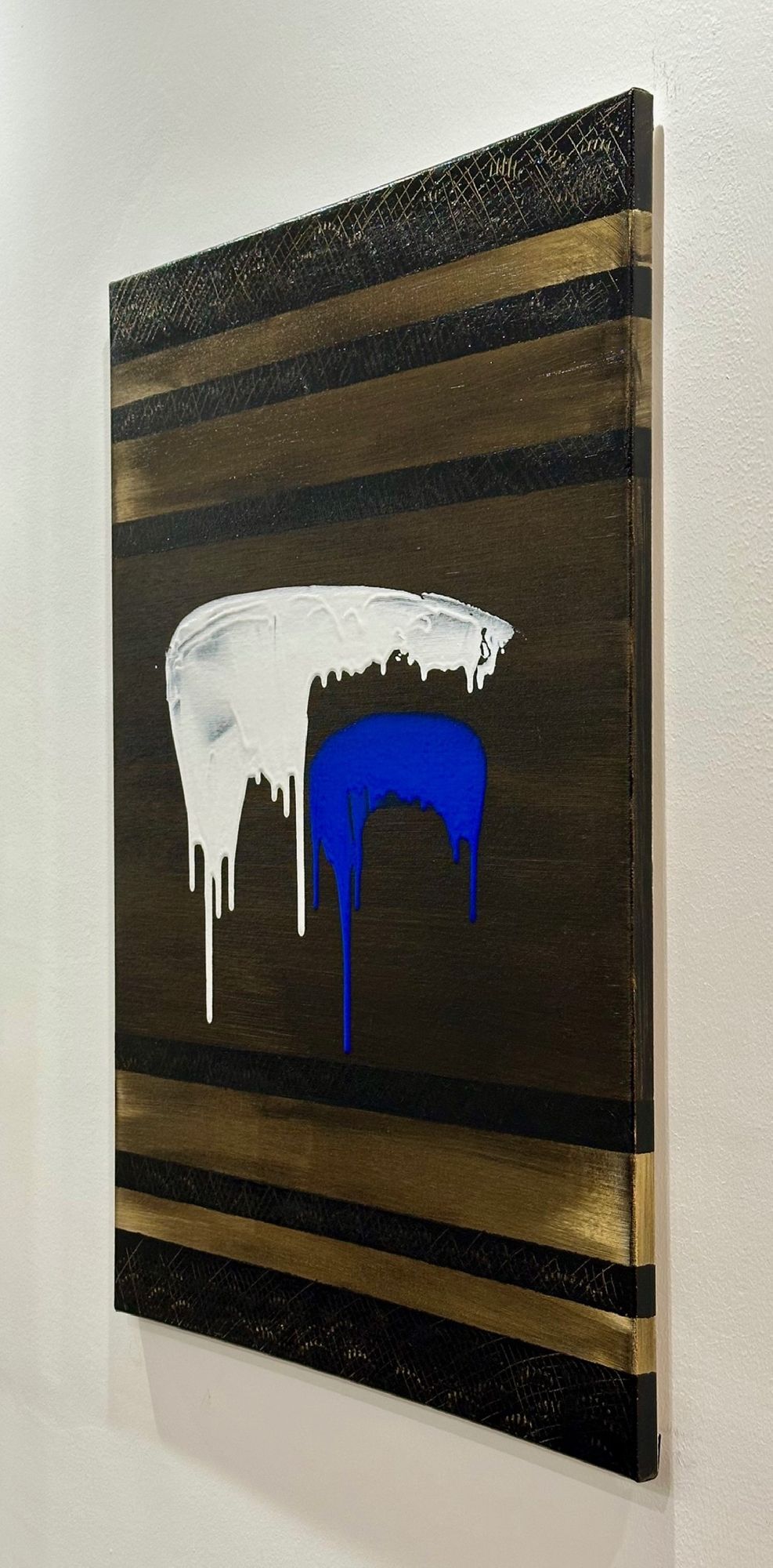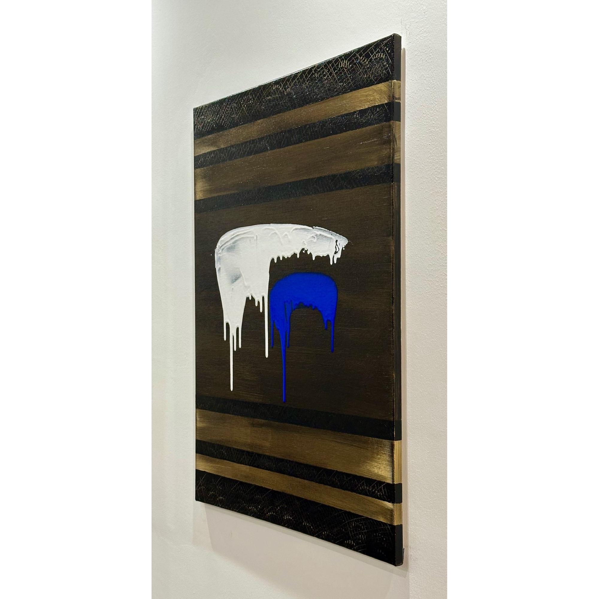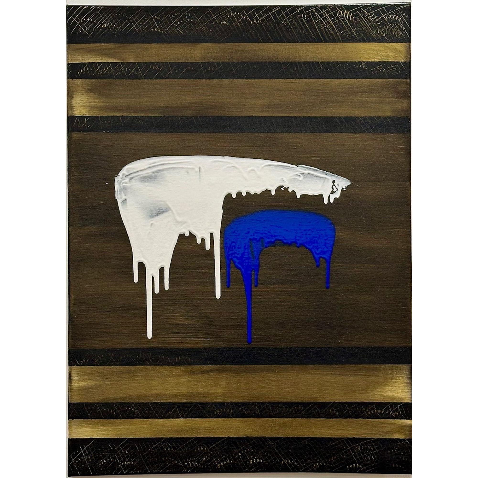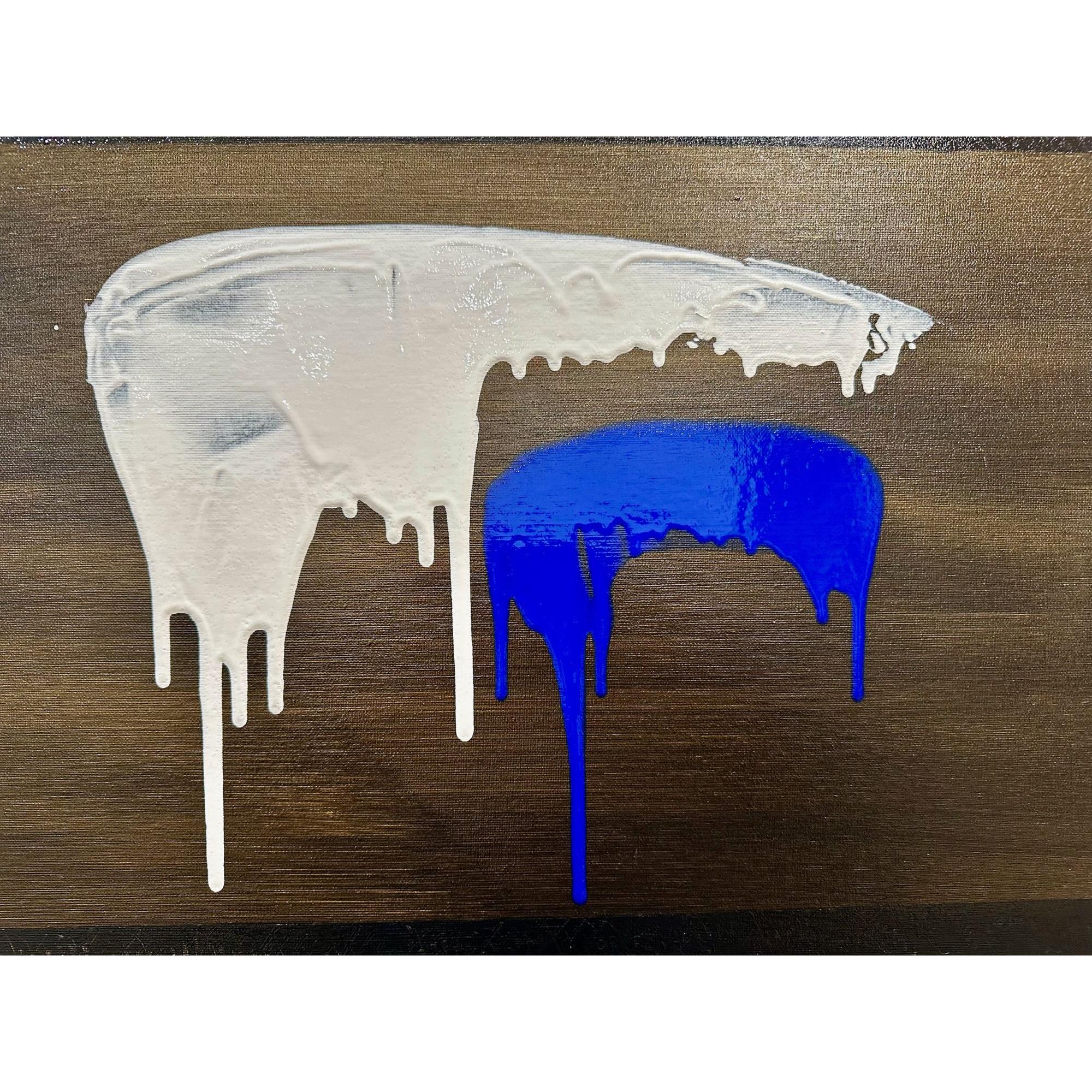 In Soglia III, il gesto si fa sospensione. Il bianco accoglie e trattiene, mentre il blu attraversa lo spazio con una traccia verticale più profonda e inevitabile. Il colore che cola diventa tempo, non caduta.