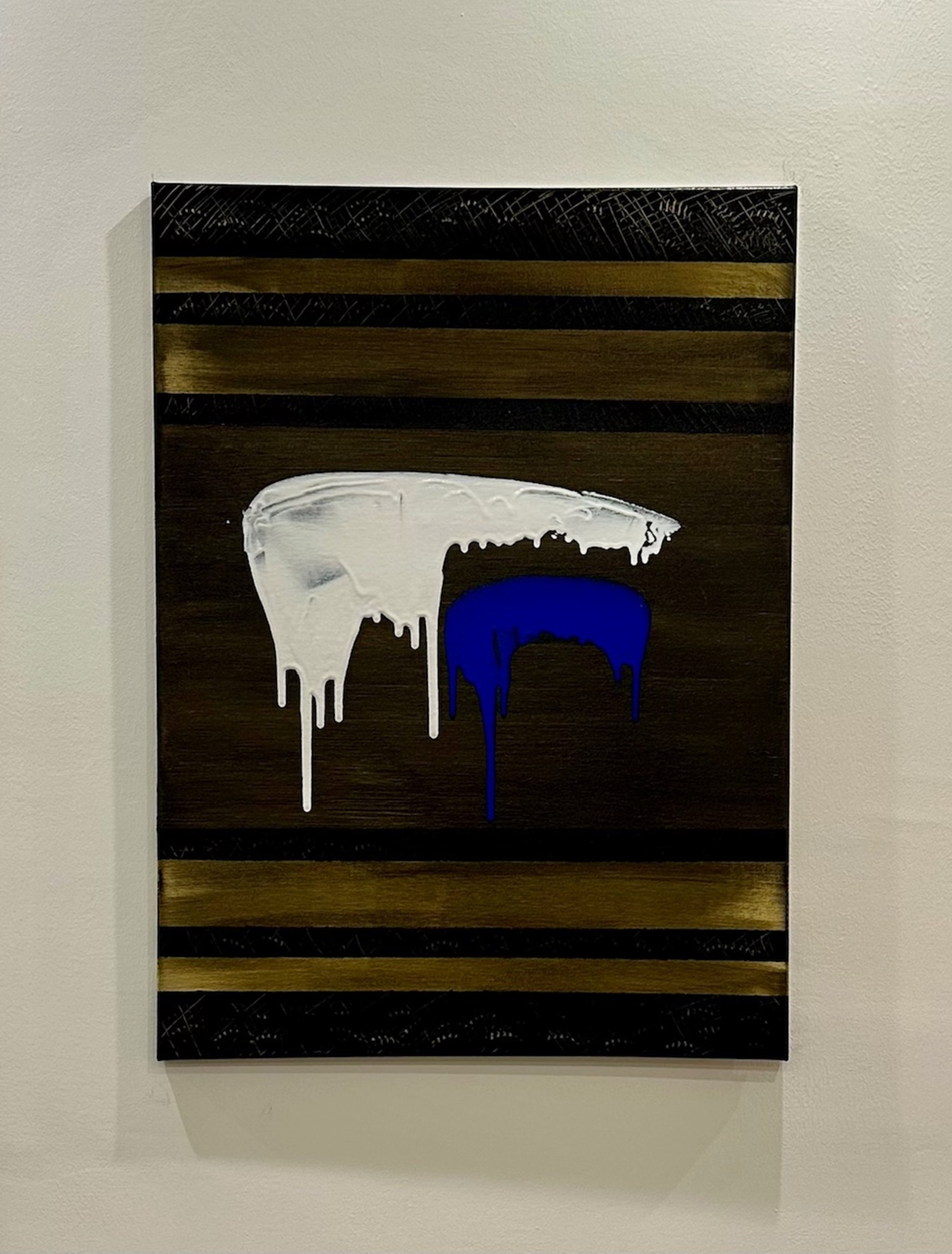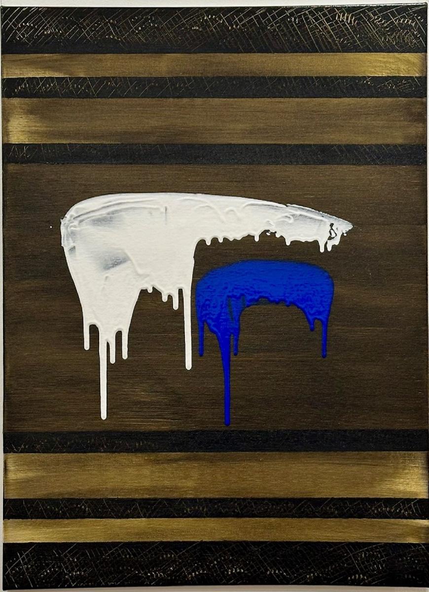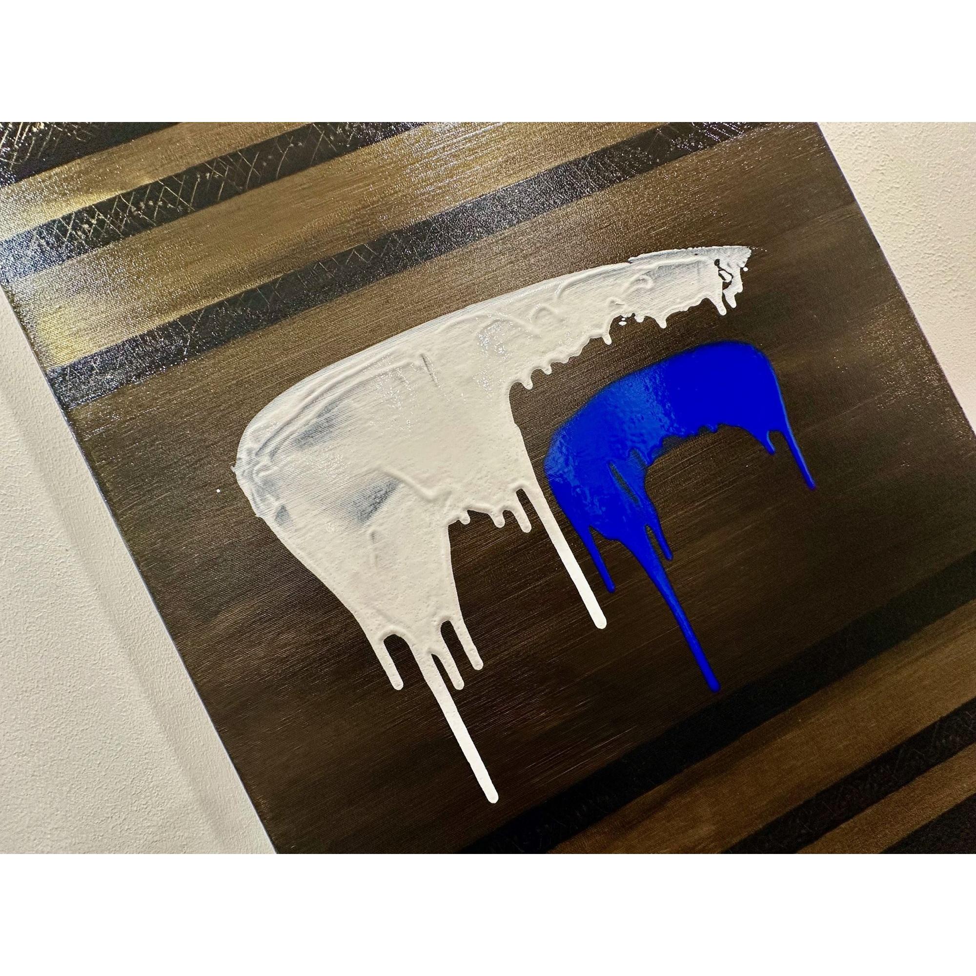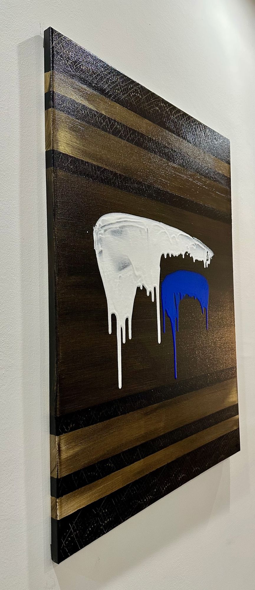 In Soglia III, il gesto si fa sospensione. Il bianco accoglie e trattiene, mentre il blu attraversa lo spazio con una traccia verticale più profonda e inevitabile. Il colore che cola diventa tempo, non caduta.