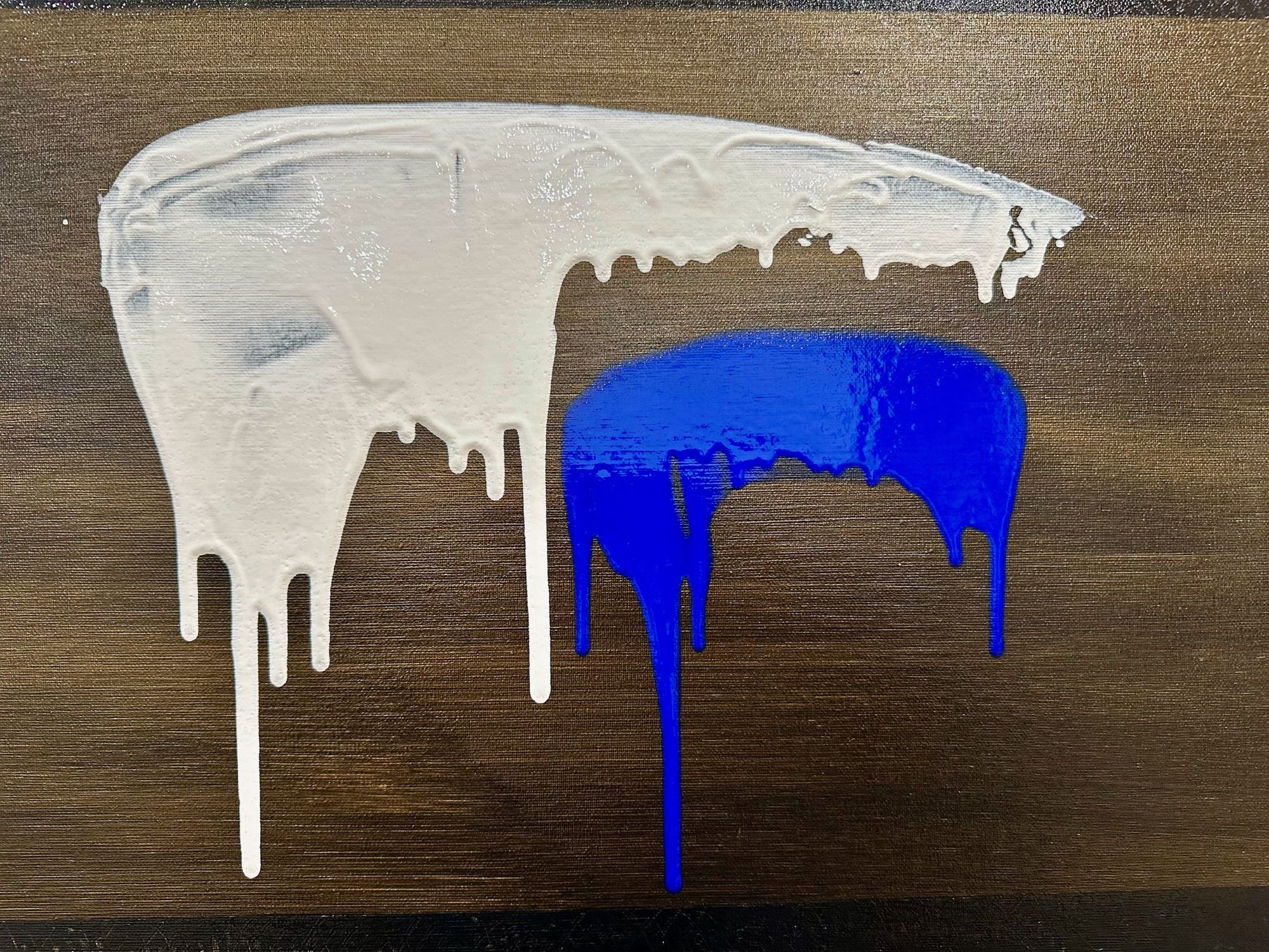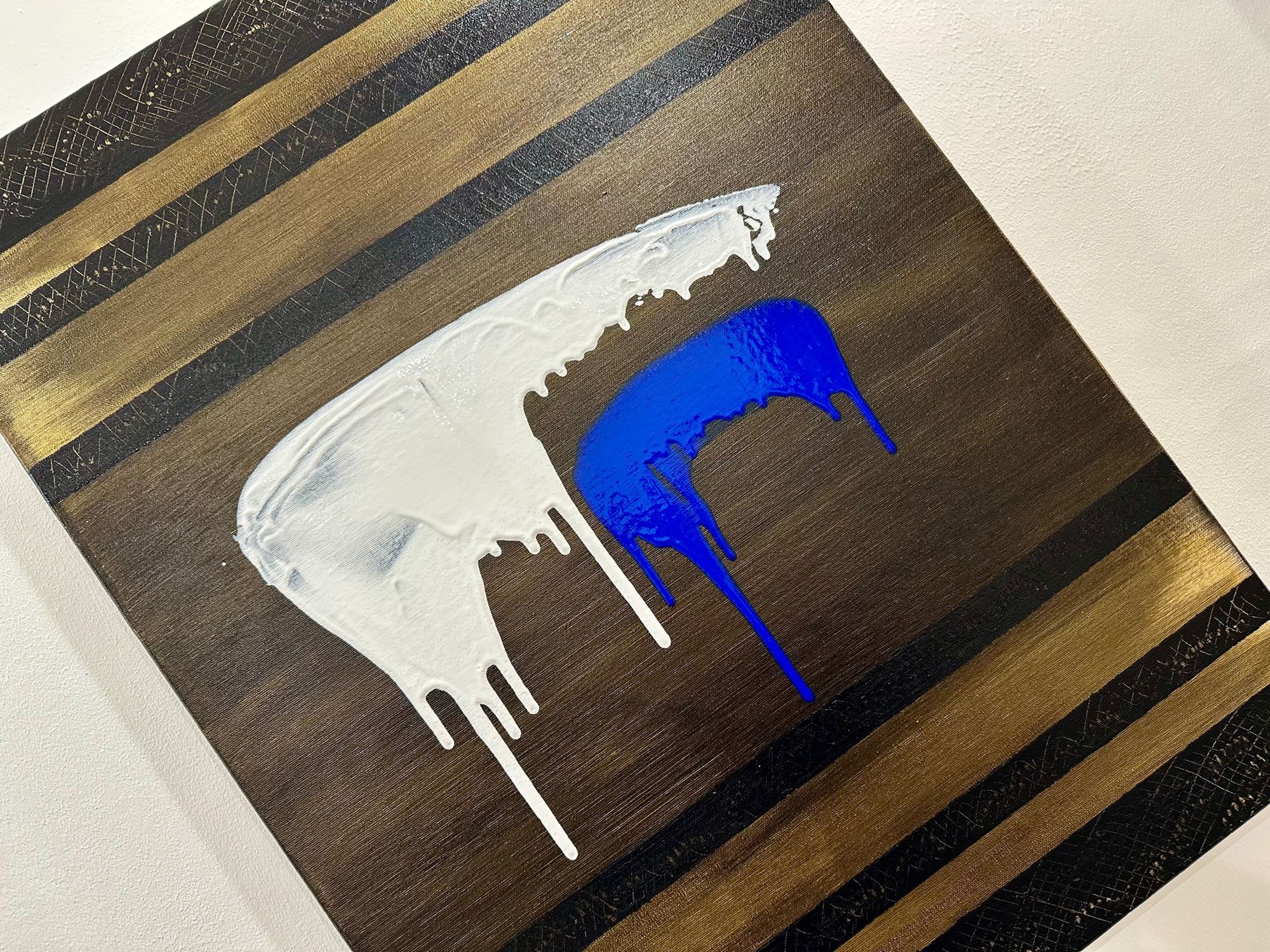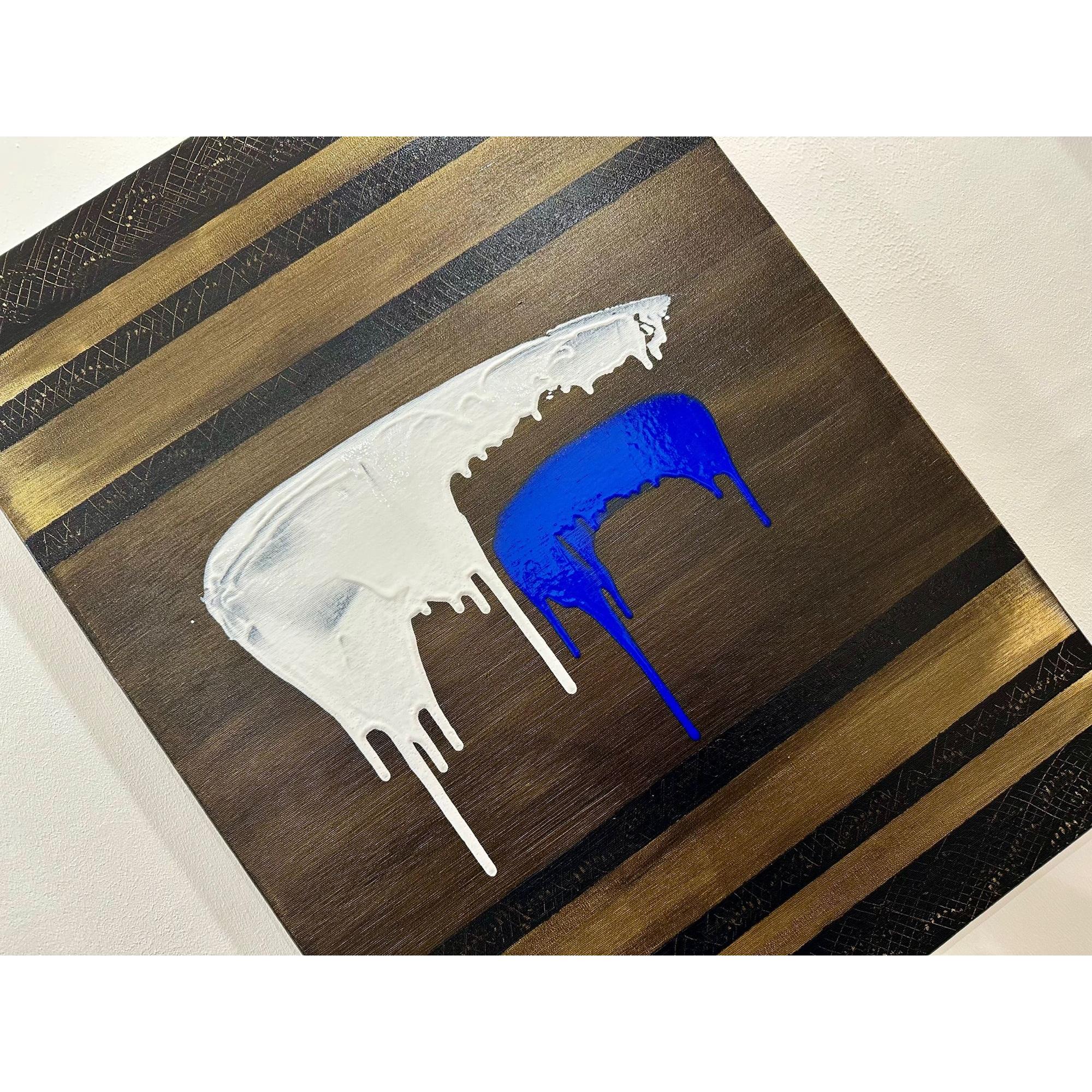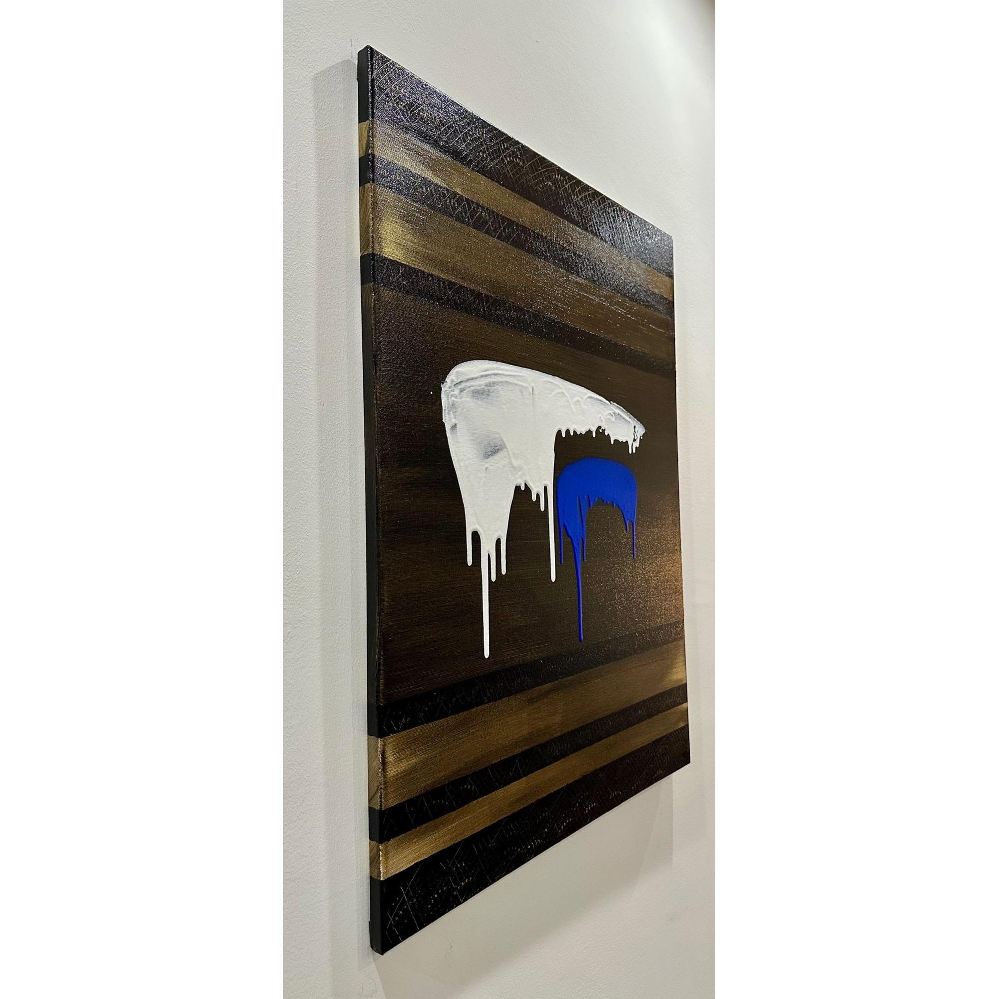 In Soglia III, il gesto si fa sospensione. Il bianco accoglie e trattiene, mentre il blu attraversa lo spazio con una traccia verticale più profonda e inevitabile. Il colore che cola diventa tempo, non caduta.