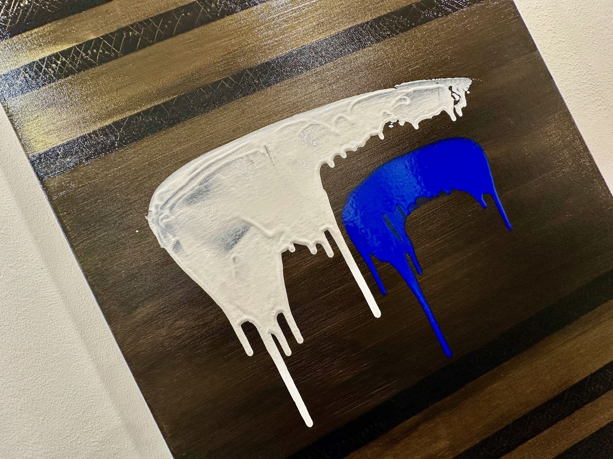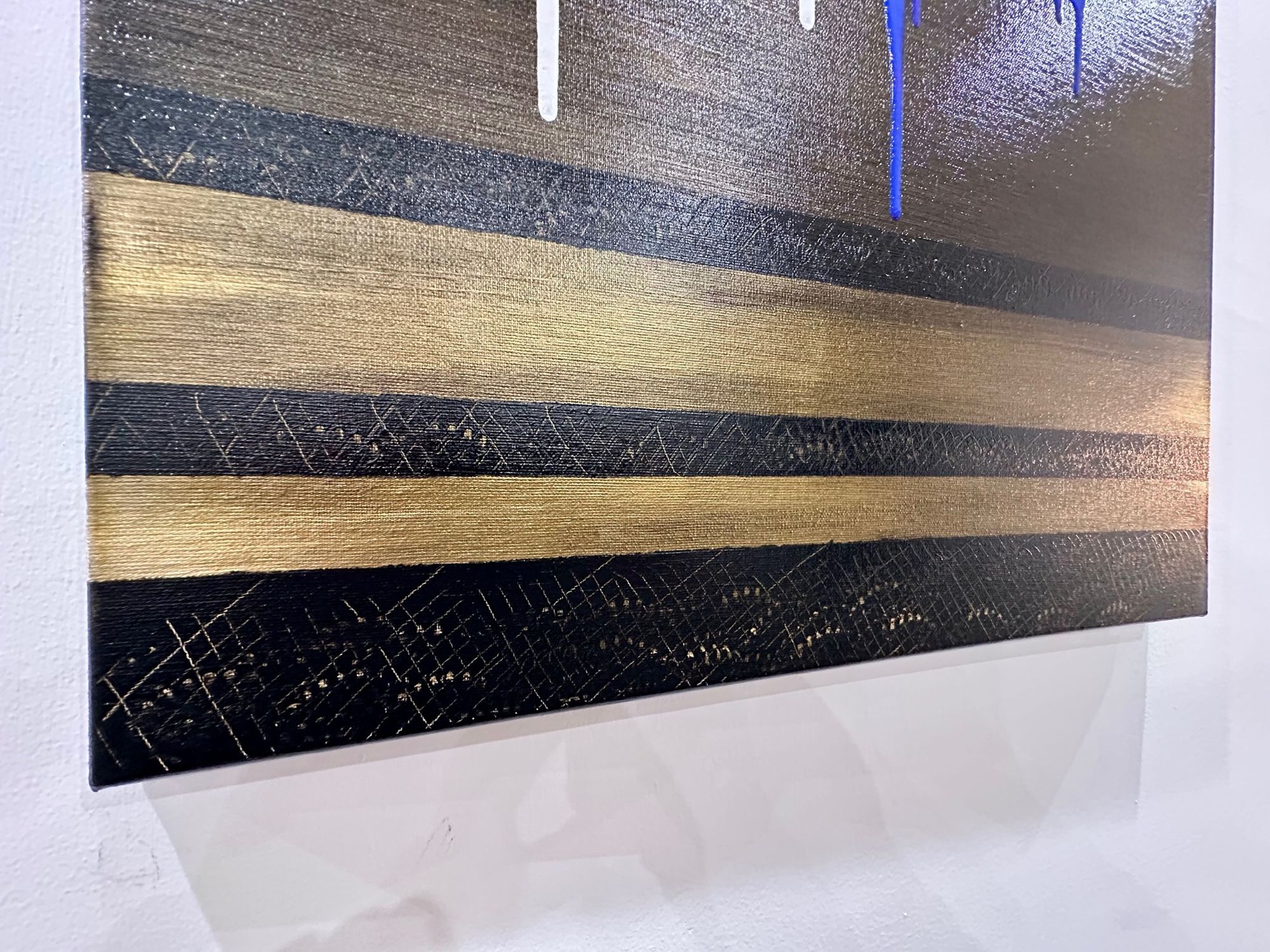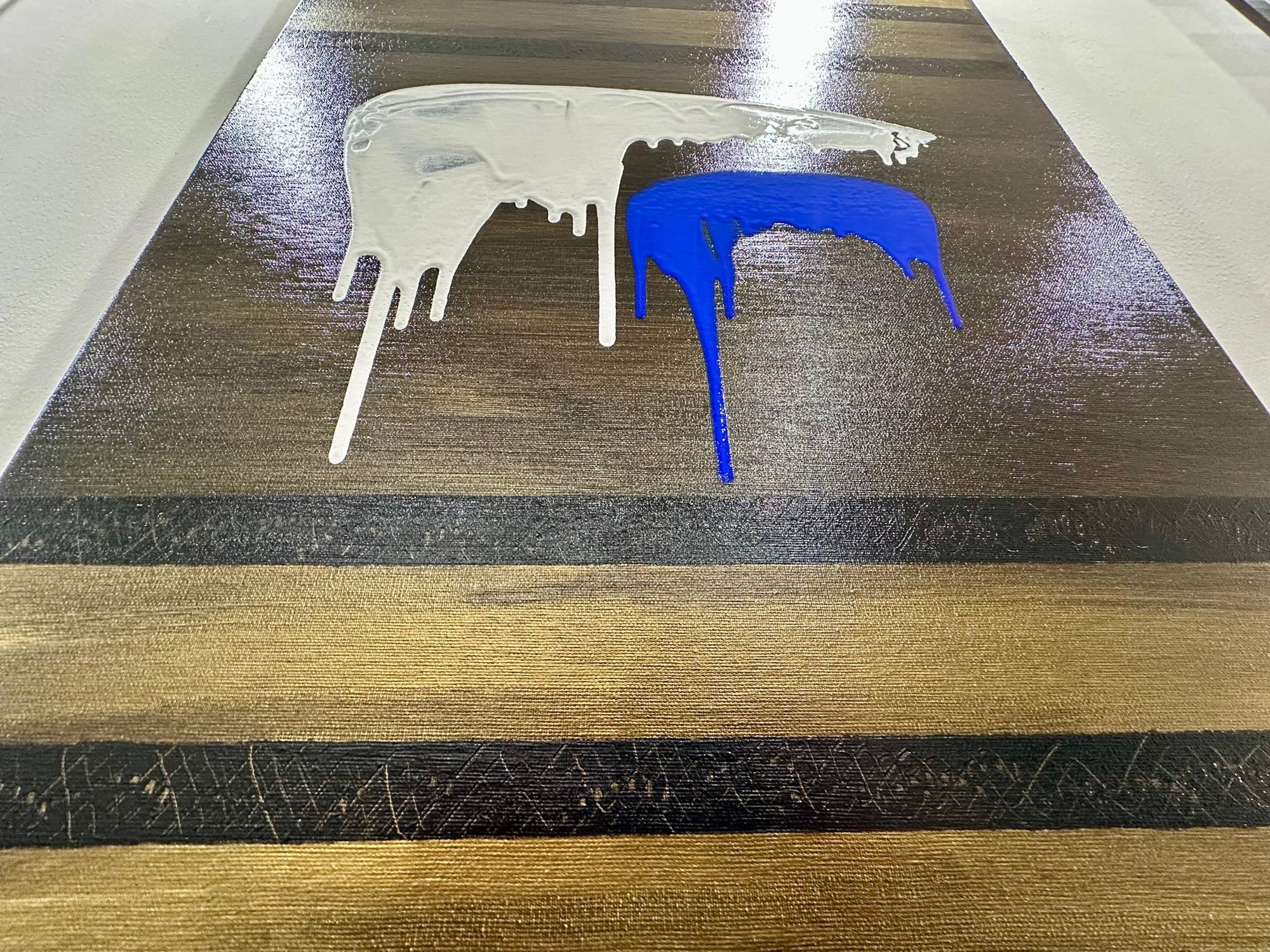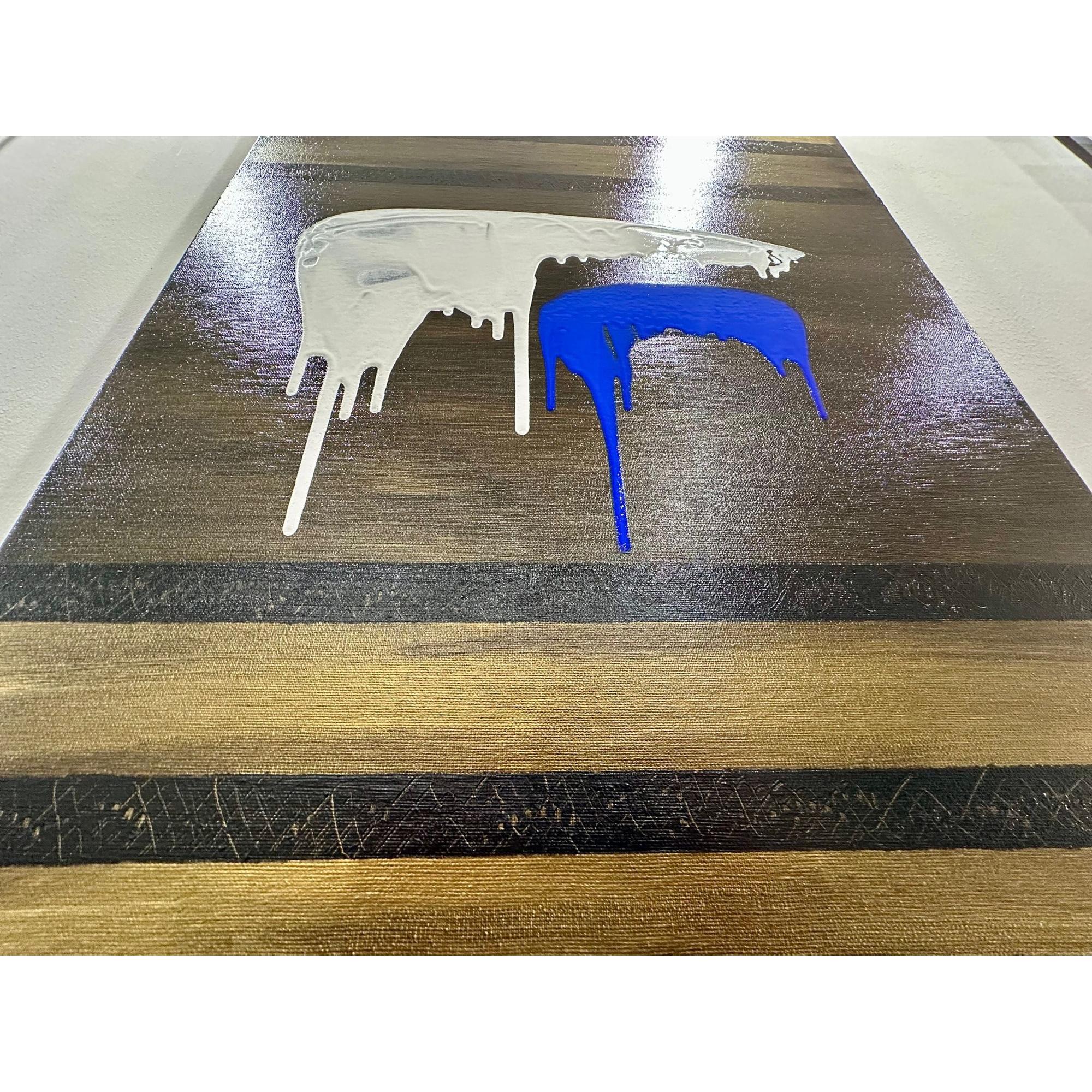 In Soglia III, il gesto si fa sospensione. Il bianco accoglie e trattiene, mentre il blu attraversa lo spazio con una traccia verticale più profonda e inevitabile. Il colore che cola diventa tempo, non caduta.