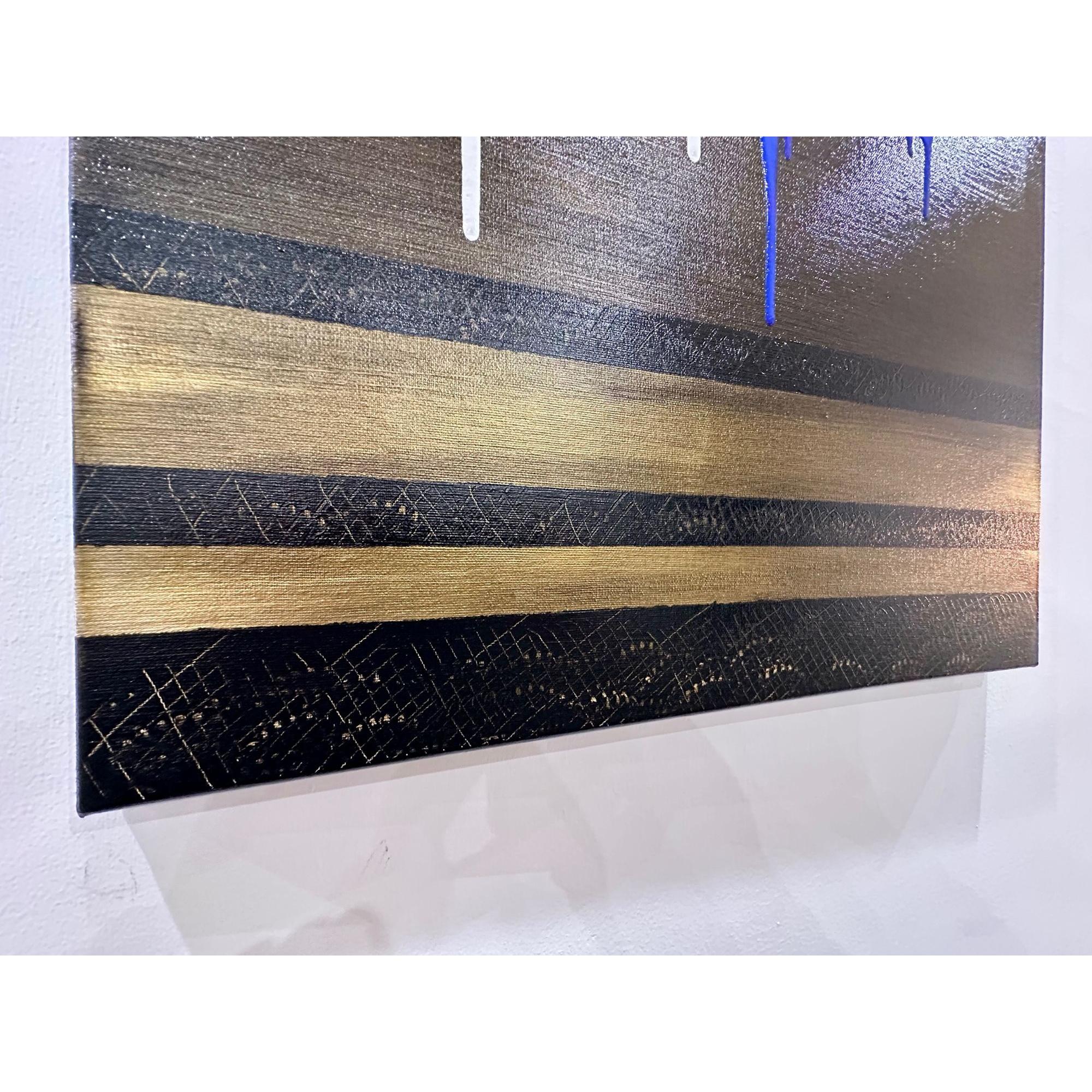 Le bande scure e le campiture dorate definiscono una soglia rituale di contenimento e passaggio. Qui il gesto non cerca risoluzione, ma permane come traccia e memoria, chiudendo la serie in una dimensione meditativa.