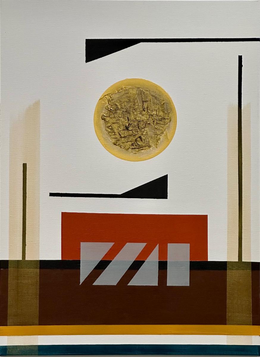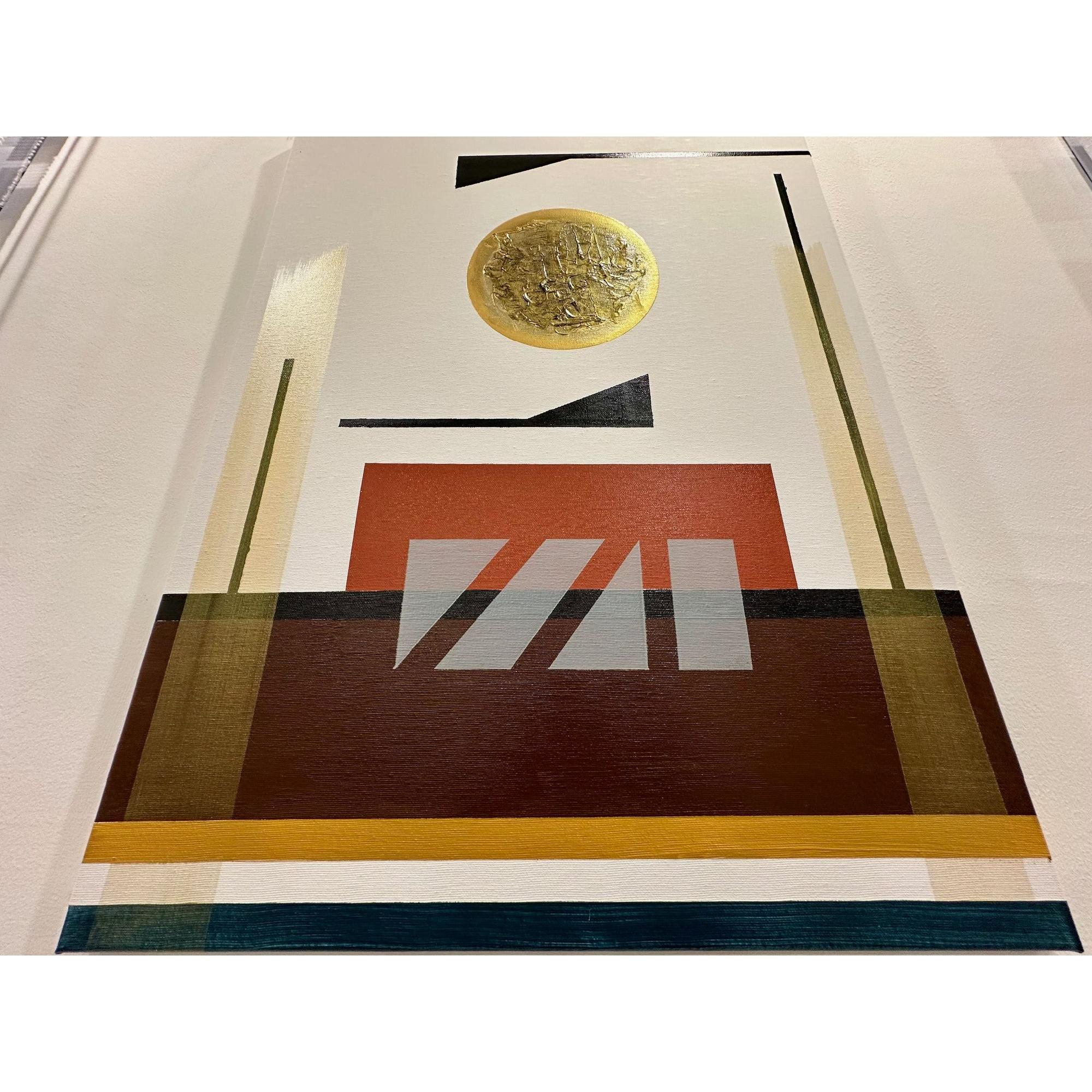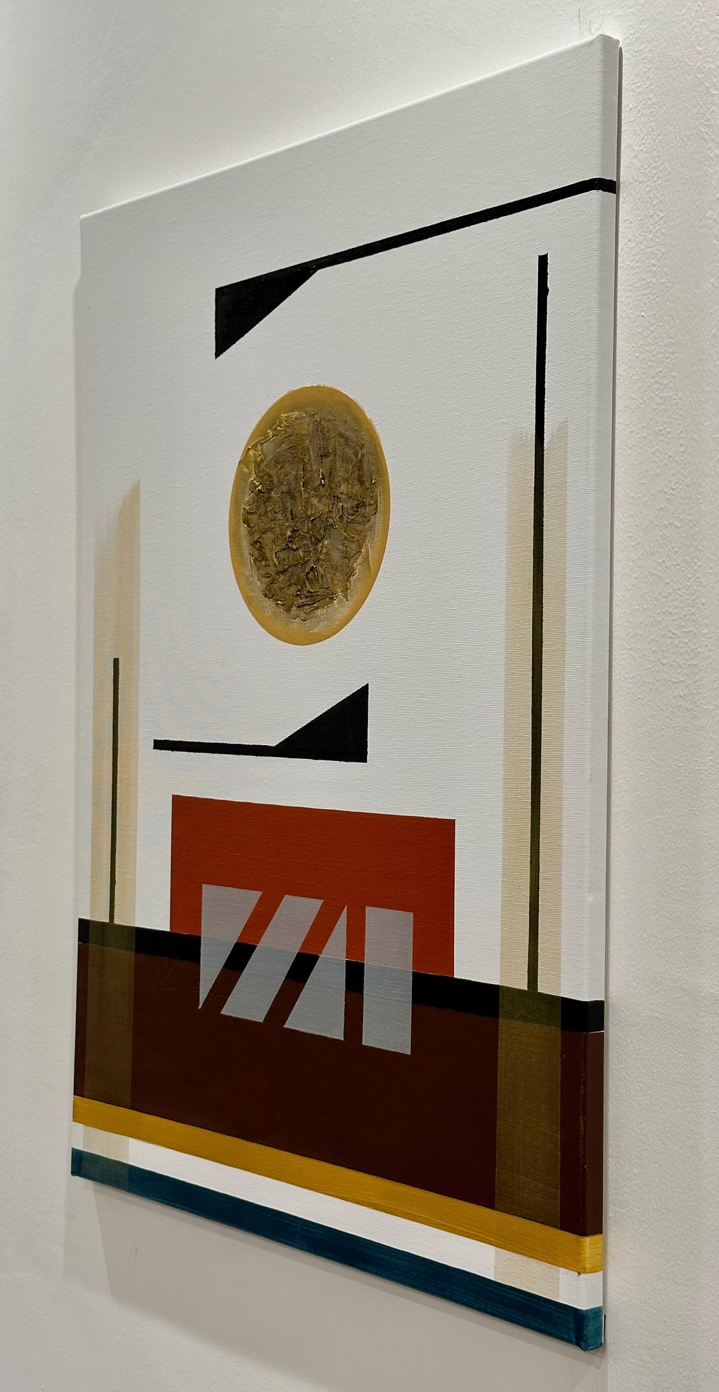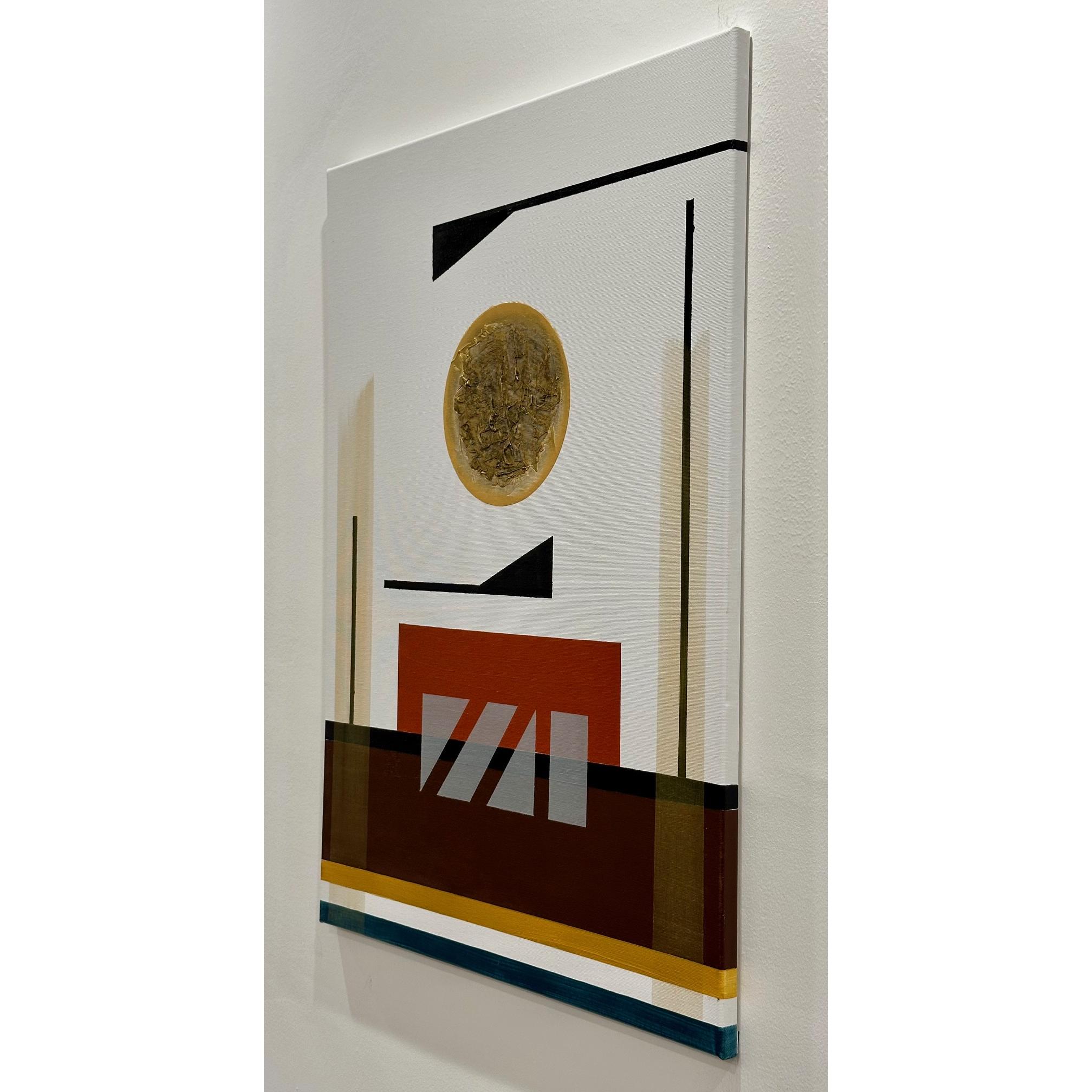 L’opera si configura come una struttura visiva essenziale, in cui il linguaggio geometrico costruisce uno spazio di sospensione e misura. Le forme, nette e calibrate, definiscono un’architettura mentale più che fisica, dove ogni elemento è posto in relazione di equilibrio e tensione.