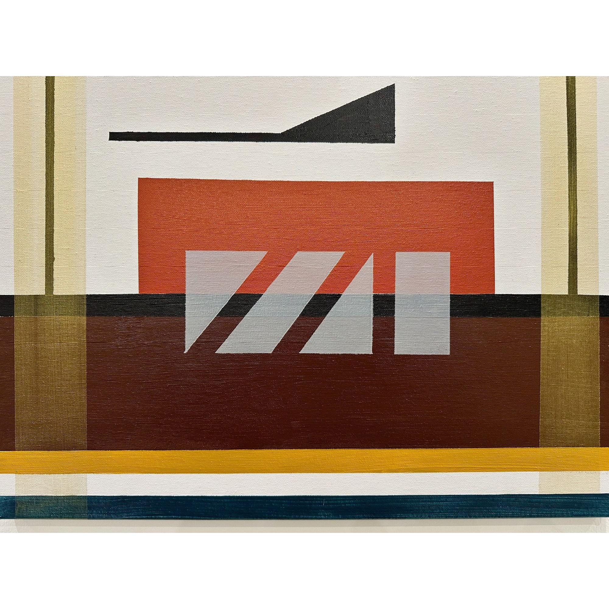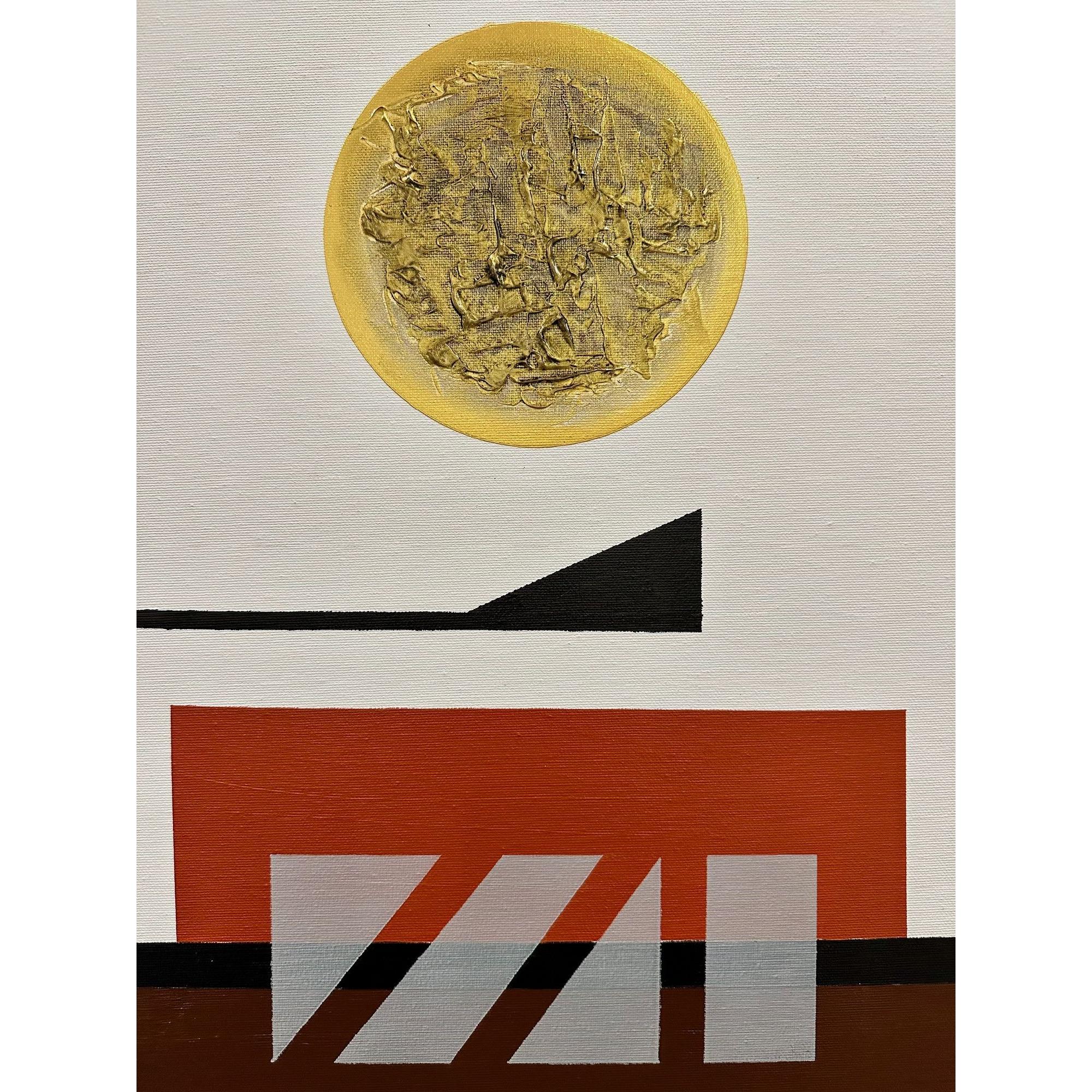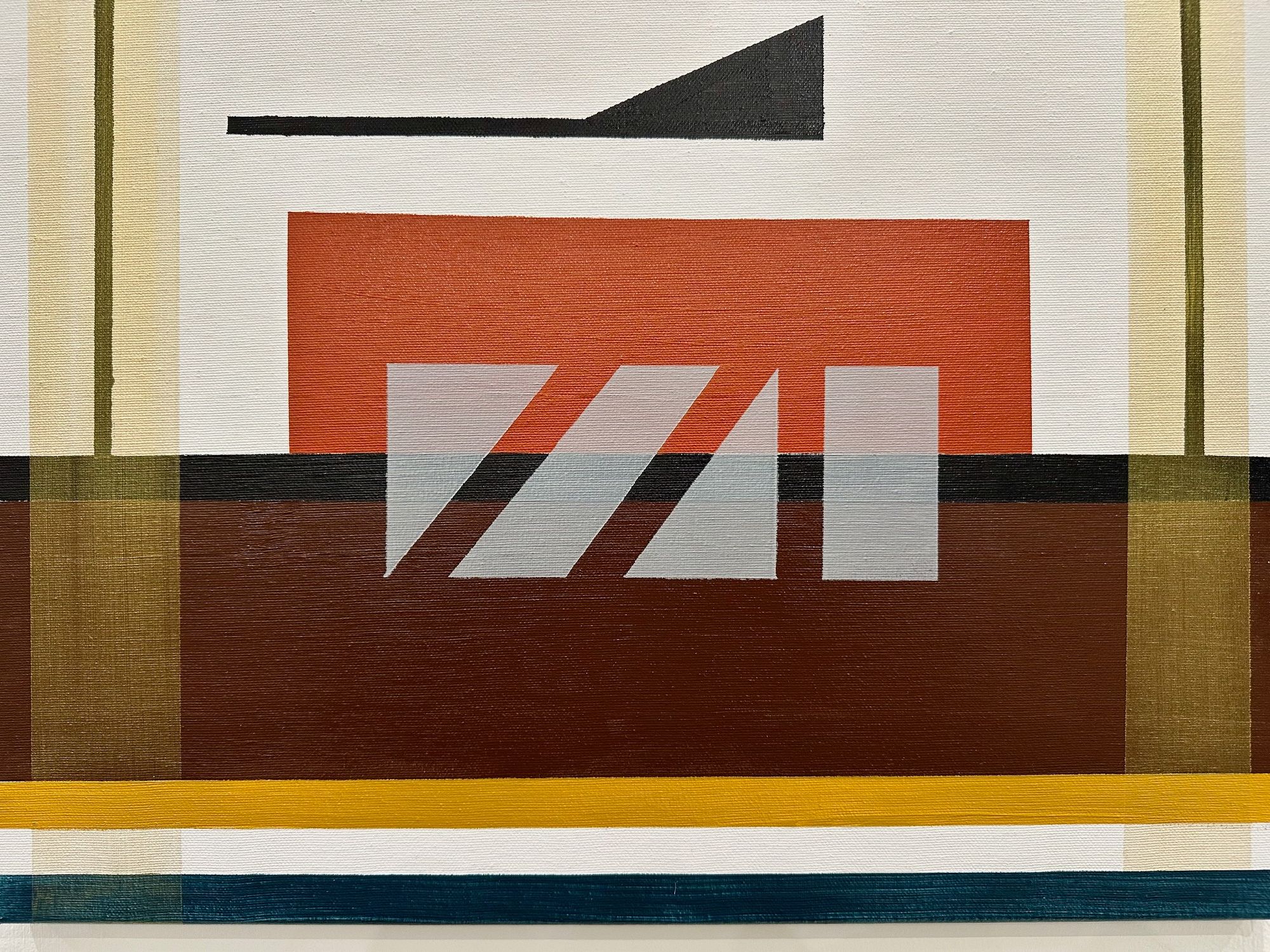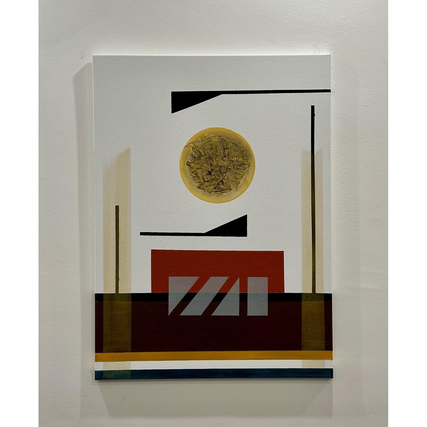L’opera si configura come una struttura visiva essenziale, in cui il linguaggio geometrico costruisce uno spazio di sospensione e misura. Le forme, nette e calibrate, definiscono un’architettura mentale più che fisica, dove ogni elemento è posto in relazione di equilibrio e tensione.