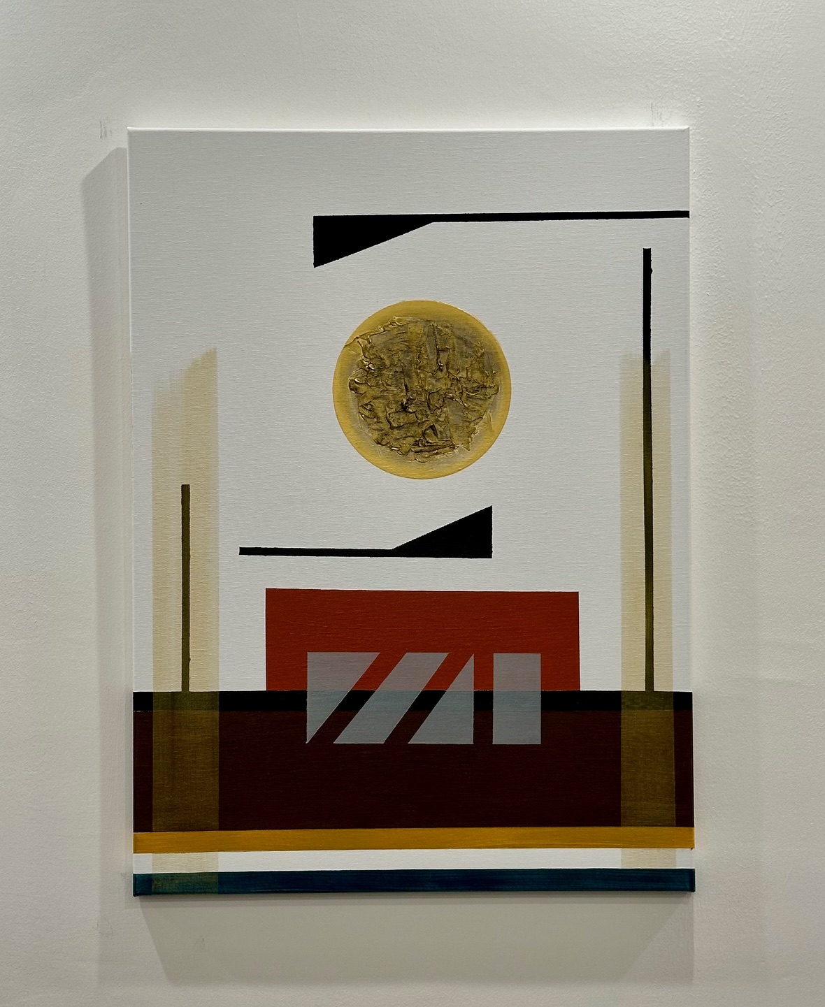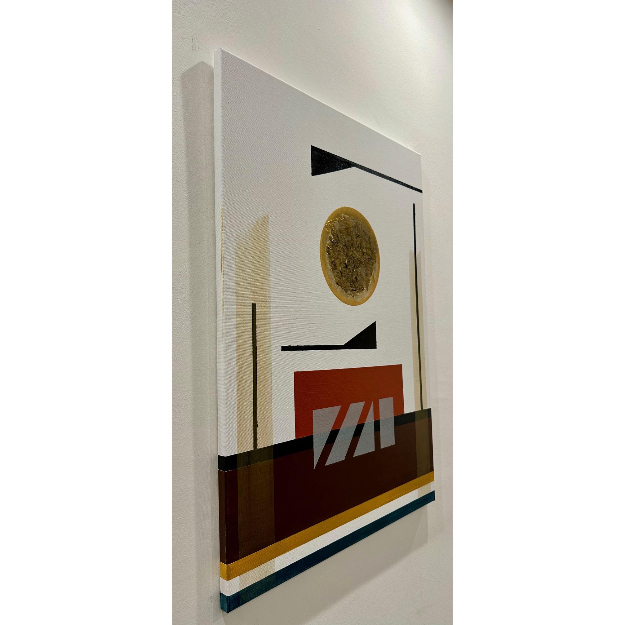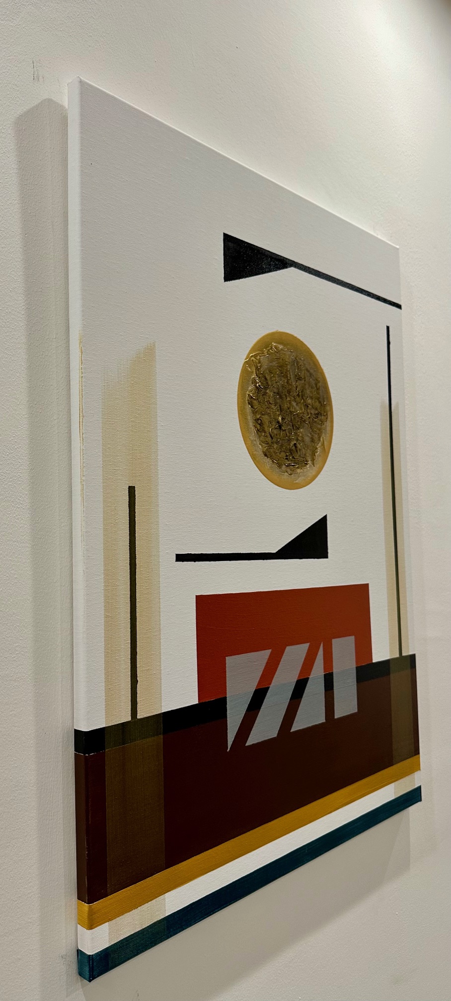 Al centro, il nucleo circolare materico interrompe la linearità e diventa punto di concentrazione, luogo di silenzio attivo e di presenza. Le campiture cromatiche — il bianco come campo di attesa, i toni terrosi e il rosso profondo come fondamento — radicano la composizione in una dimensione stabile e contemplativa.