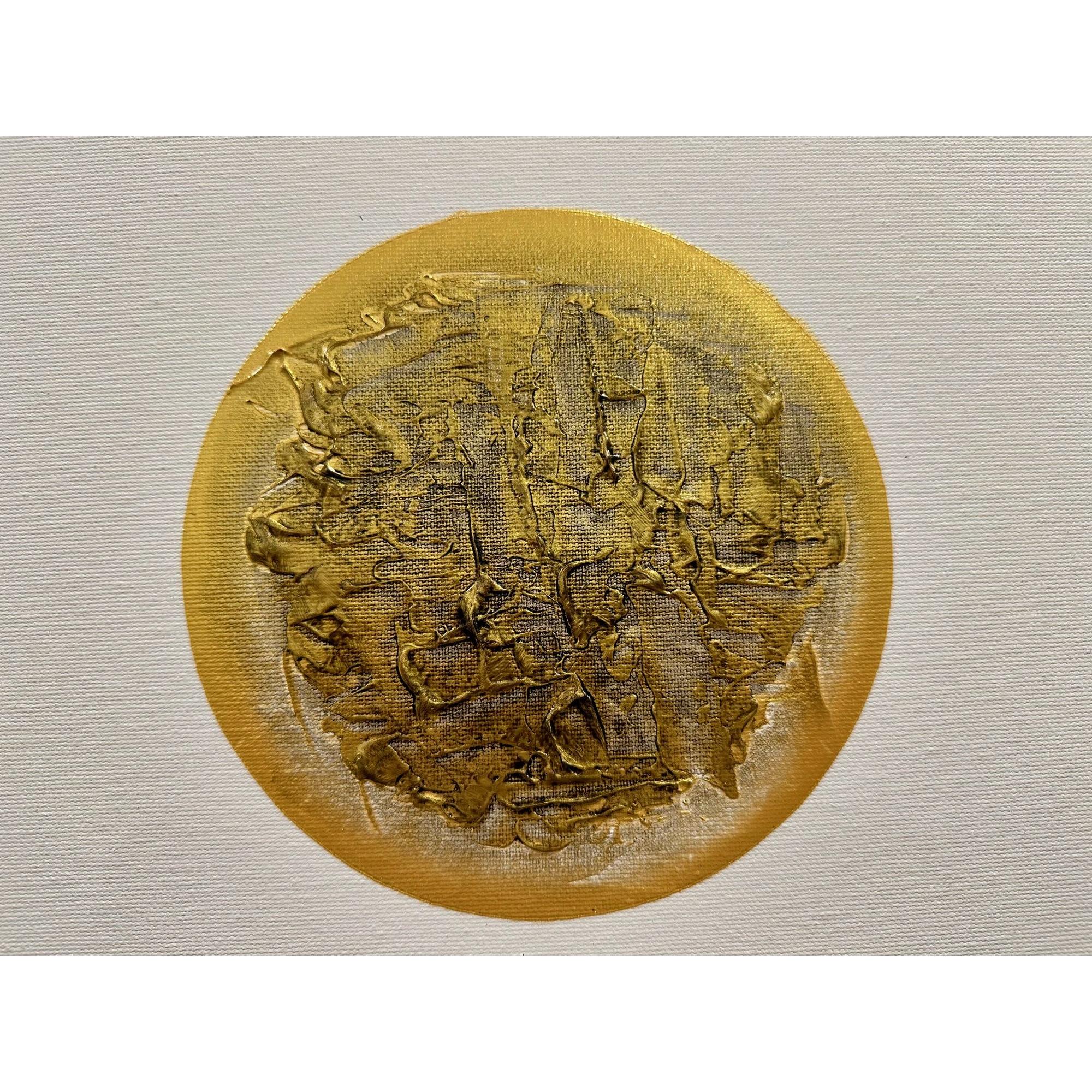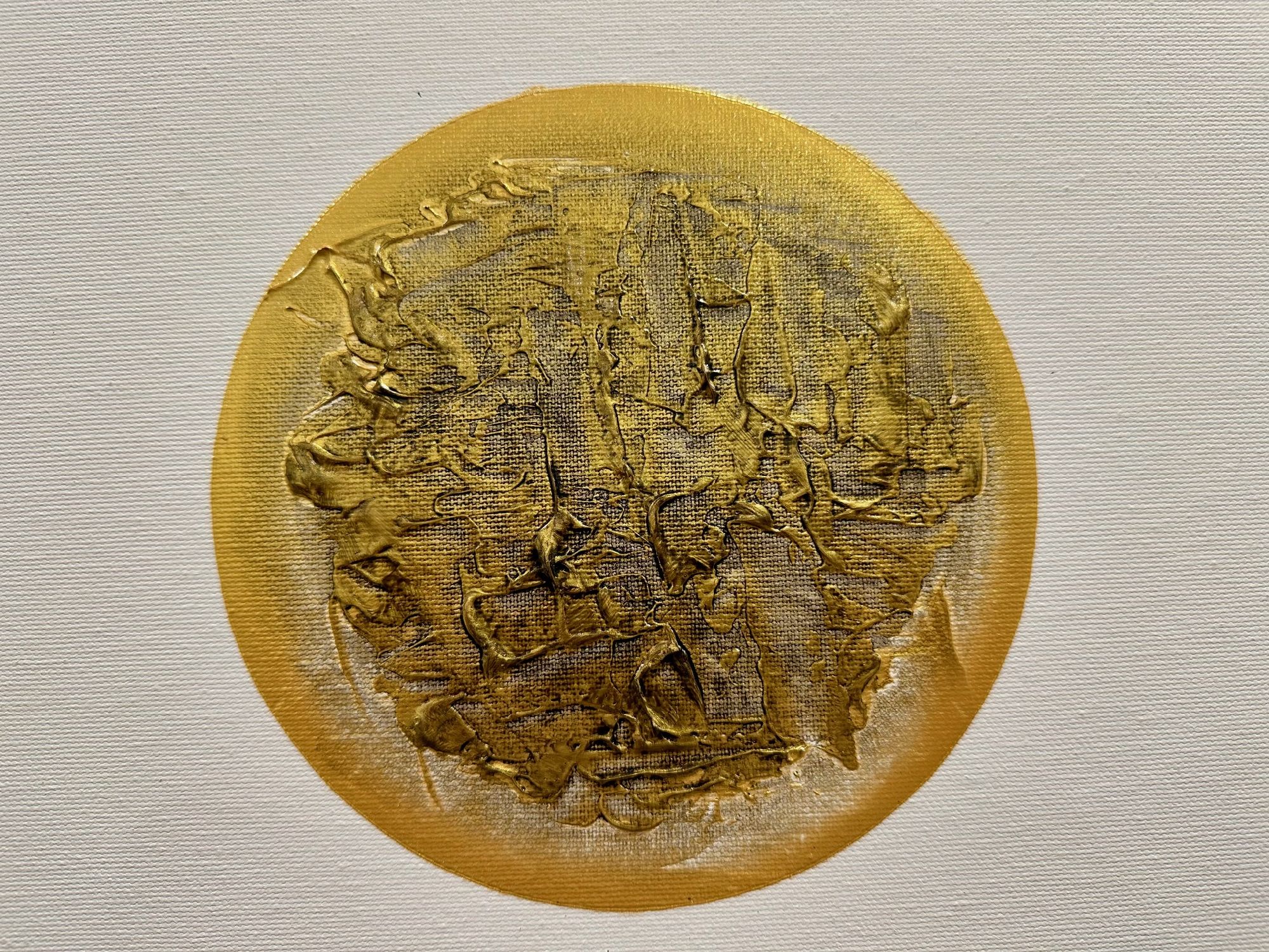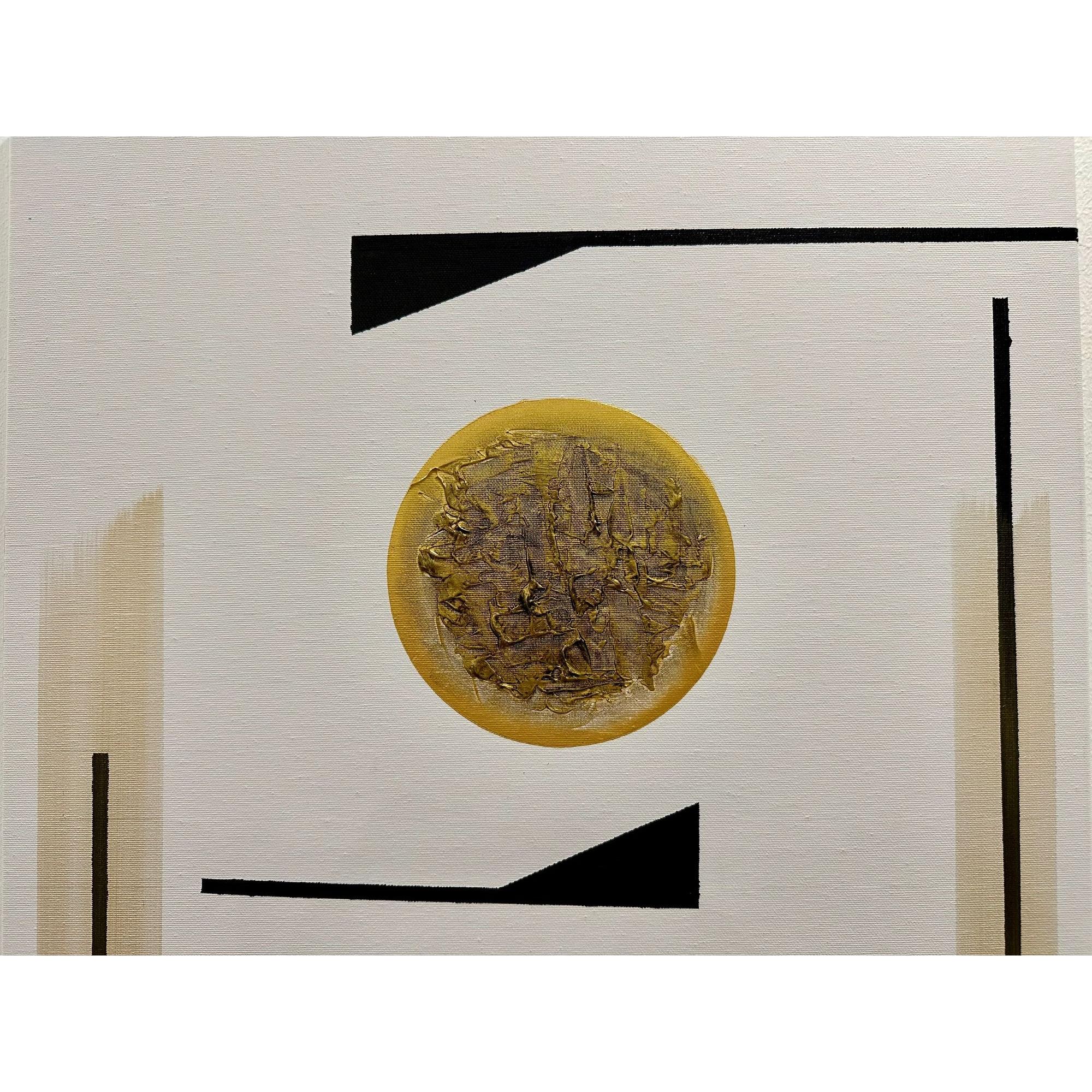 Al centro, il nucleo circolare materico interrompe la linearità e diventa punto di concentrazione, luogo di silenzio attivo e di presenza. Le campiture cromatiche — il bianco come campo di attesa, i toni terrosi e il rosso profondo come fondamento — radicano la composizione in una dimensione stabile e contemplativa.