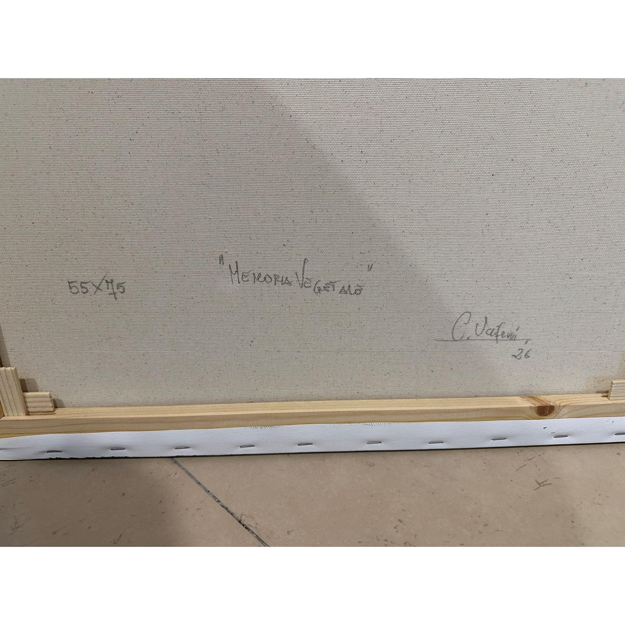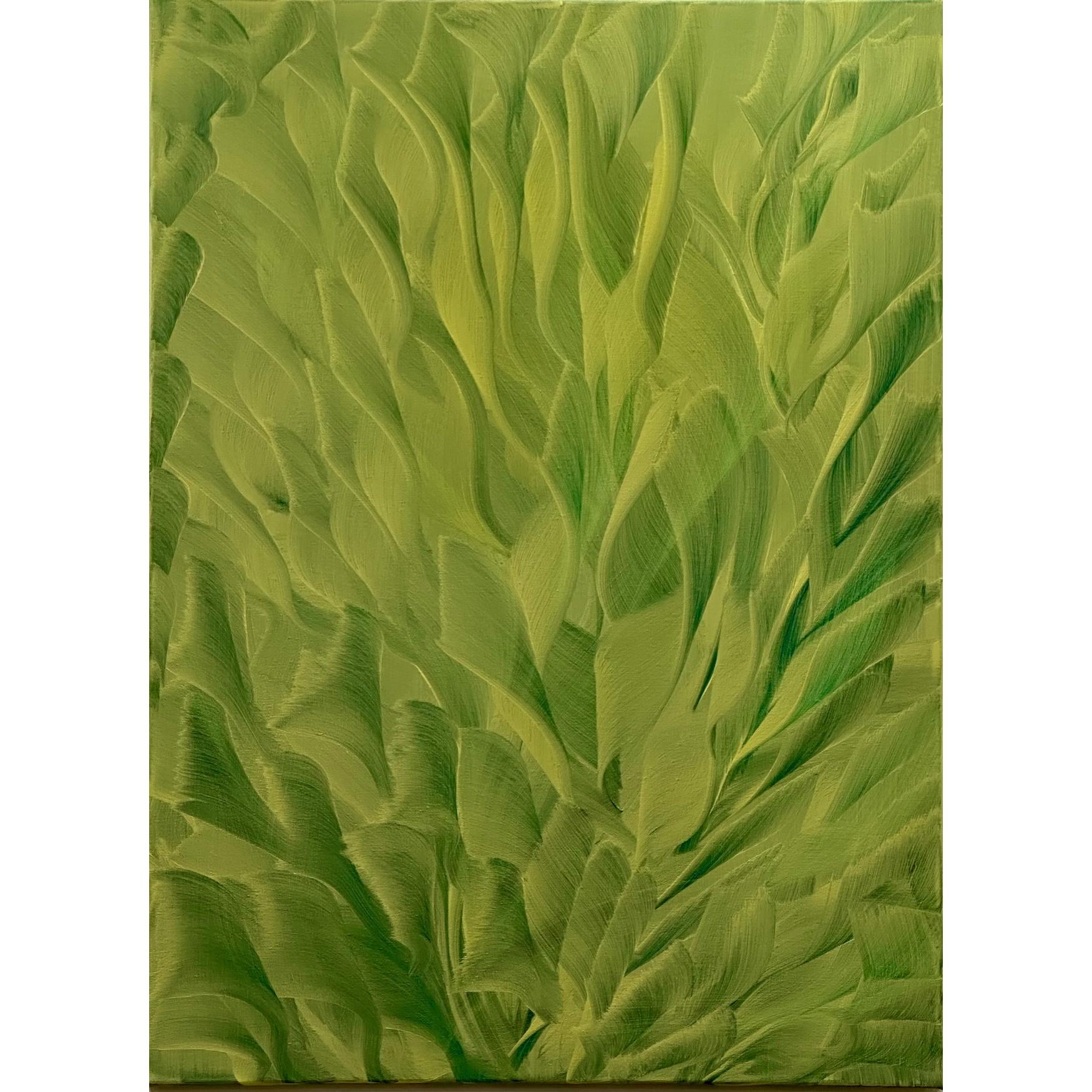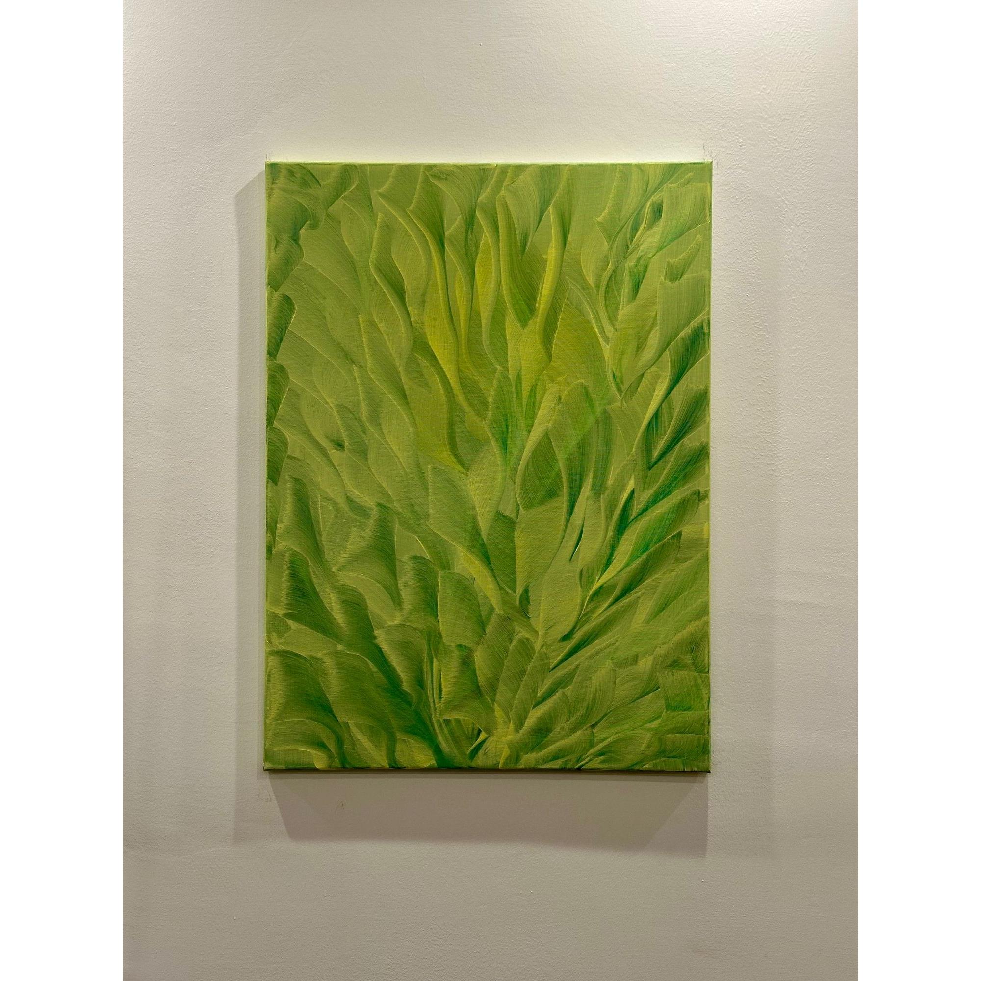 Memoria vegetale nasce da una stratificazione di verdi che si muovono come tracce organiche, segni di una crescita silenziosa e continua. Il gesto pittorico, ampio e fluido, non descrive una forma riconoscibile ma evoca un processo: quello della natura che conserva, rigenera, ricorda.