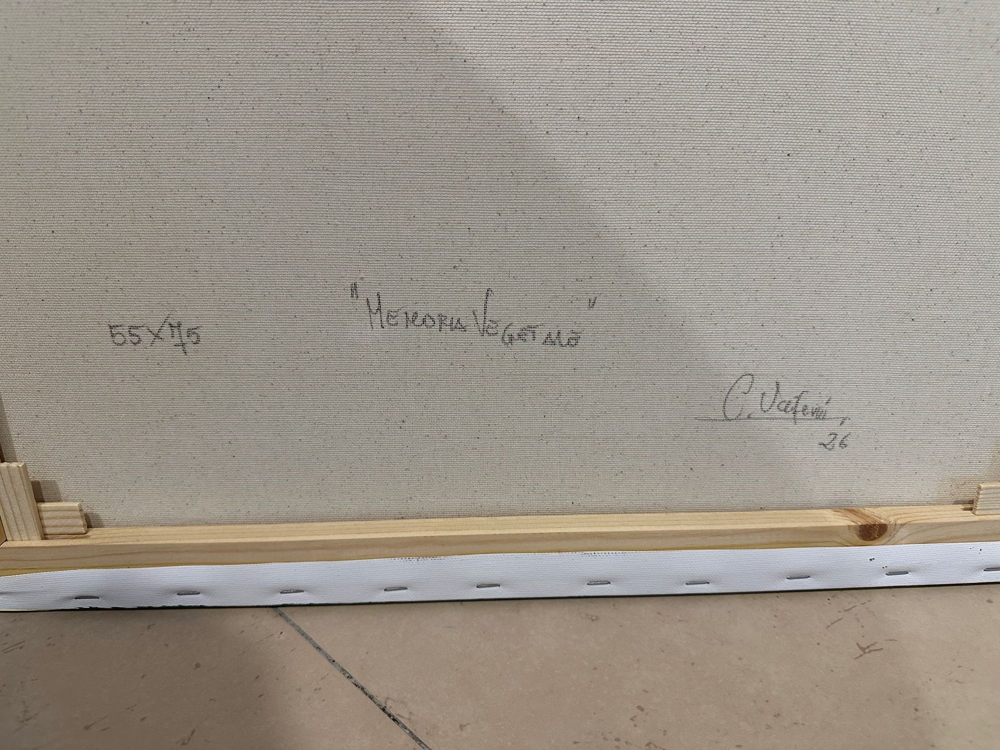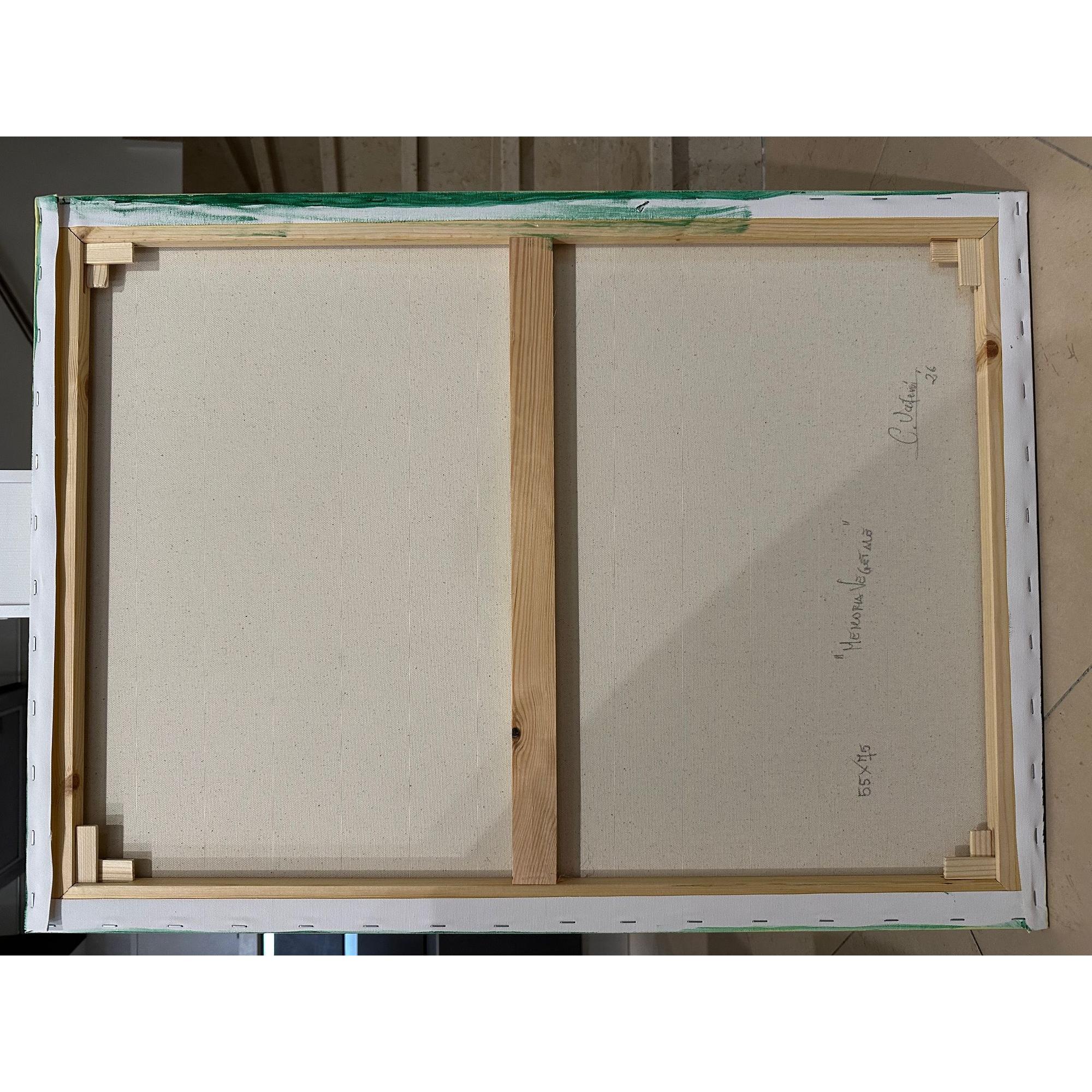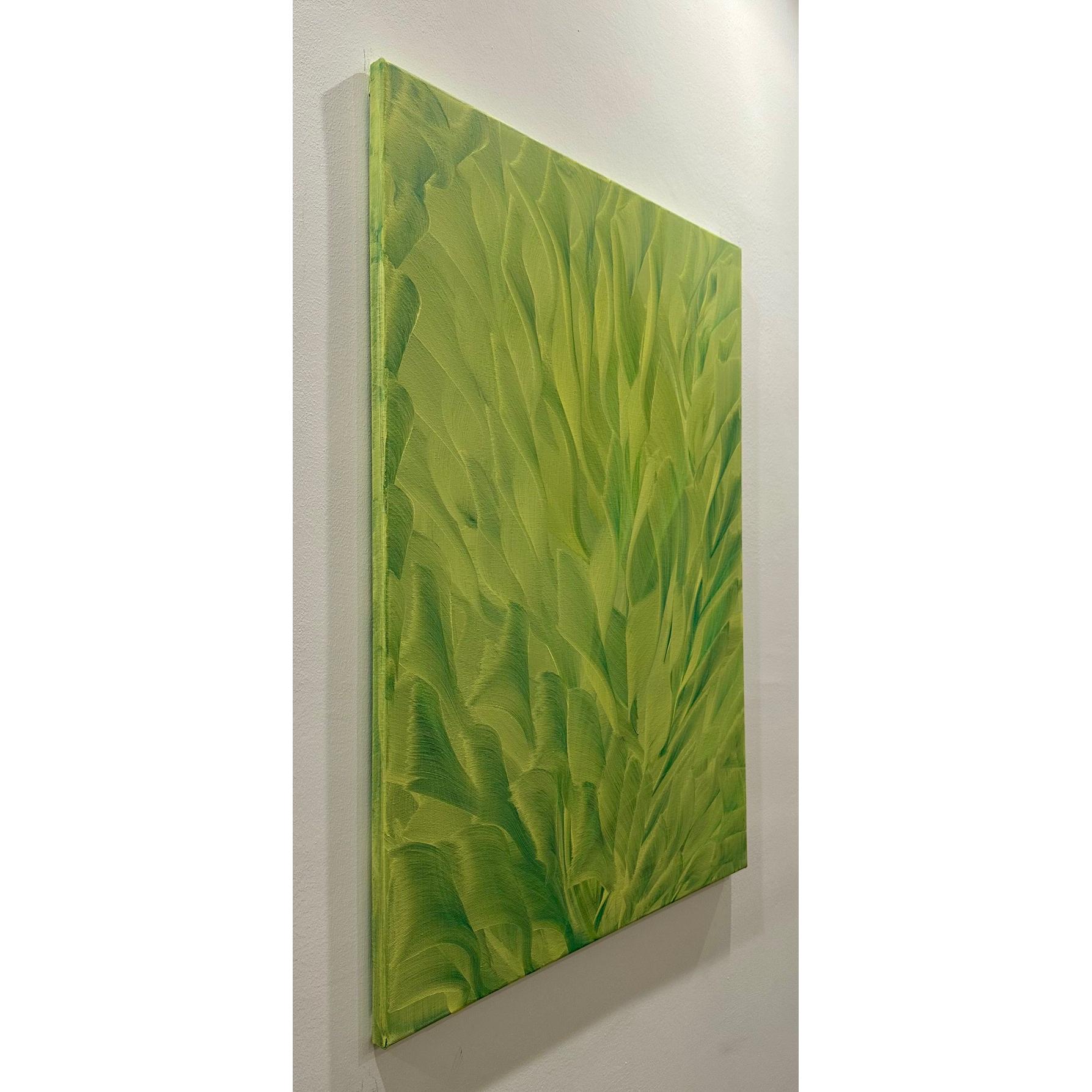 Memoria vegetale nasce da una stratificazione di verdi che si muovono come tracce organiche, segni di una crescita silenziosa e continua. Il gesto pittorico, ampio e fluido, non descrive una forma riconoscibile ma evoca un processo: quello della natura che conserva, rigenera, ricorda.