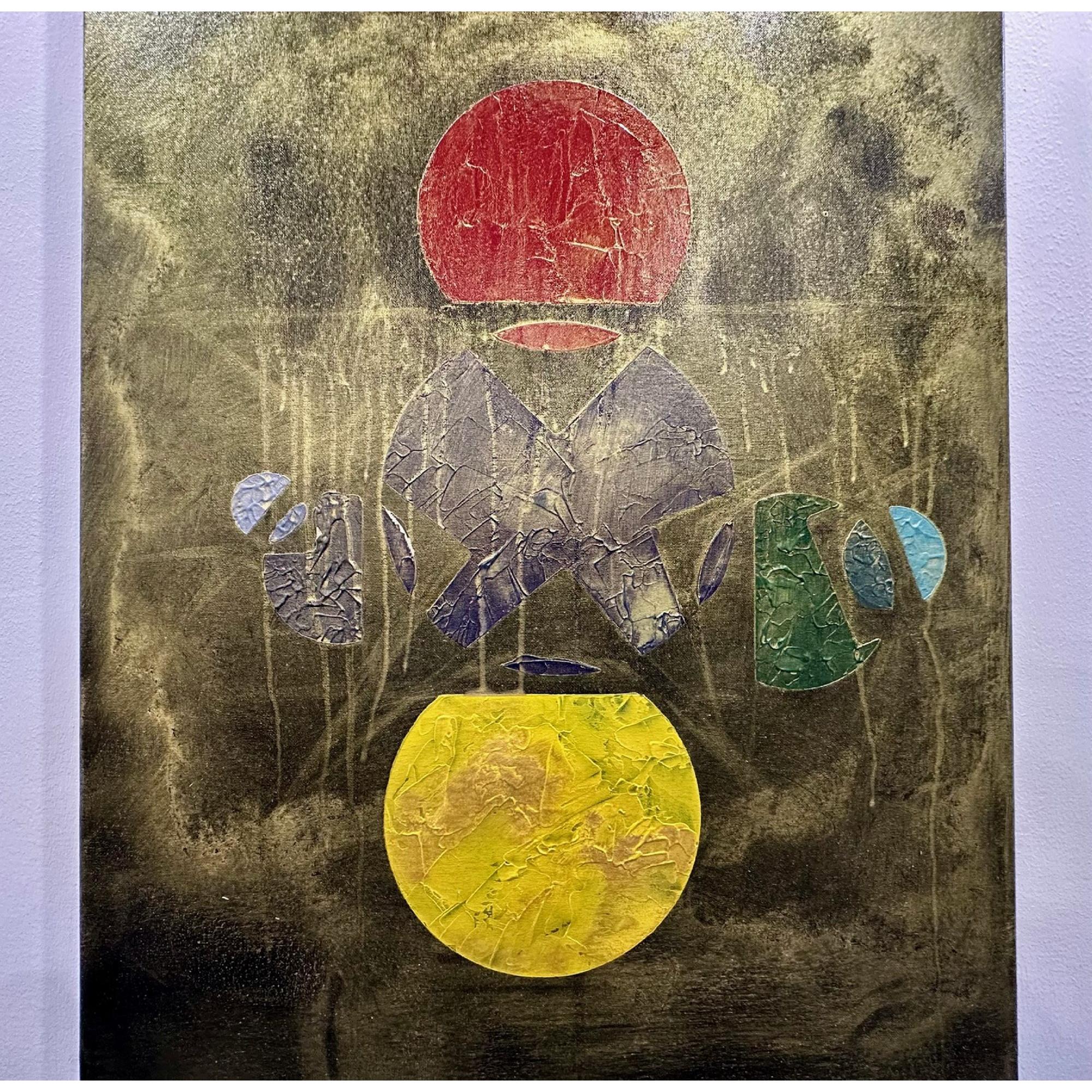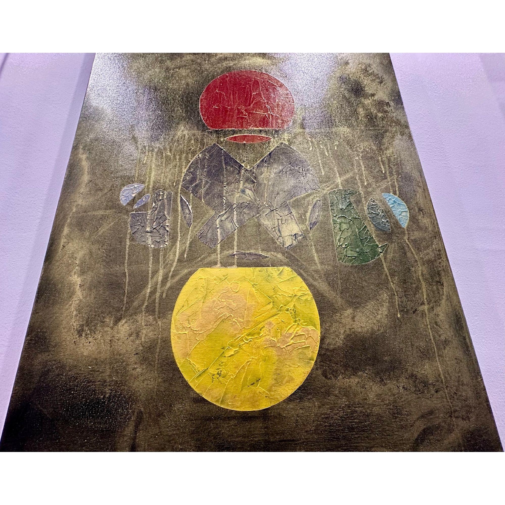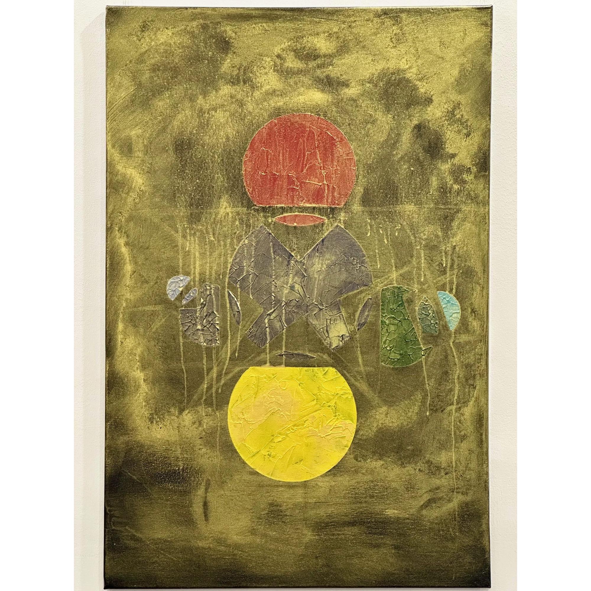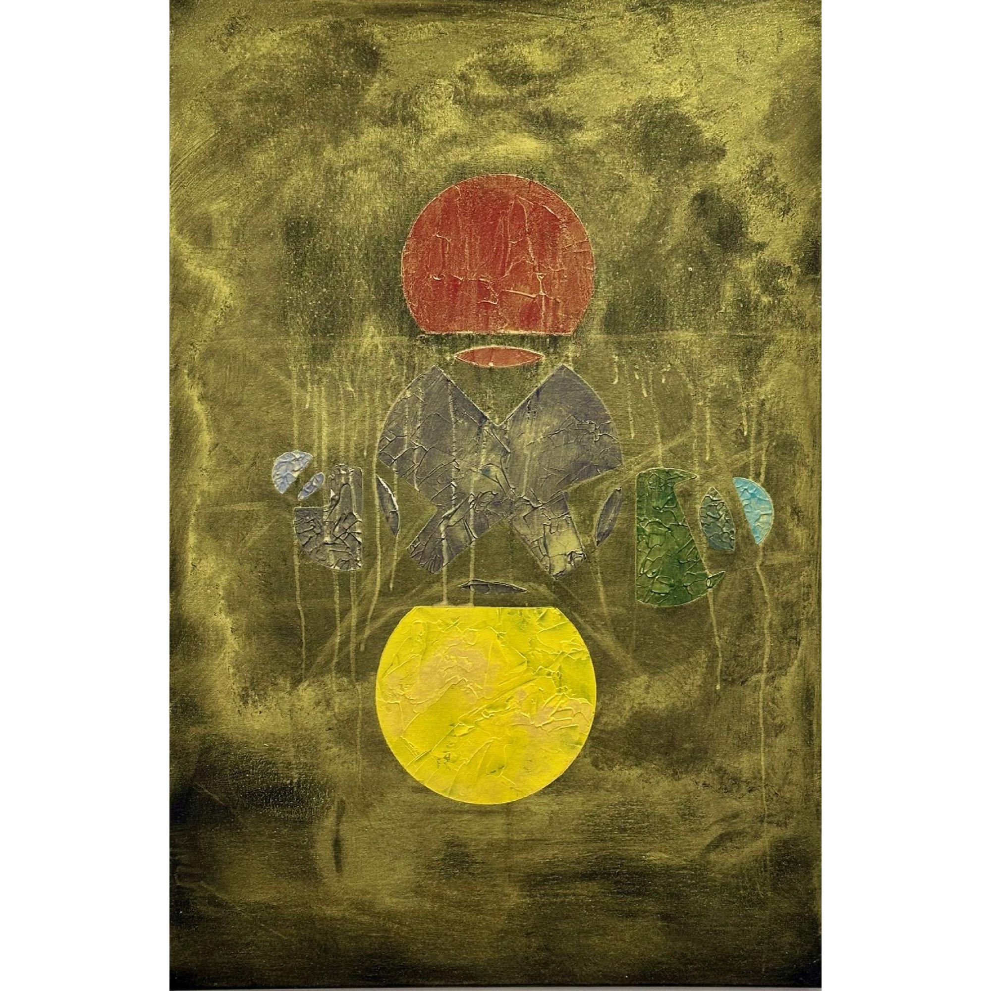 In questa opera costruisco una struttura visiva sospesa tra simbolo e frammento. Due forme circolari, poste in alto e in basso, evocano due poli energetici — due soli — tra i quali prende forma un sistema fragile di segni e geometrie.