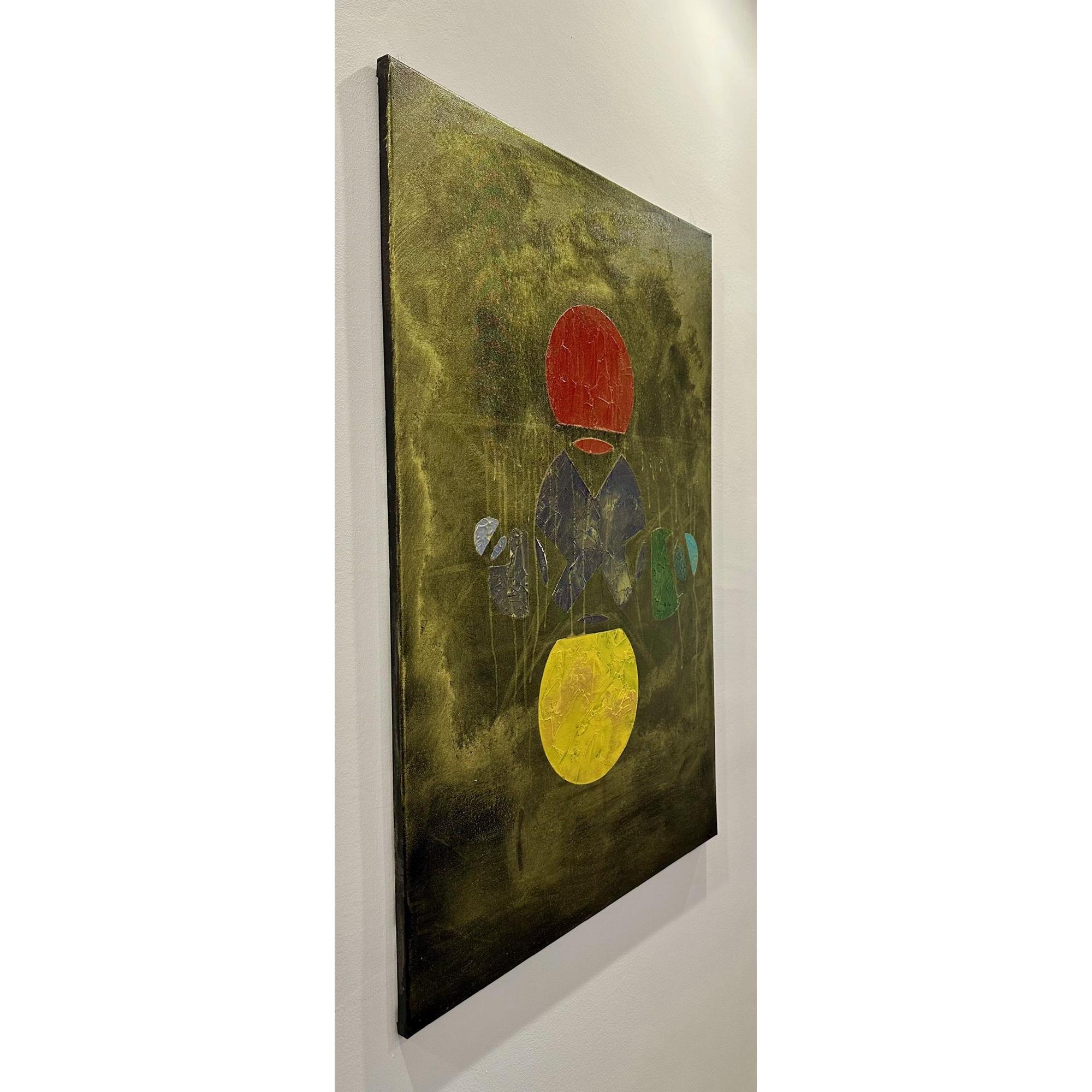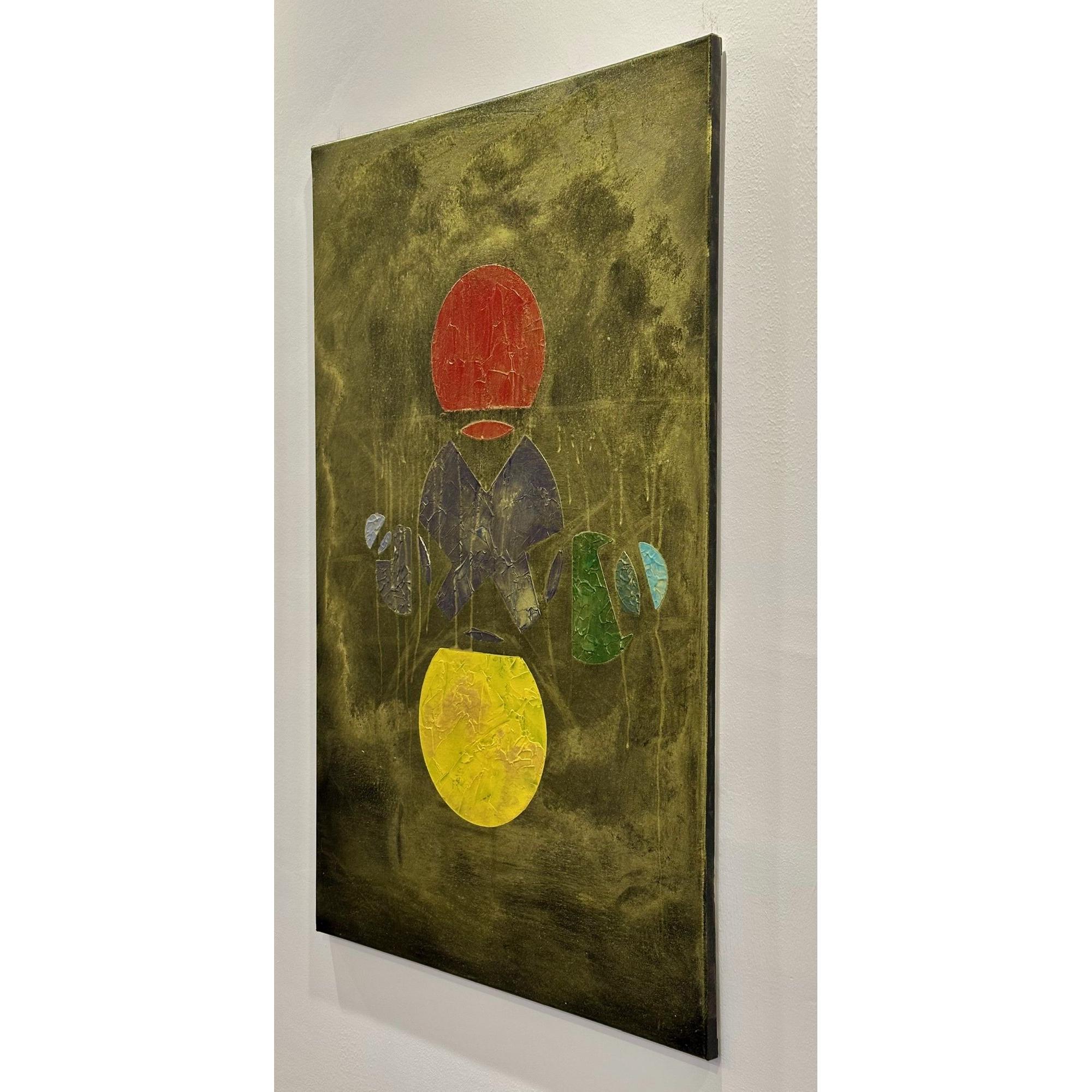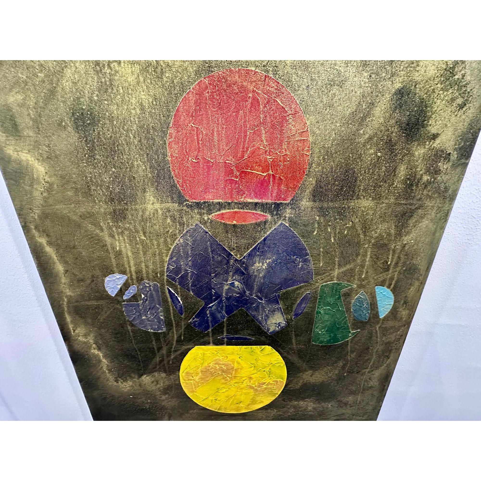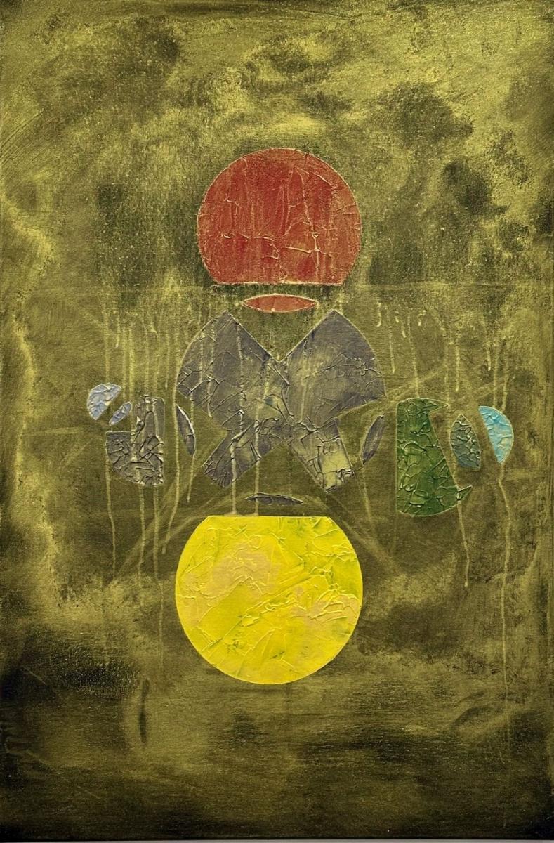 In questa opera costruisco una struttura visiva sospesa tra simbolo e frammento. Due forme circolari, poste in alto e in basso, evocano due poli energetici — due soli — tra i quali prende forma un sistema fragile di segni e geometrie.
